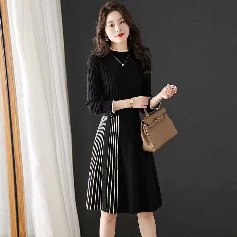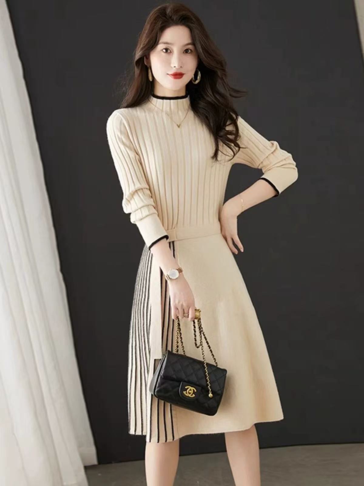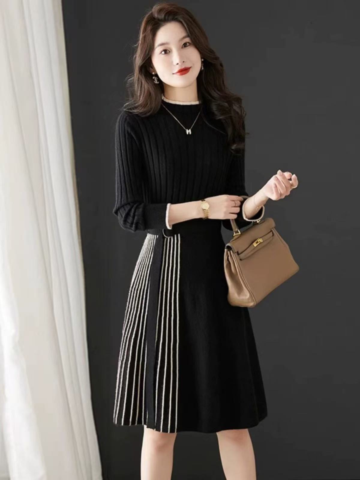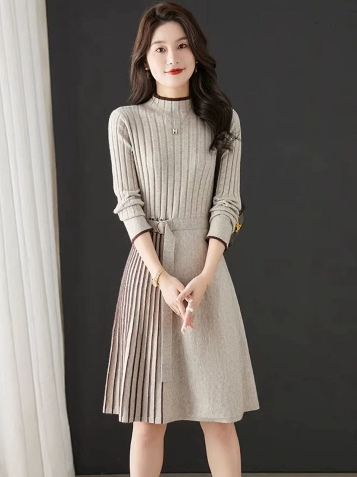 骨格ウェーブ サイドプリーツニットワンピース(ひざ丈)
