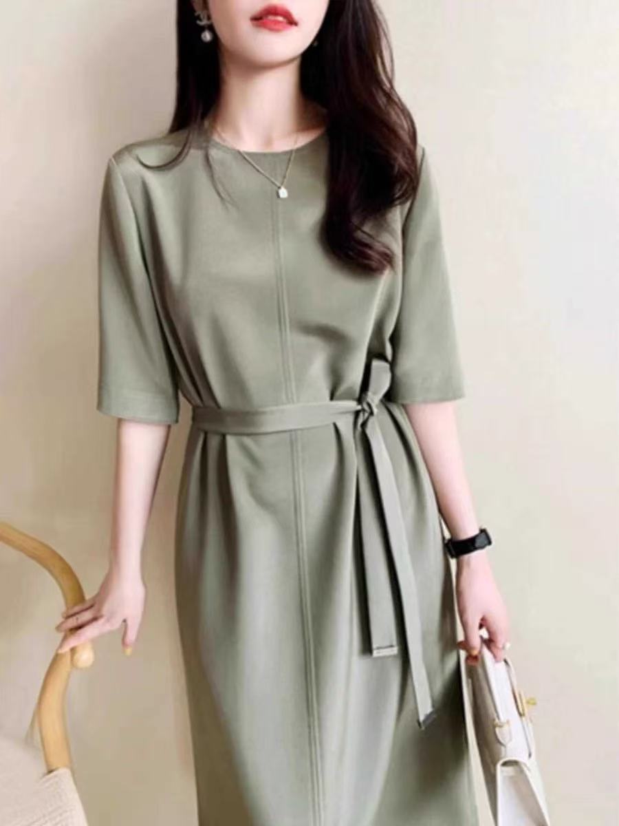 骨格ウェーブ ラウンドネック5分袖ウエストマークタイトワンピース