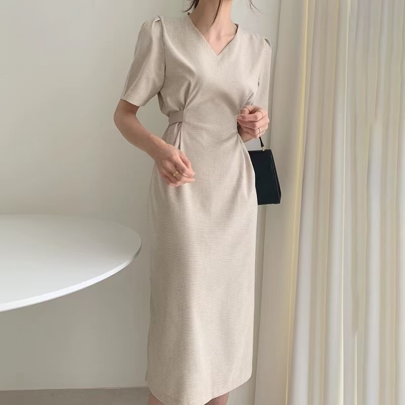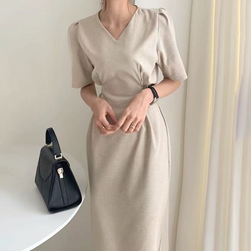 骨格ウェーブ Vネックパフスリーブタイトワンピース