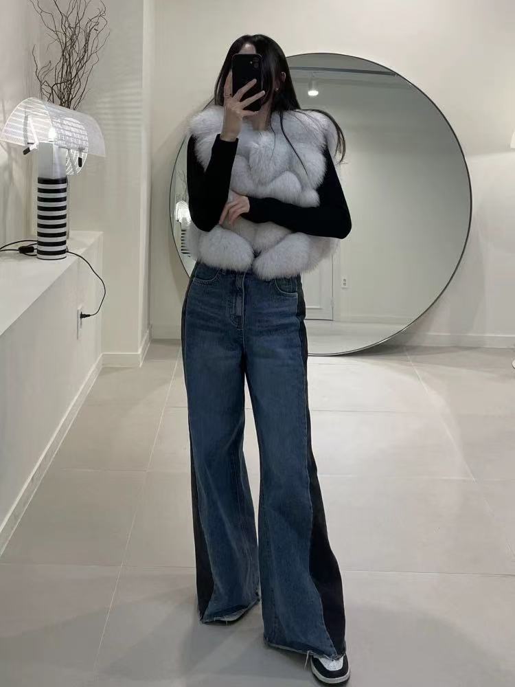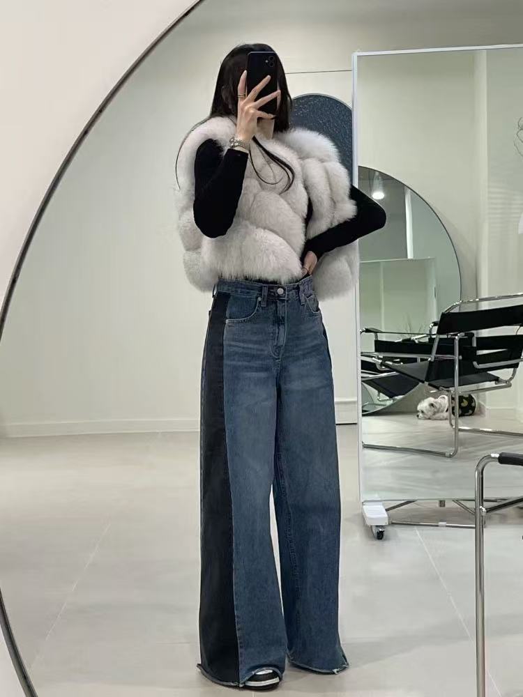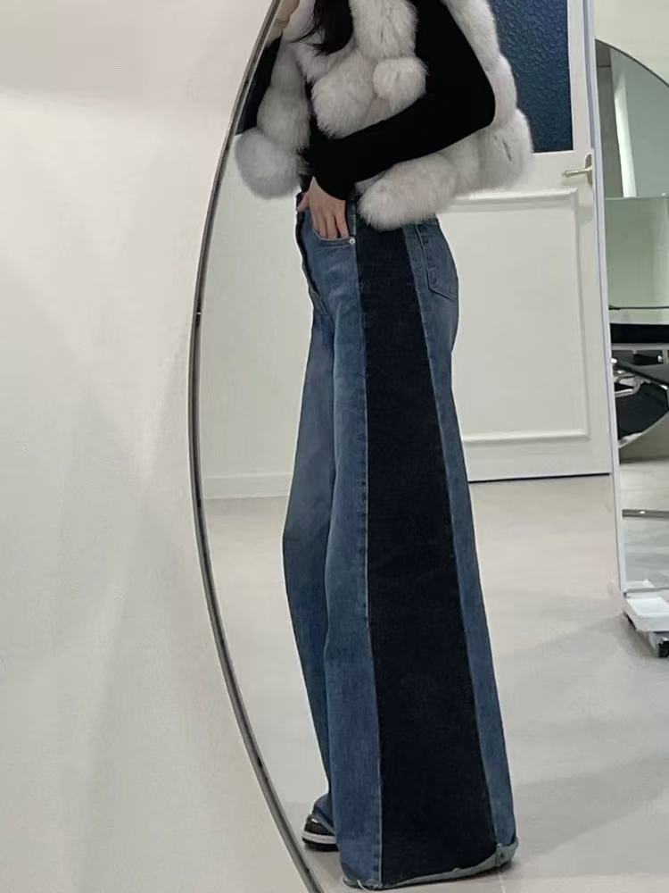 骨格ウェーブサイドコントラストカラーワイドレッグデニムパンツ