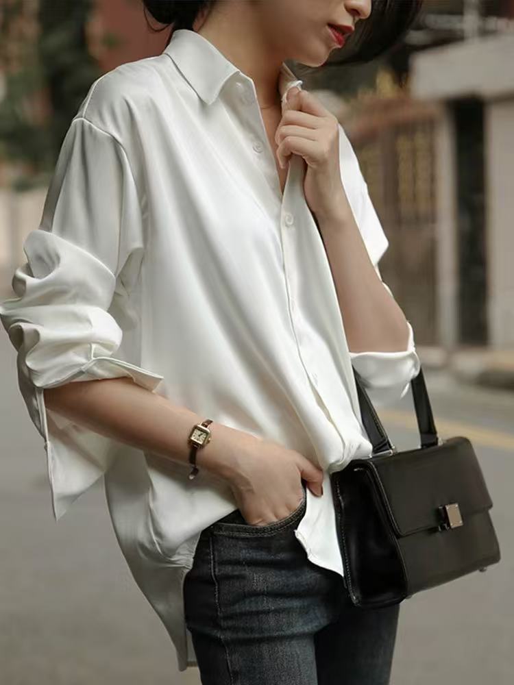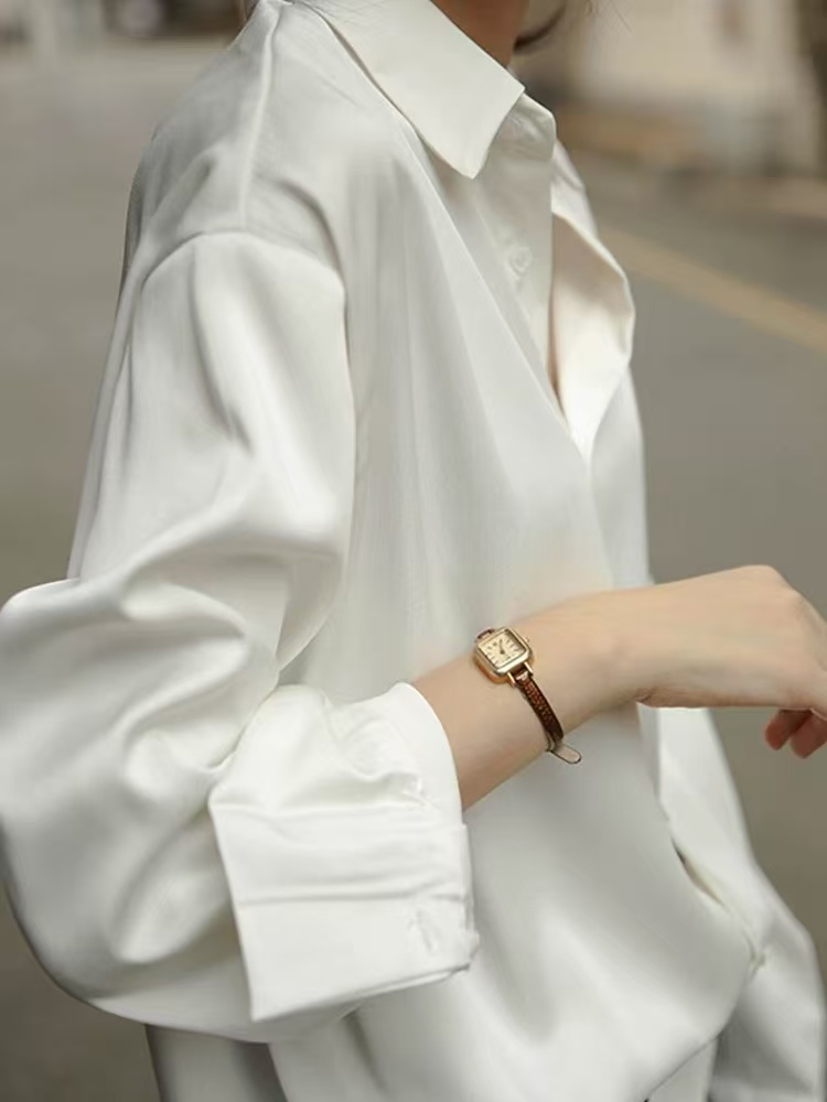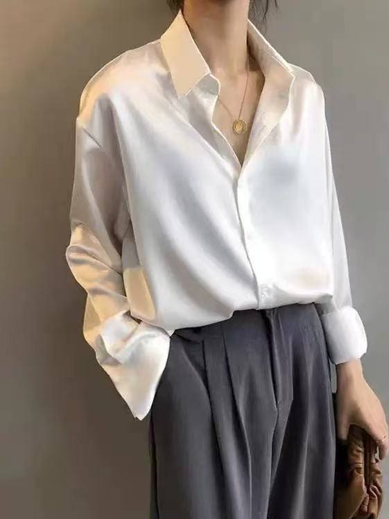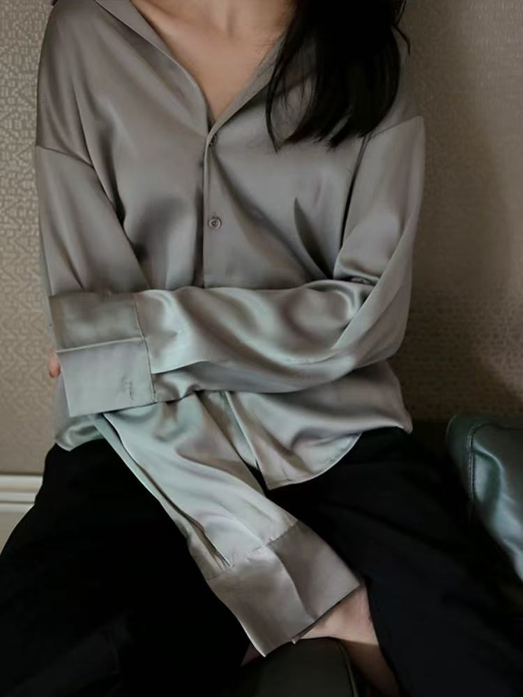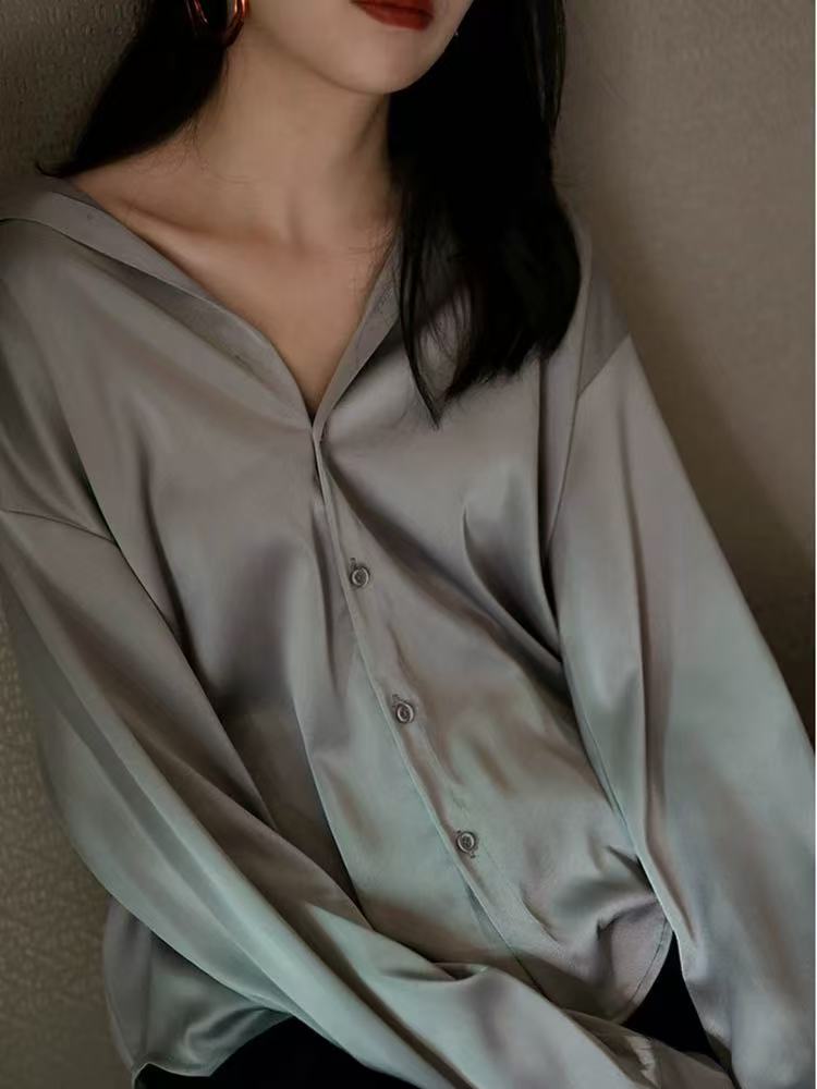 骨格ウェーブに似合うサテンブラウス。上品な光沢感が女性らしさを引き立て、軽やかで柔らかな素材が快適な着心地を実現します。エレガントさとカジュアルさを兼ね備え、日常から特別なお出かけまで幅広く活躍する一枚です。