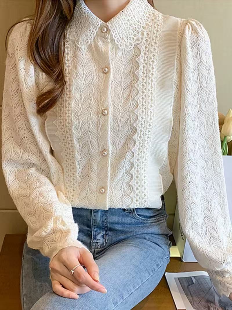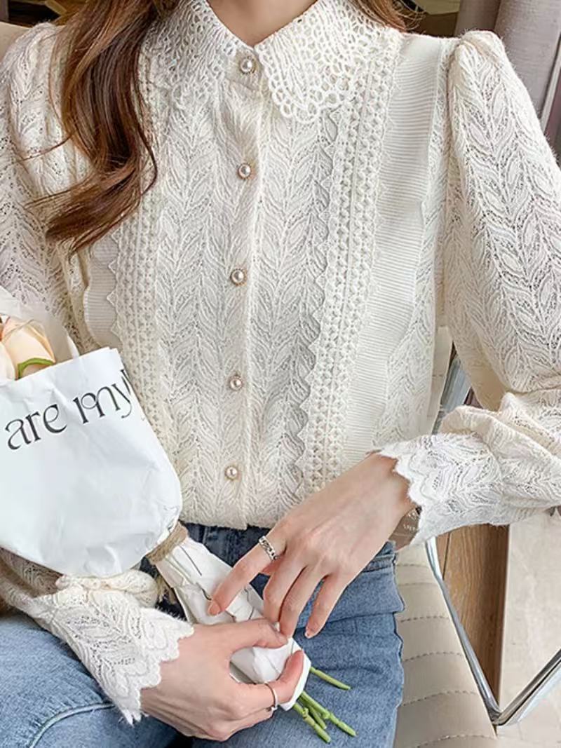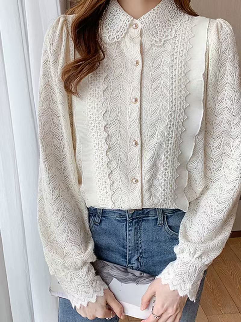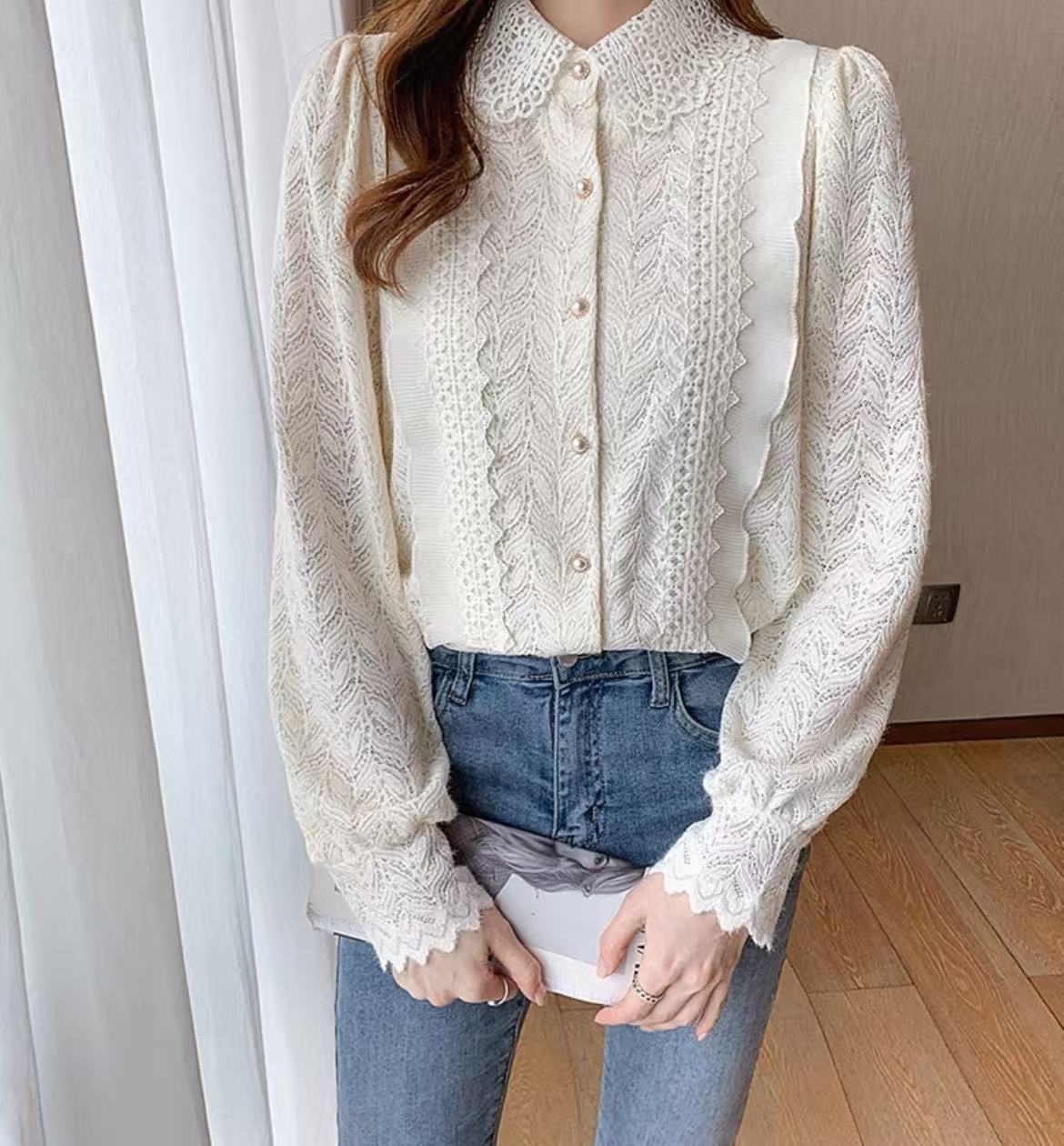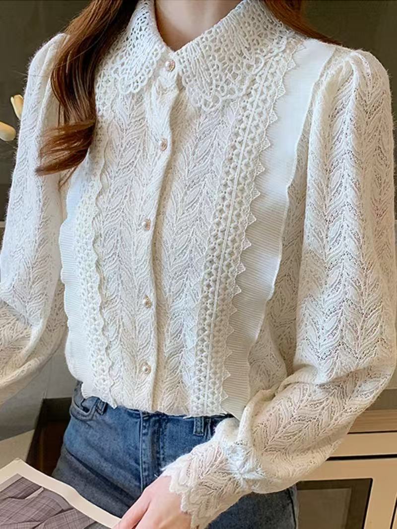 骨格ウェーブ レースディテール クラシックニットブラウス