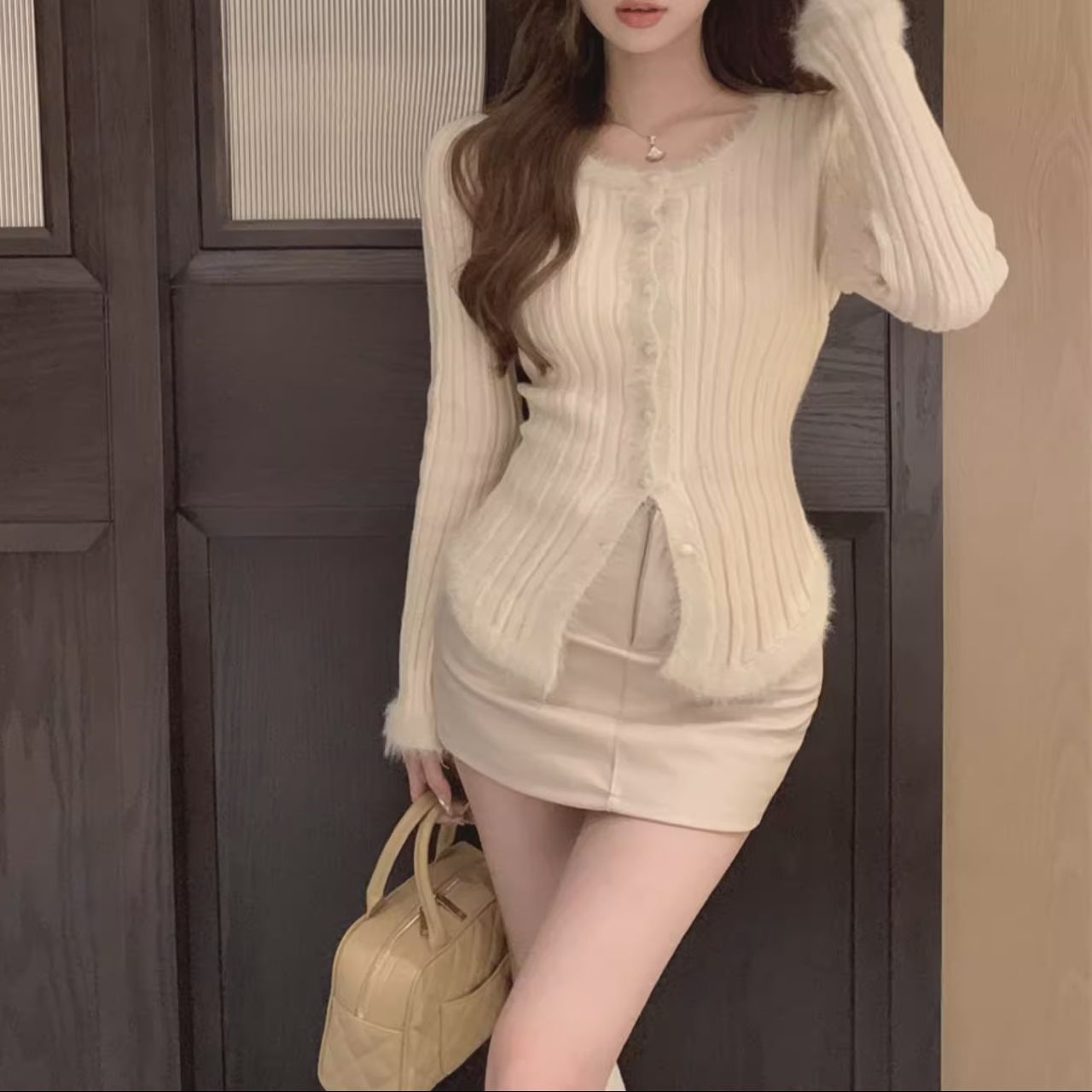 骨格ウェーブ ニット×フェザーカーディガン スリム見え