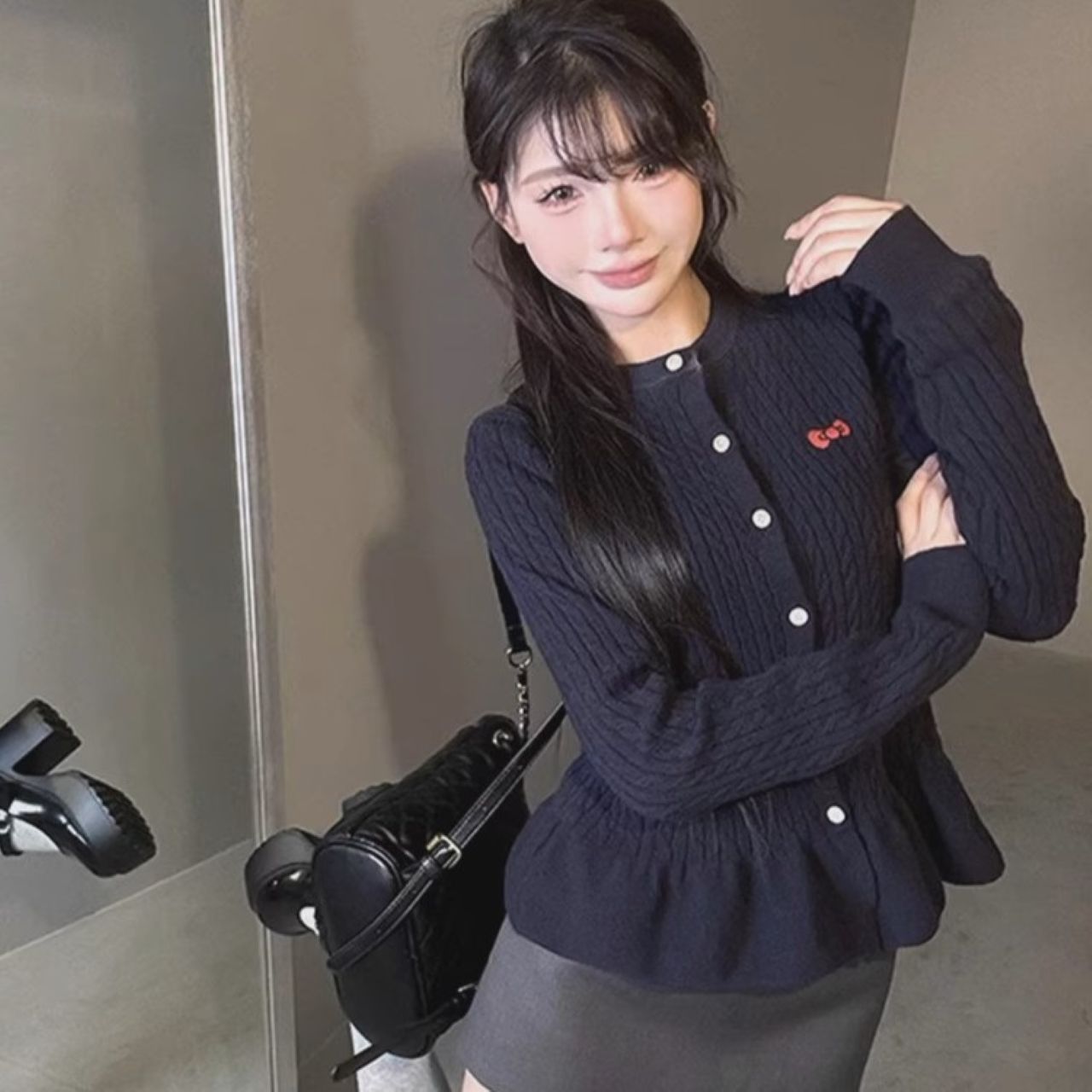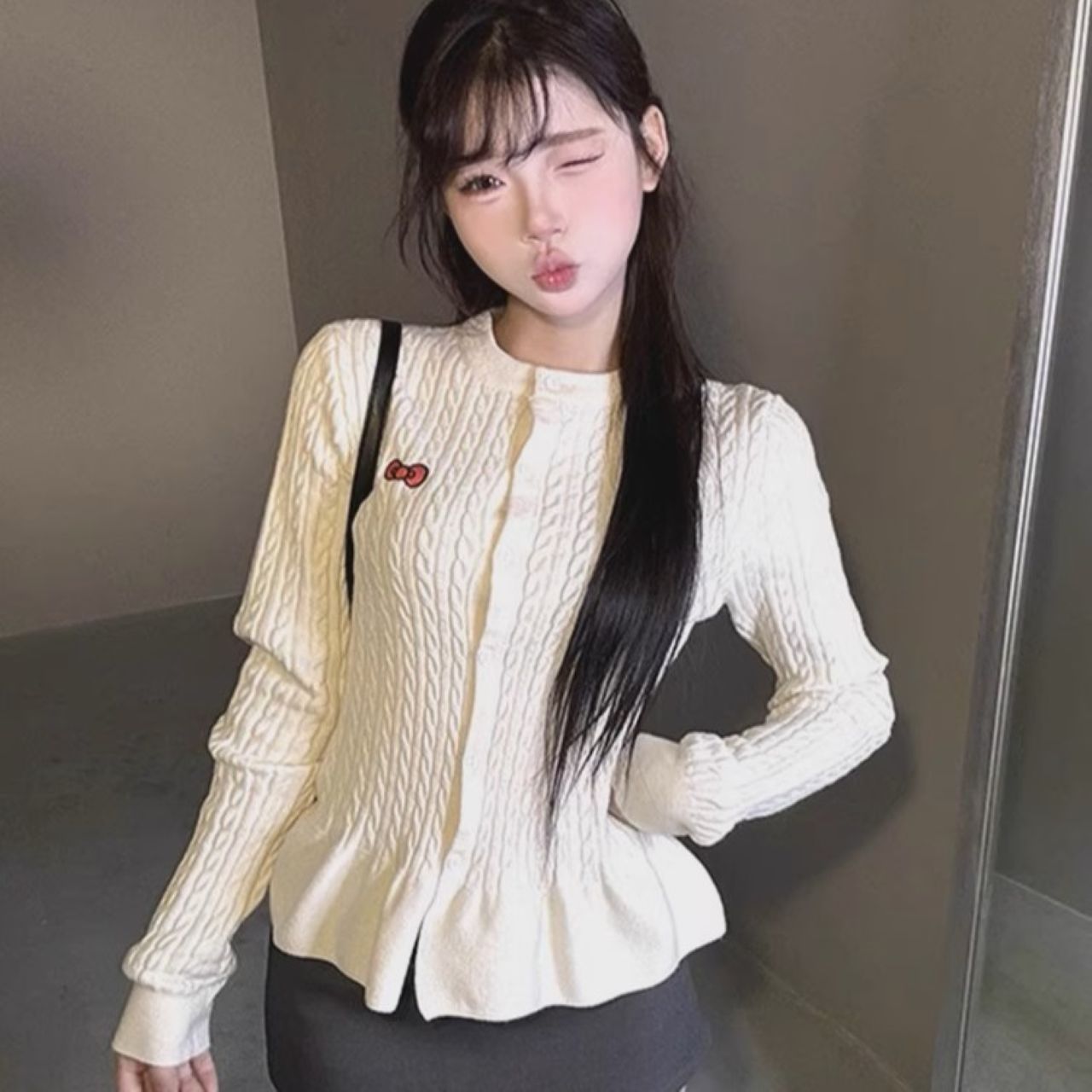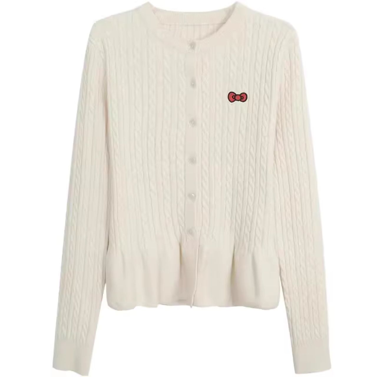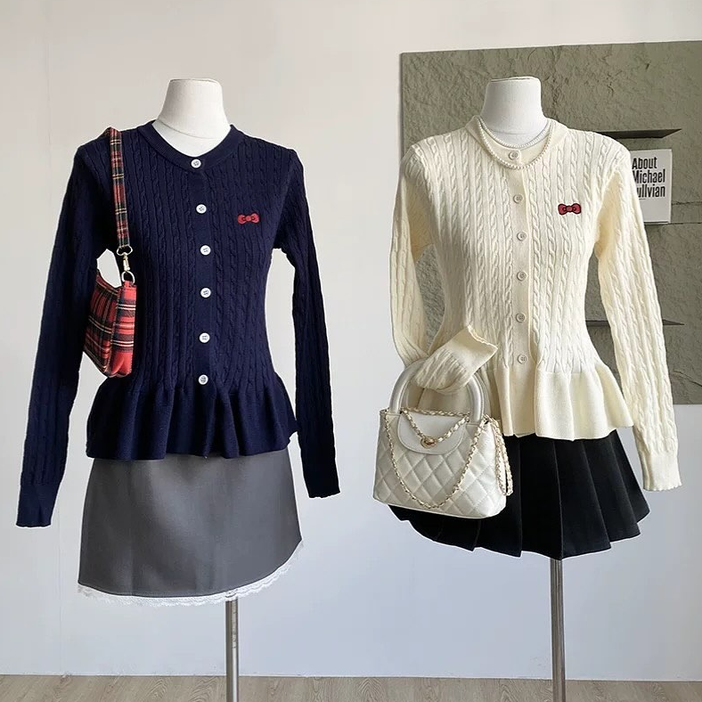 骨格ウェーブ リボンアクセント ペプラムニットカーディガン