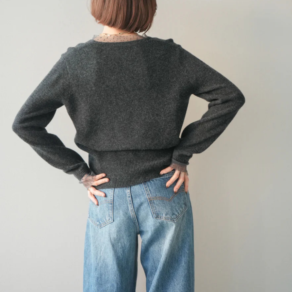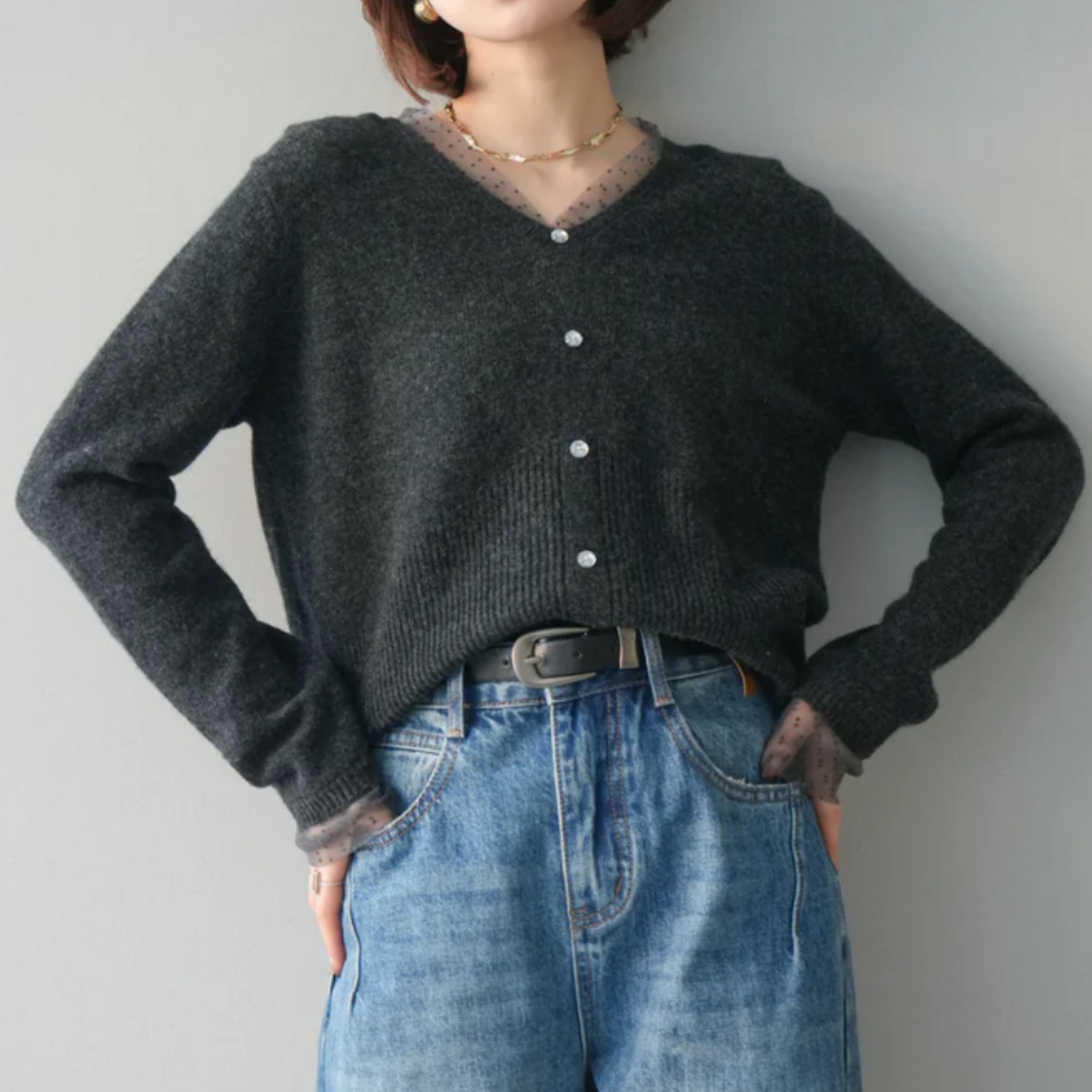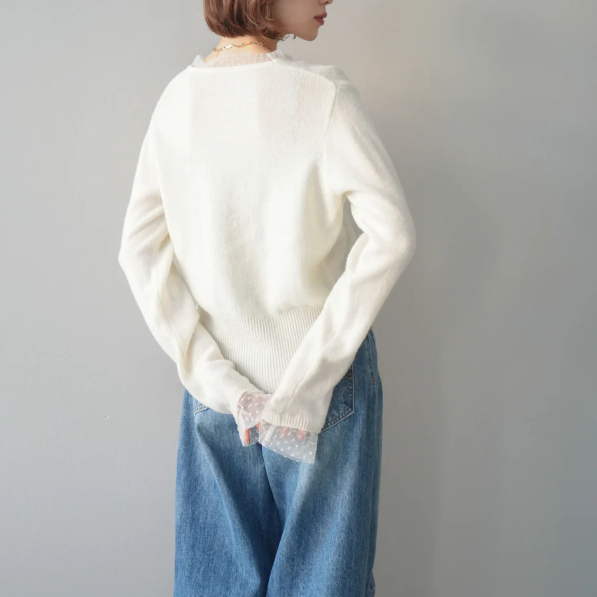 骨格ウェーブにぴったりな、繊細なドットチュールのレイヤードデザインが上品な華やかさを添えるニットトップス。 襟元と袖口のチュールが肩や腕周りをふんわりカバーし、華奢見せ効果を演出します。 ボタンで縦ラインを意識したすっきりシルエットに仕上げ、程よいゆとりで腰回りを隠しつつ品よく見せます。 柔らかく肌触りの良いニット素材で着心地も快適。 シンプルなボトムと合わせるだけで、骨格ウェーブの華やかさとバランス感を引き立てる一枚です。