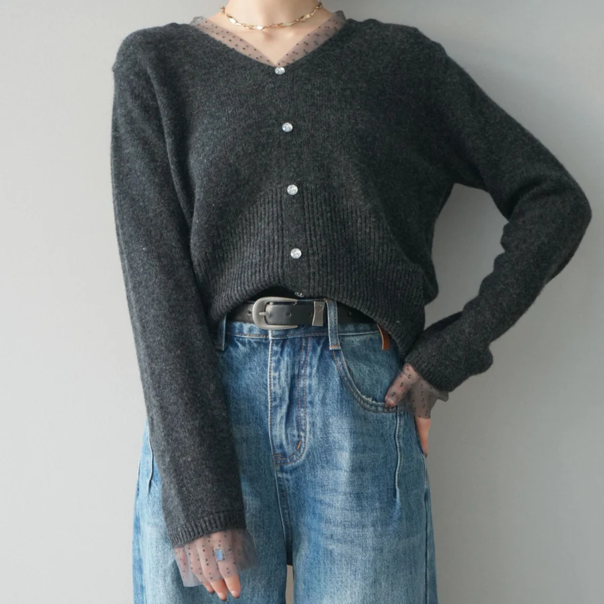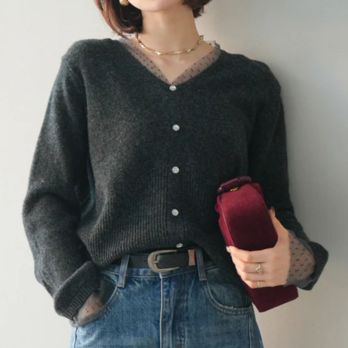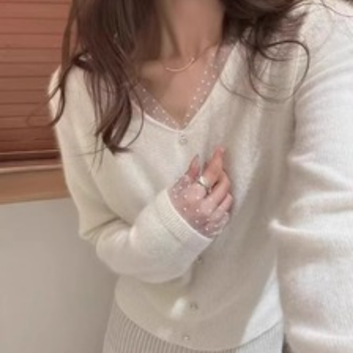 骨格ウェーブにぴったりな、繊細なドットチュールのレイヤードデザインが上品な華やかさを添えるニットトップス。 襟元と袖口のチュールが肩や腕周りをふんわりカバーし、華奢見せ効果を演出します。 ボタンで縦ラインを意識したすっきりシルエットに仕上げ、程よいゆとりで腰回りを隠しつつ品よく見せます。 柔らかく肌触りの良いニット素材で着心地も快適。 シンプルなボトムと合わせるだけで、骨格ウェーブの華やかさとバランス感を引き立てる一枚です。