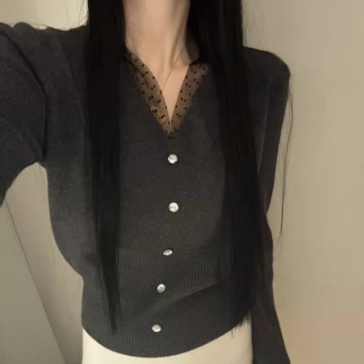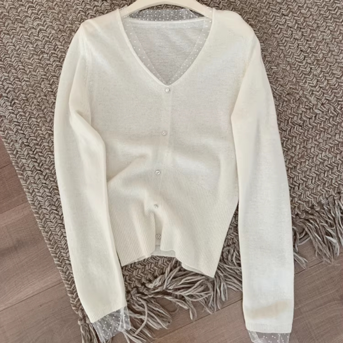 骨格ウェーブ ドットチュール 重ね着風ボタンニット