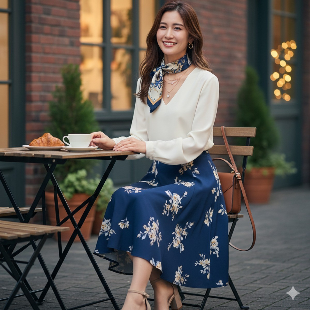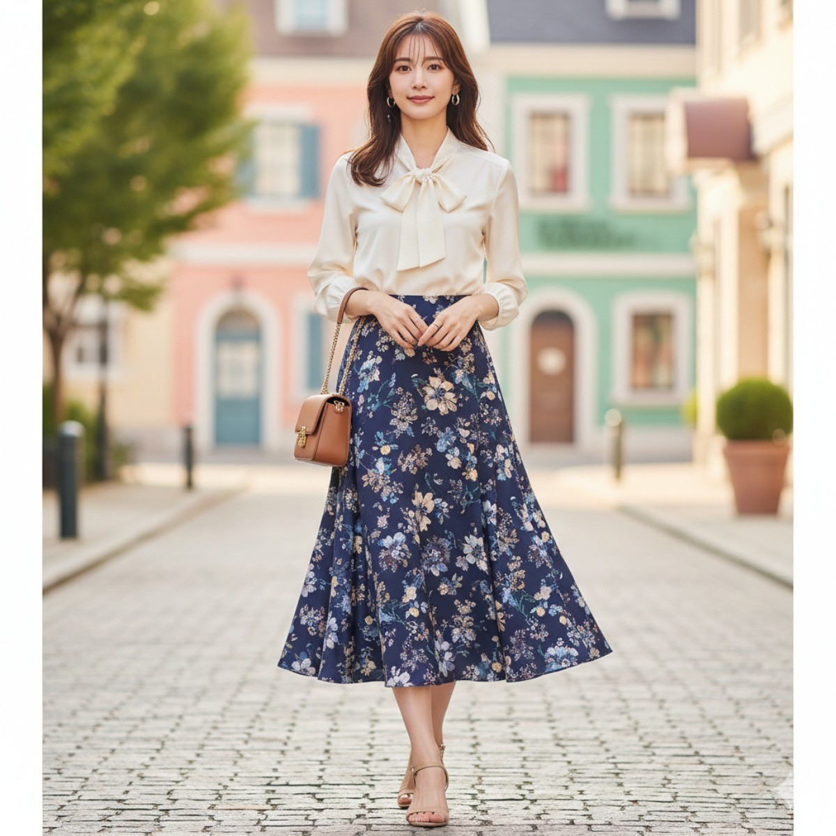 ボウタイブラウスやフリルブラウスを、フレアスカートと組み合わせるコーディネートは、骨格ウェーブの魅力を最も引き出します。