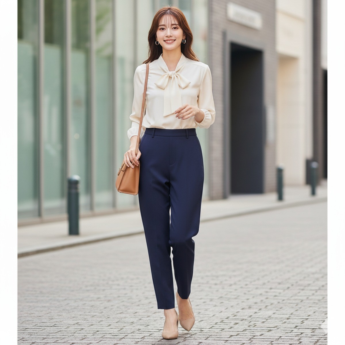 オフィスカジュアルでは、とろみ素材のブラウスとテーパードパンツの組み合わせがおすすめです。