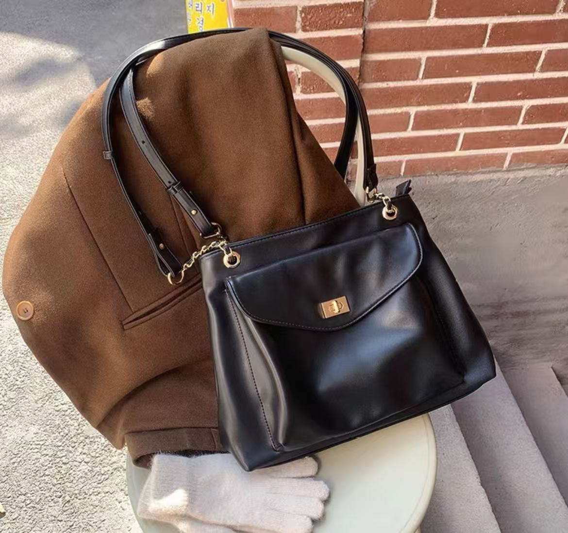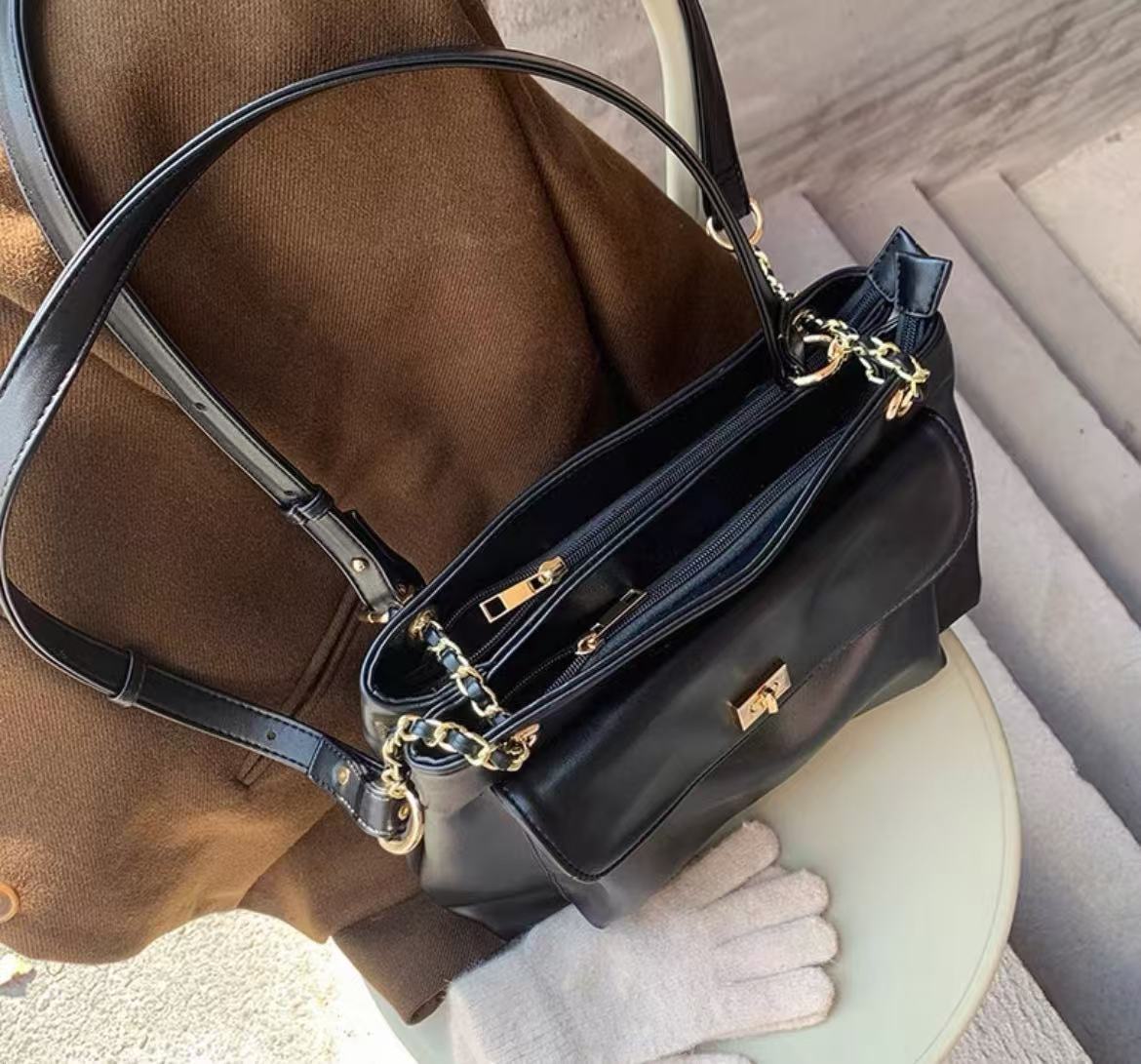 エレガントさと機能性を備えた一品。骨格ウェーブに映えるデザインで、流れるようなラインと上品なチェーンディテールが魅力です。調整可能なストラップにより、手持ち・肩掛け・斜め掛けと自在にアレンジ可能。デイリーから特別なお出かけまで幅広く活躍する万能バッグです。