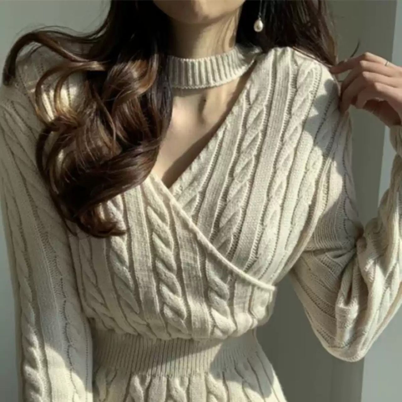 骨格ウェーブ 前後2WAY ケーブルニットワンピース
