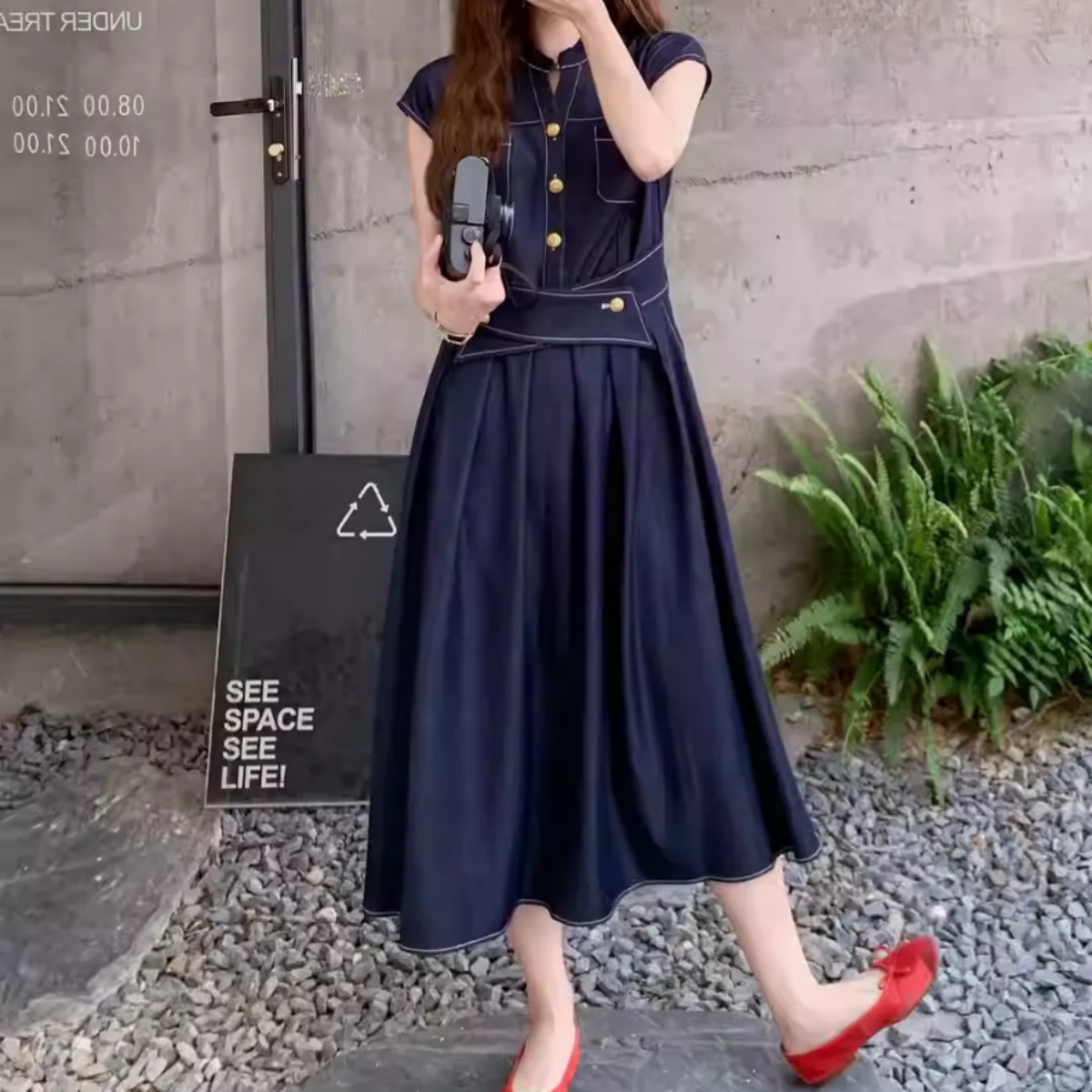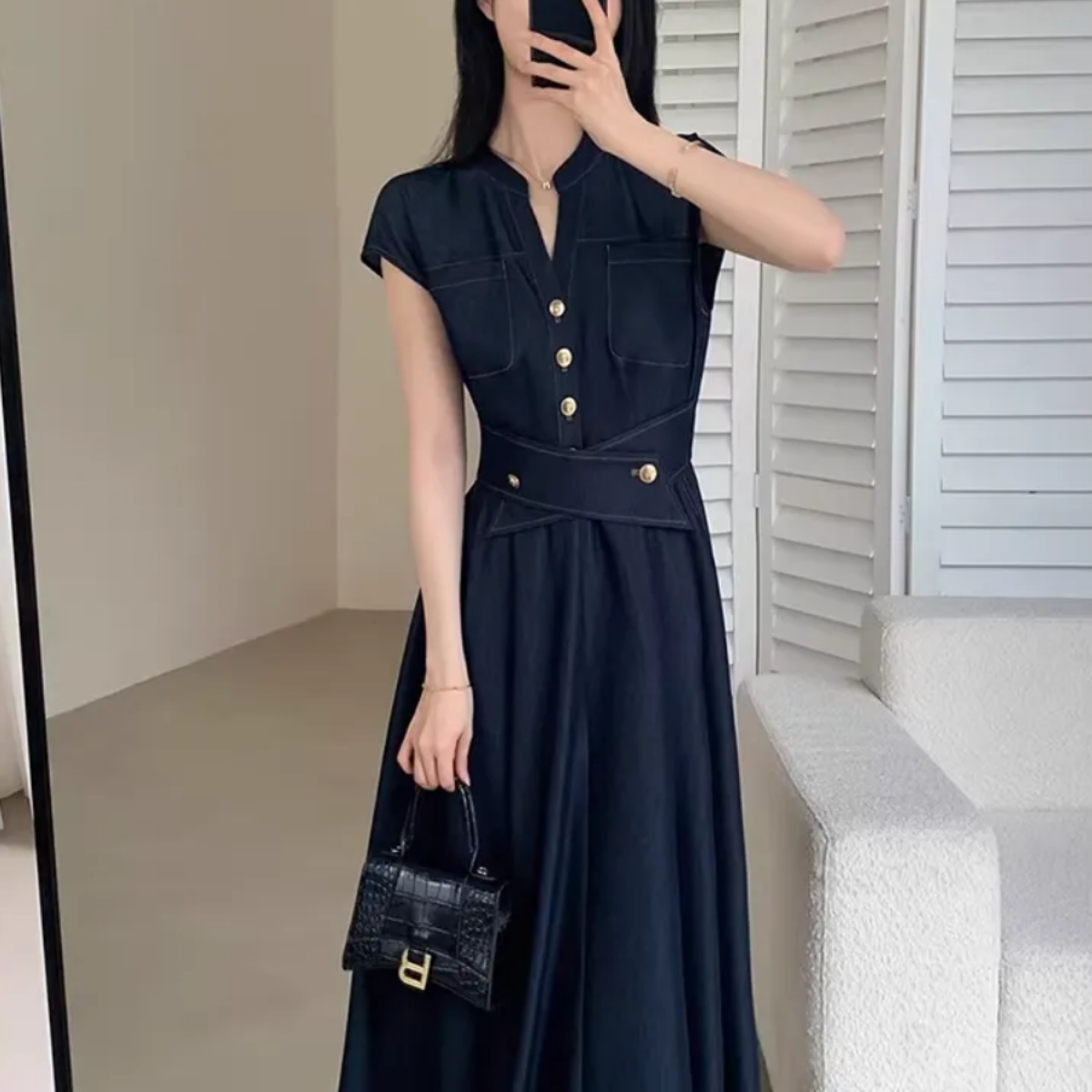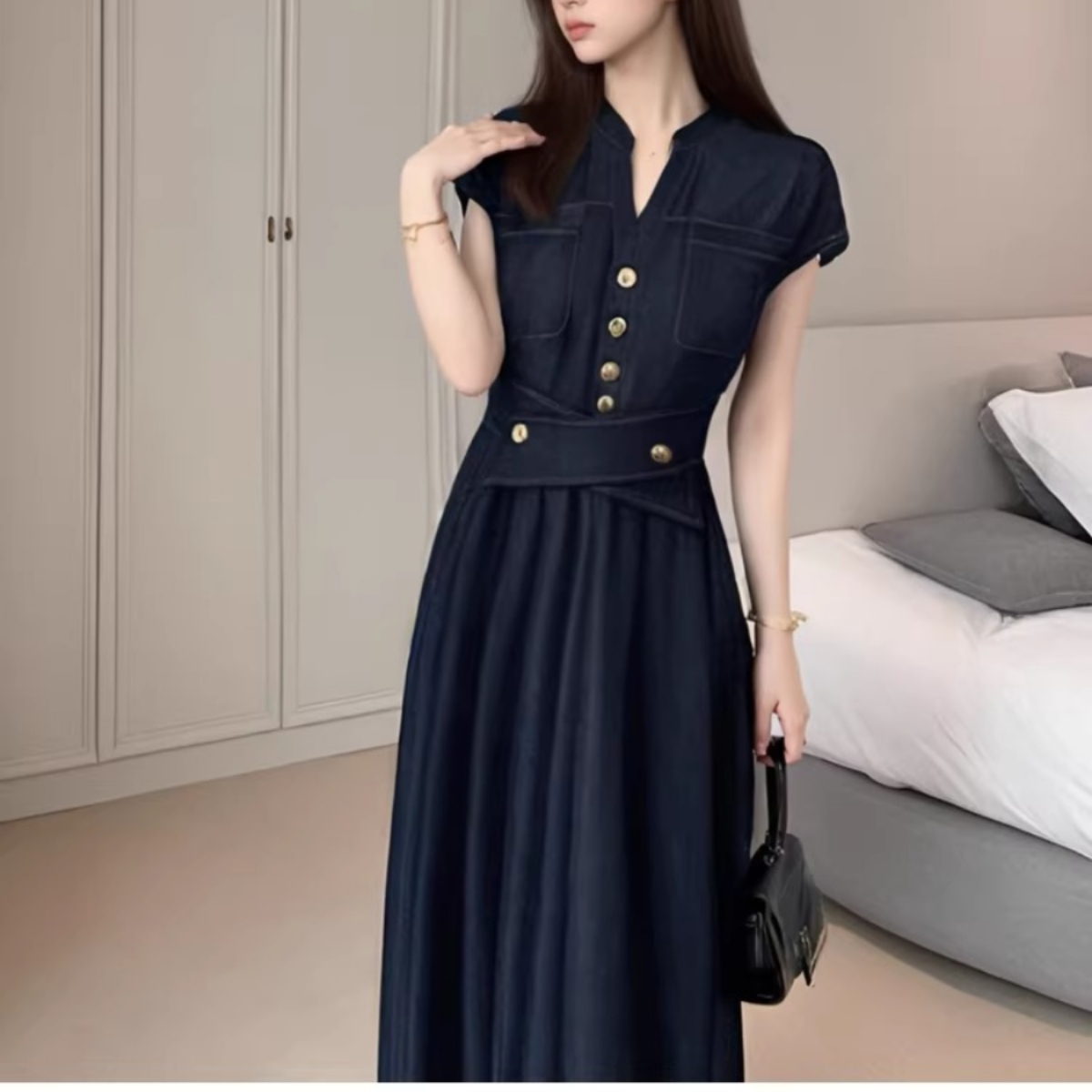 高めに設定された幅広のウエストマークが重心を引き上げ、自然な脚長効果を演出しながら、華奢なウエストラインを美しく引き立てます。