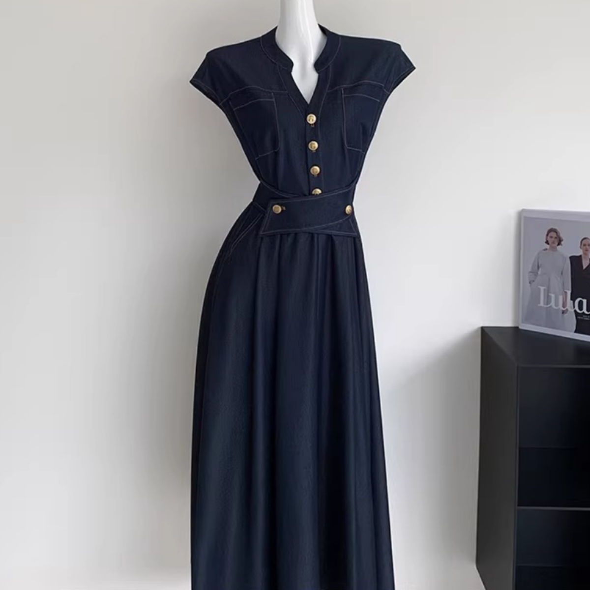 ゴールドボタンが上品なアクセントとなり、シンプルながら華やかさもプラス。