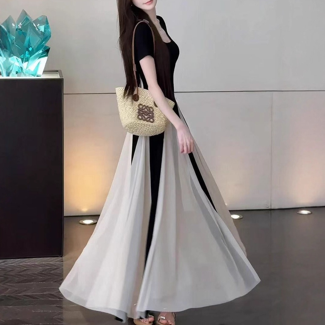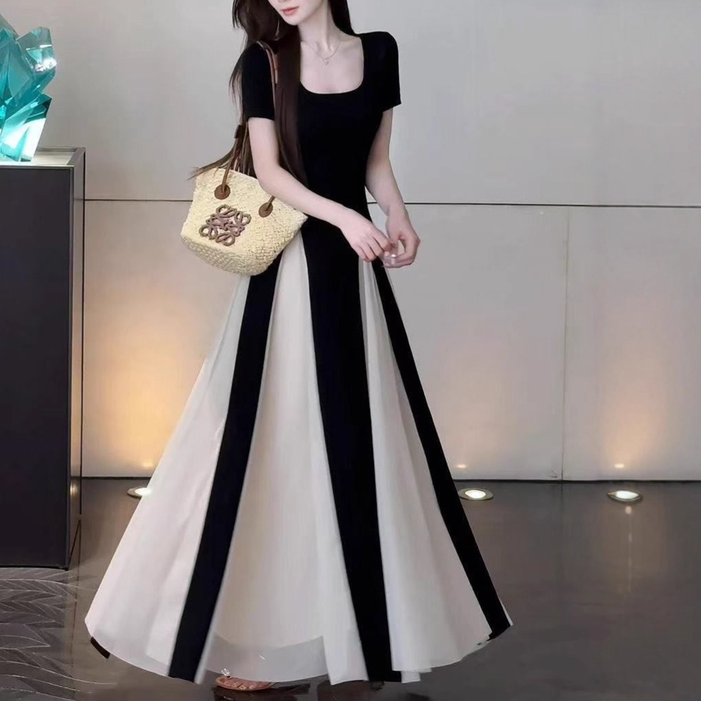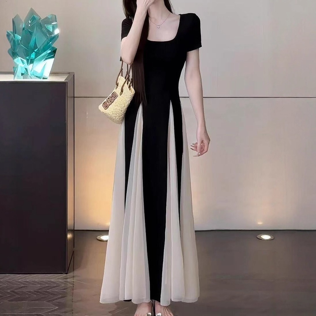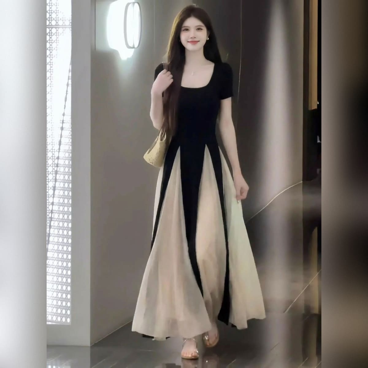 華奢な上半身を引き立てるスクエアネックと、高め位置のバイカラー切り替えが視線を上へ導き、自然と脚長シルエットを演出。