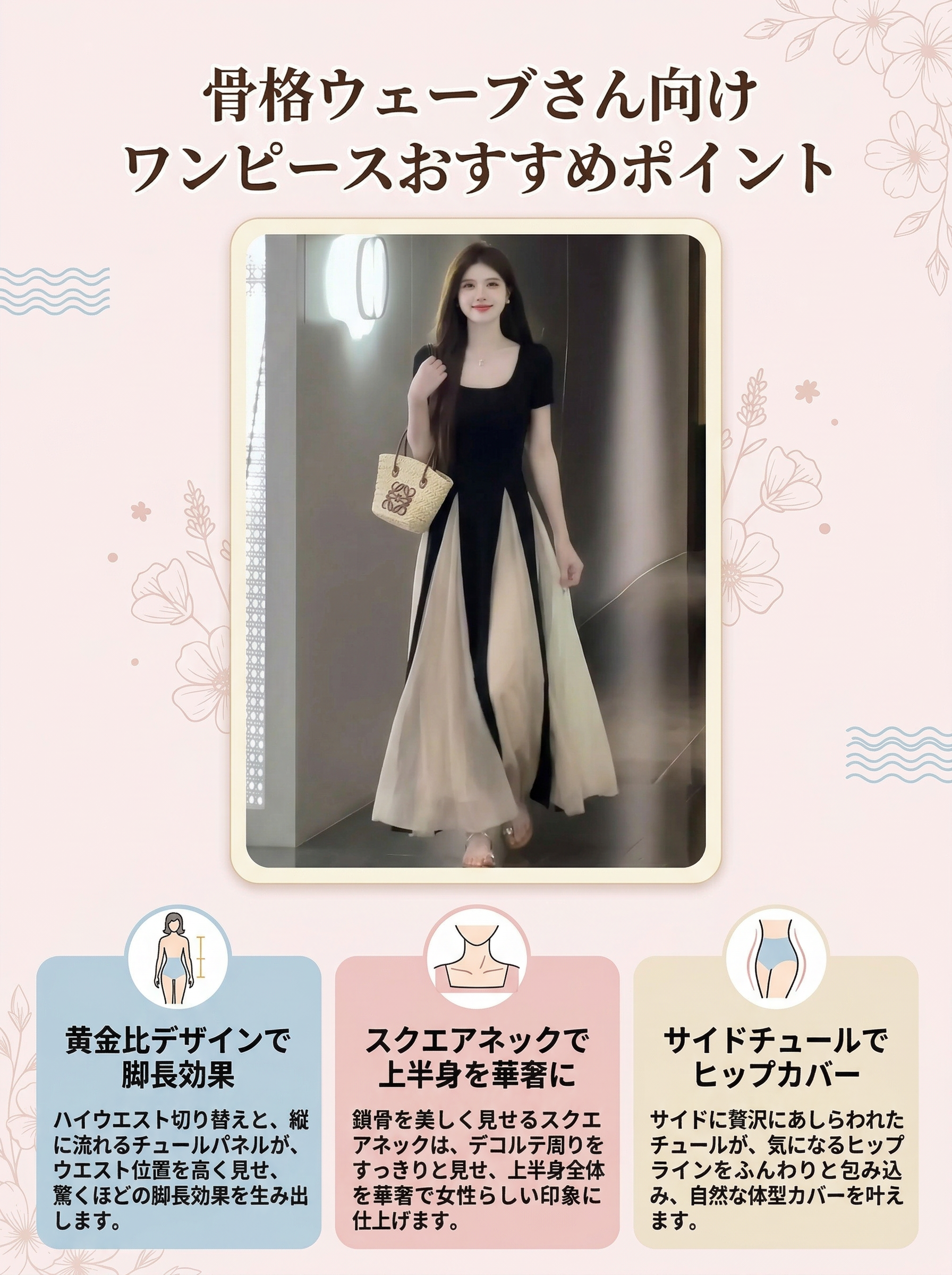 骨格ウェーブさんのための黄金比バイカラー・シフォンフレアワンピース。
