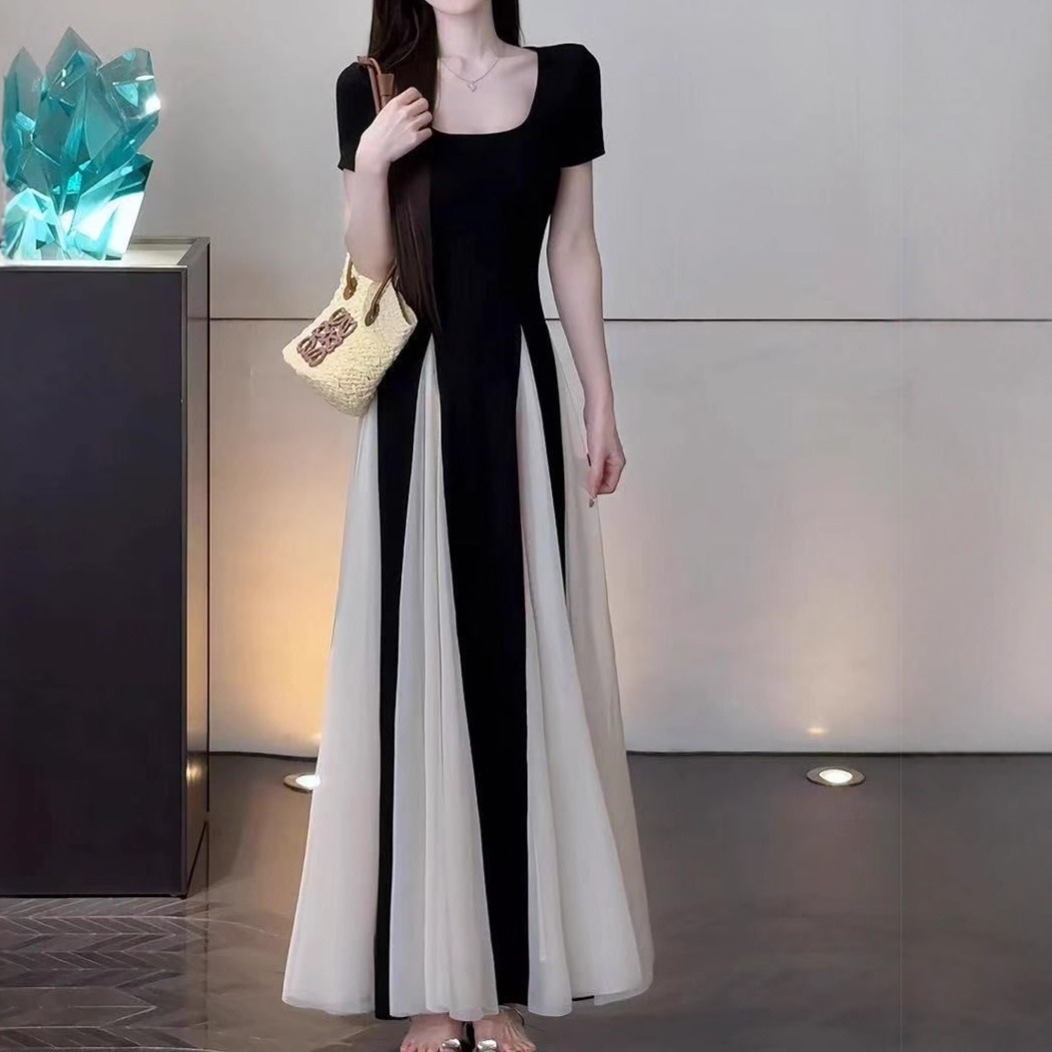 骨格ウェーブ ドラマチック チュール切り替え 半袖ロングワンピース