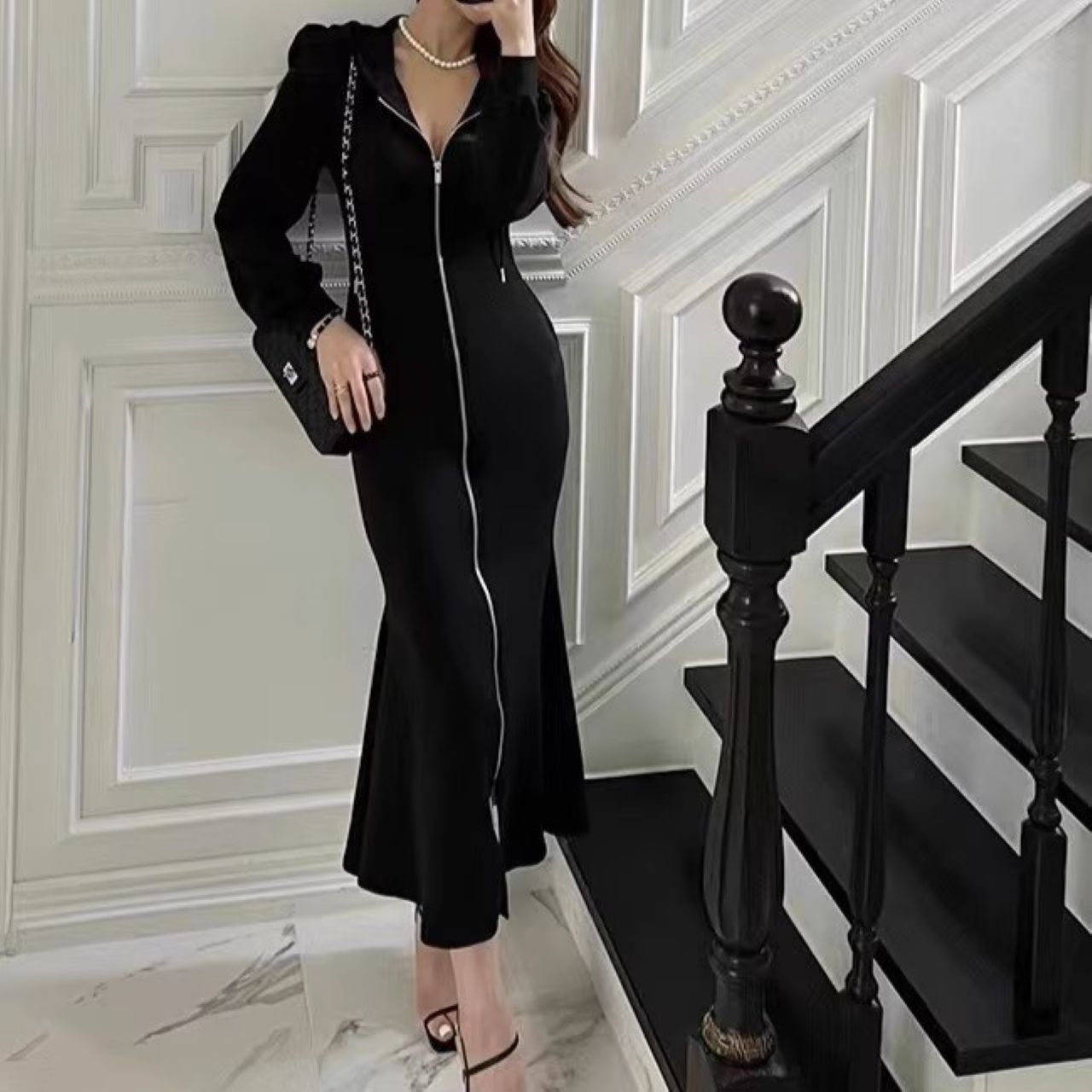 骨格ウェーブ マーメイド長袖ワンピース ジップアップ ロング丈