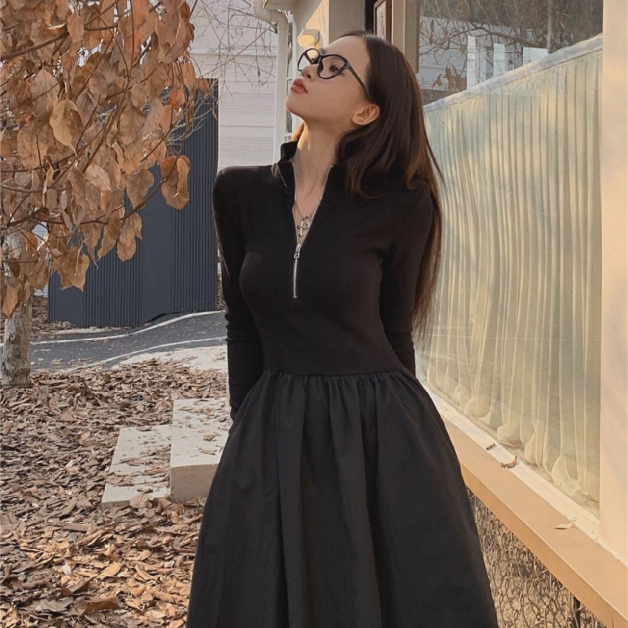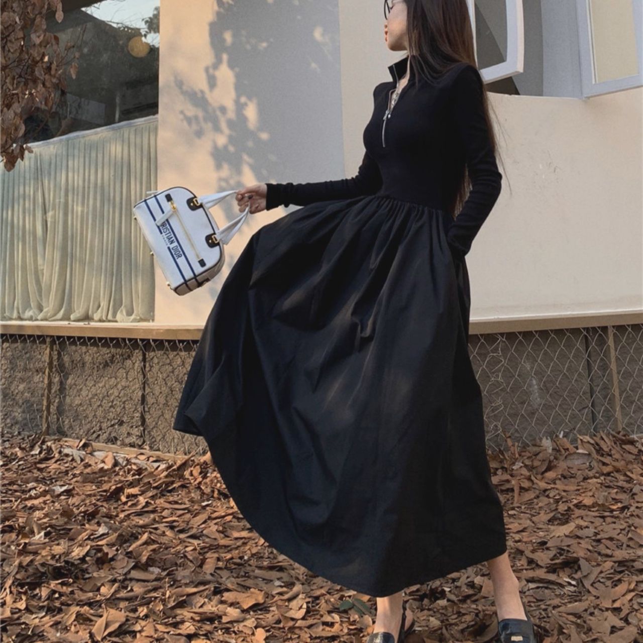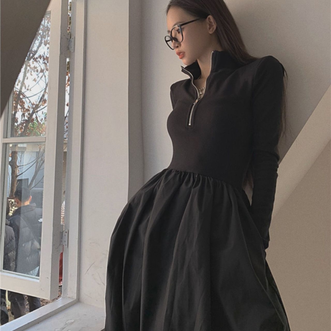 骨格ウェーブ ハーフジップ 切り替えロングワンピース