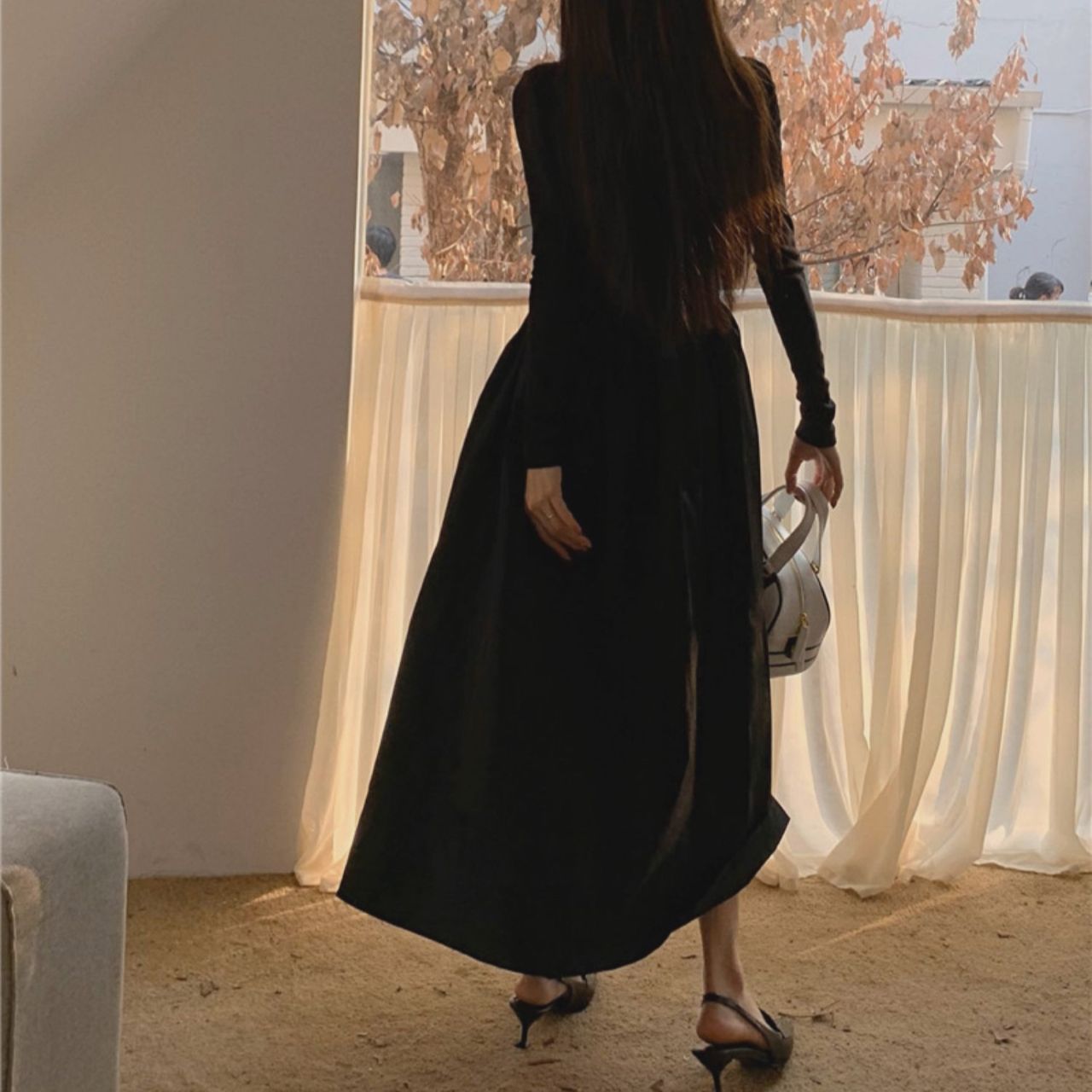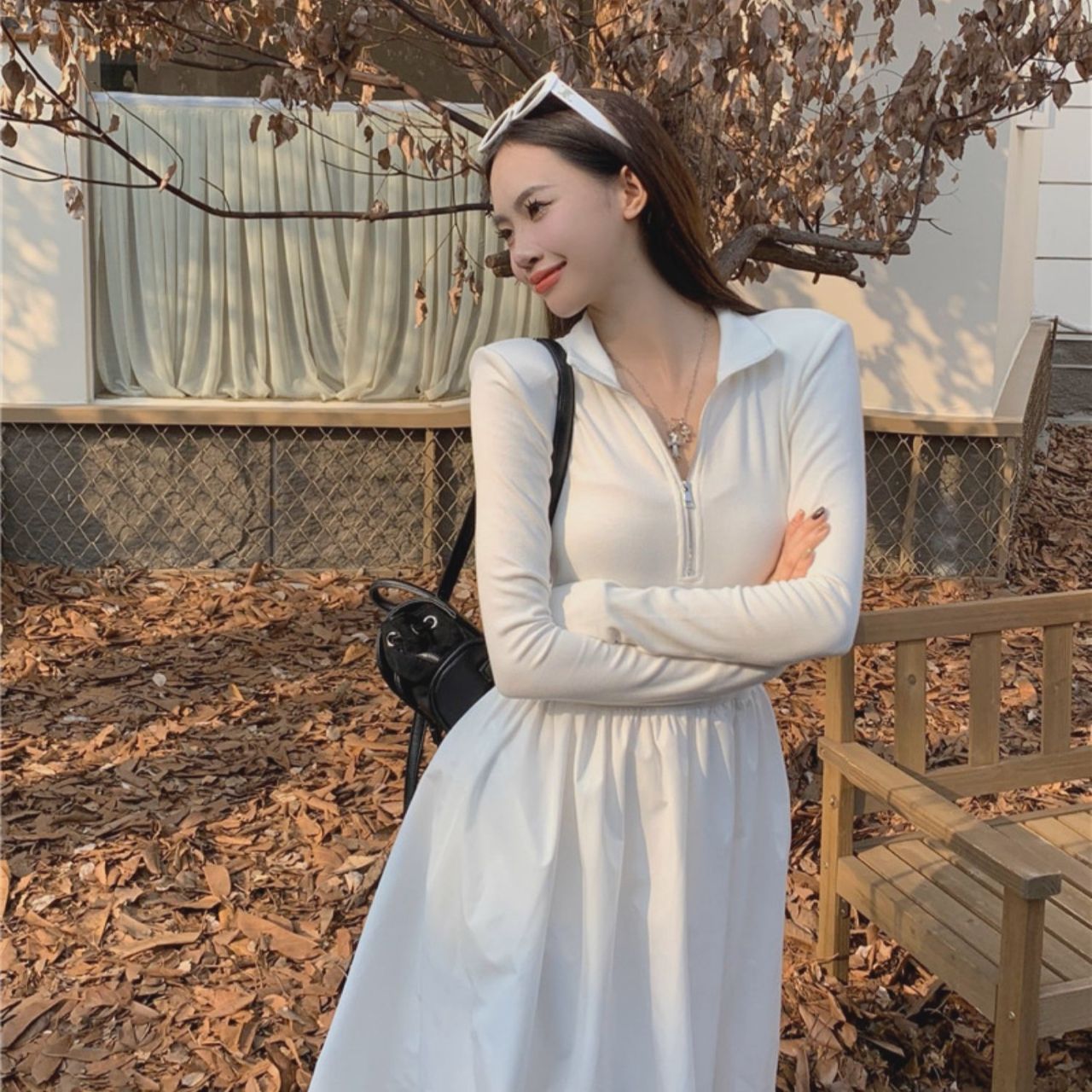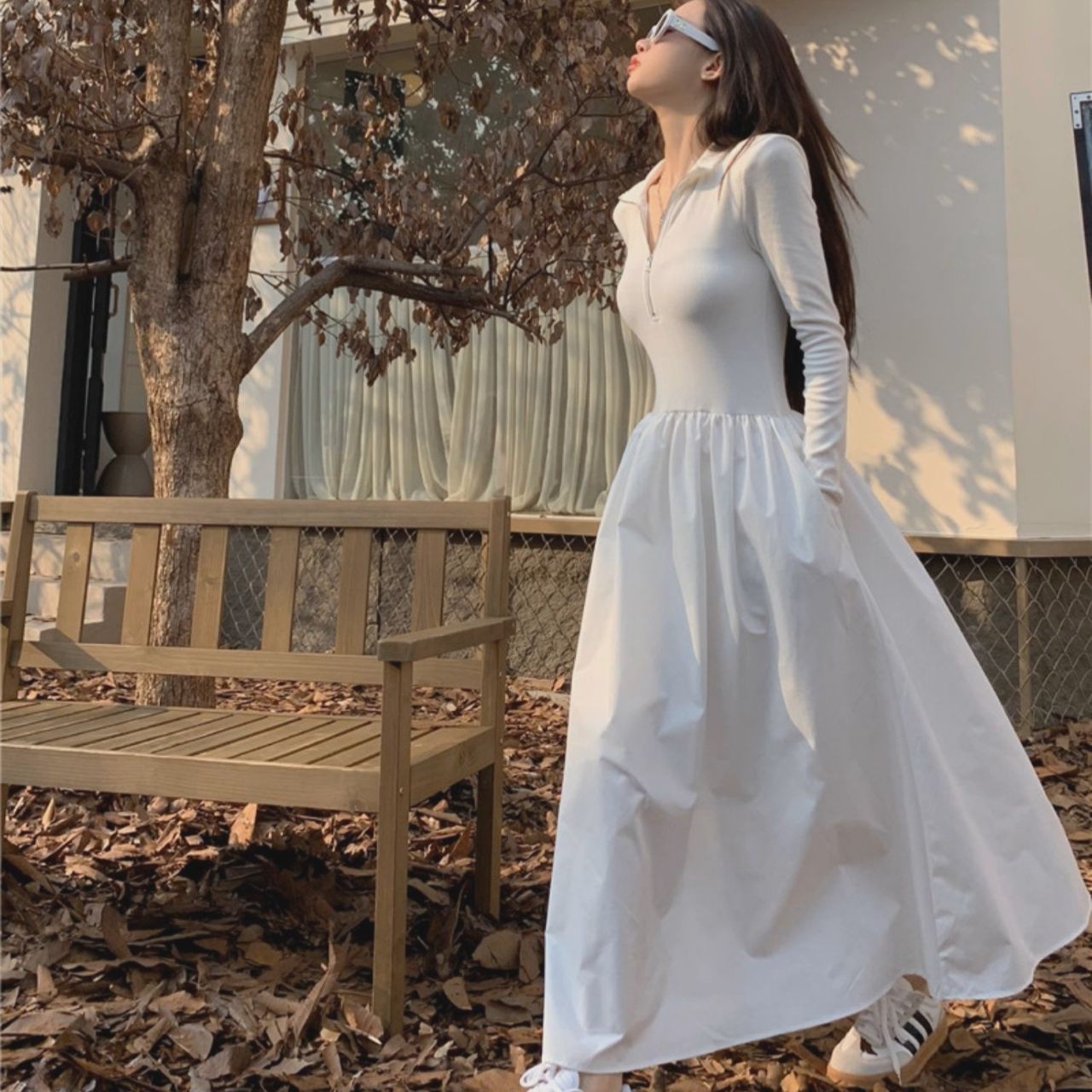 骨格ウェーブ ハーフジップ 切り替えロングワンピース