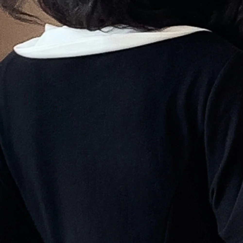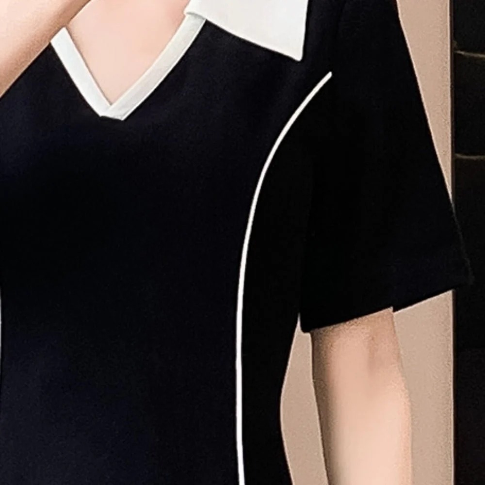 コントラストの効いた襟デザインが顔まわりを明るく引き立て、上品で知的な印象へと導きます。