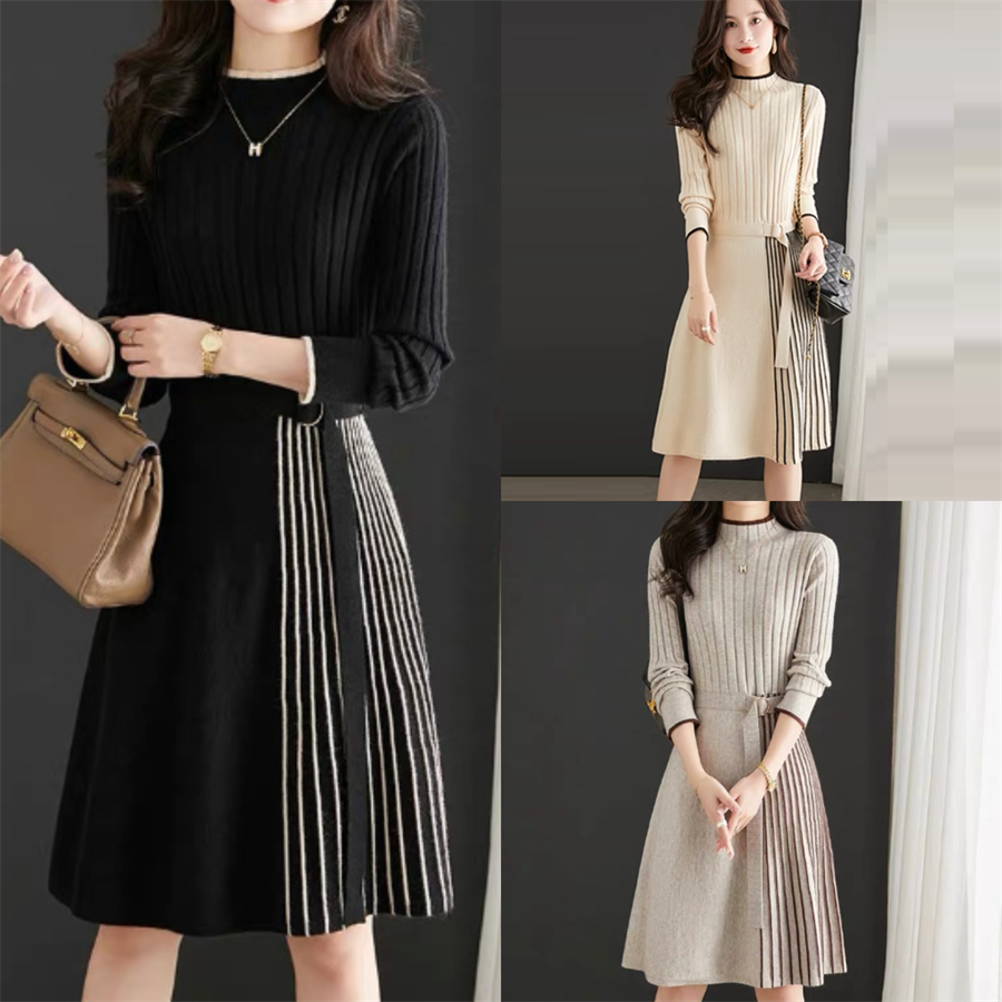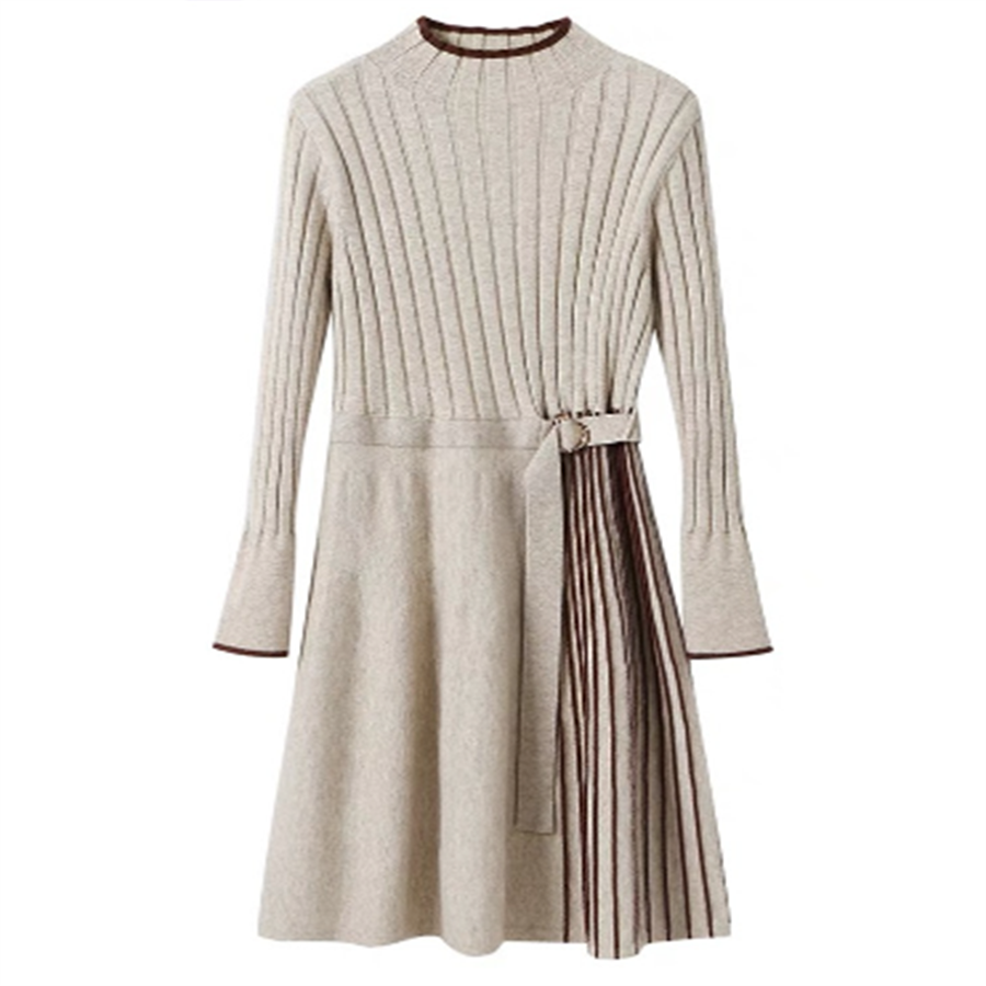 骨格ウェーブ サイドプリーツニットワンピース(ひざ丈)