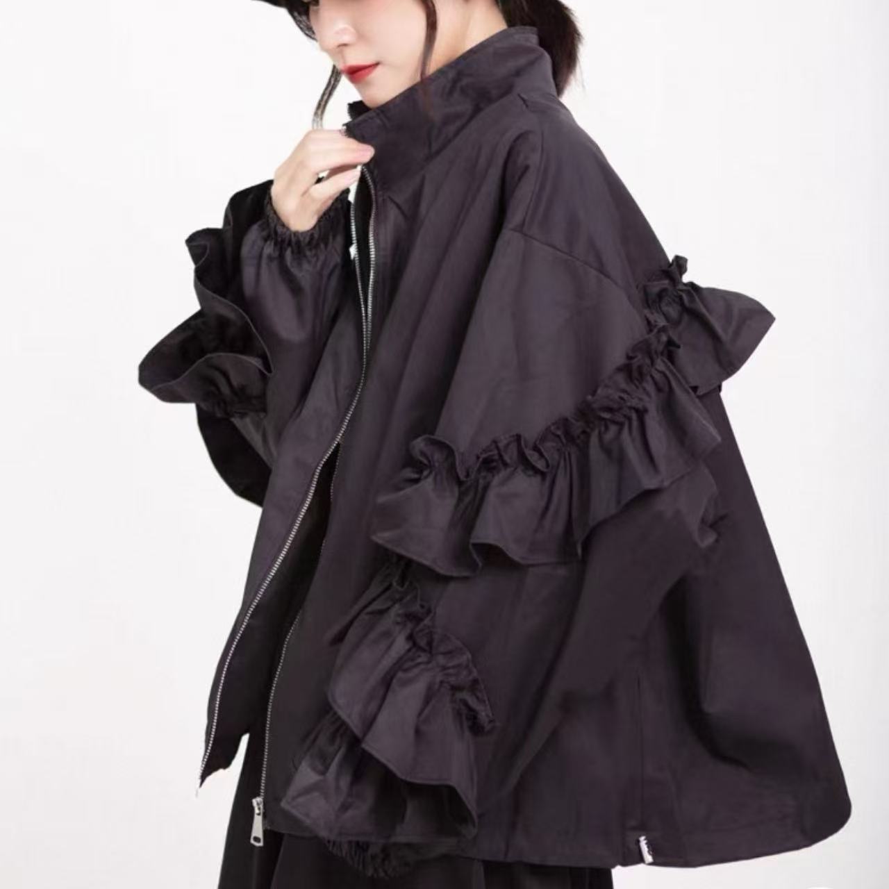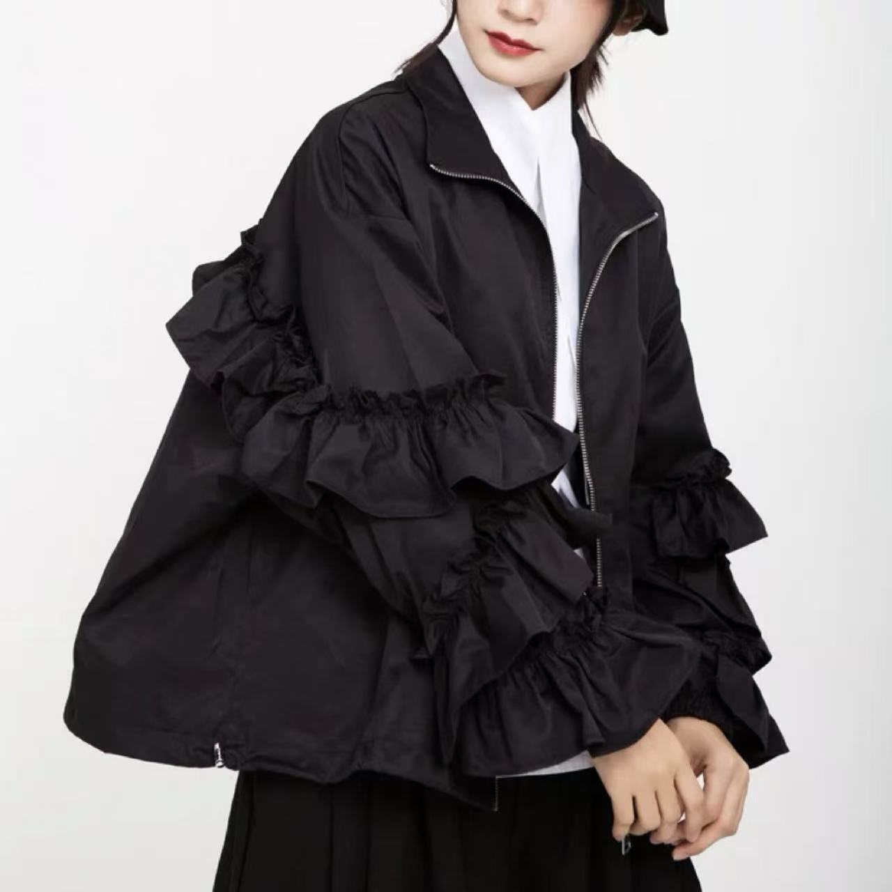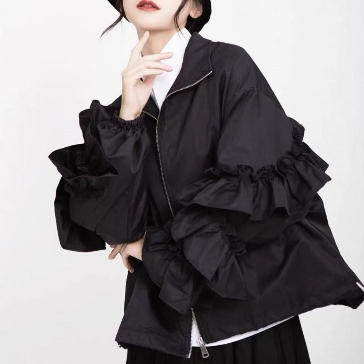 2025年早春新作、山本風ダークモード系ライトジャケット。軽やかな薄手素材で、防風性もありながら快適な着心地を実現。特徴的な木耳フリルとパフスリーブが個性的なシルエットを演出し、ストリート感と女性らしさを絶妙に融合。ジップアップ仕様で着脱も便利。シンプルなボトムと合わせるだけで、トレンド感のあるおしゃれコーデが完成します。