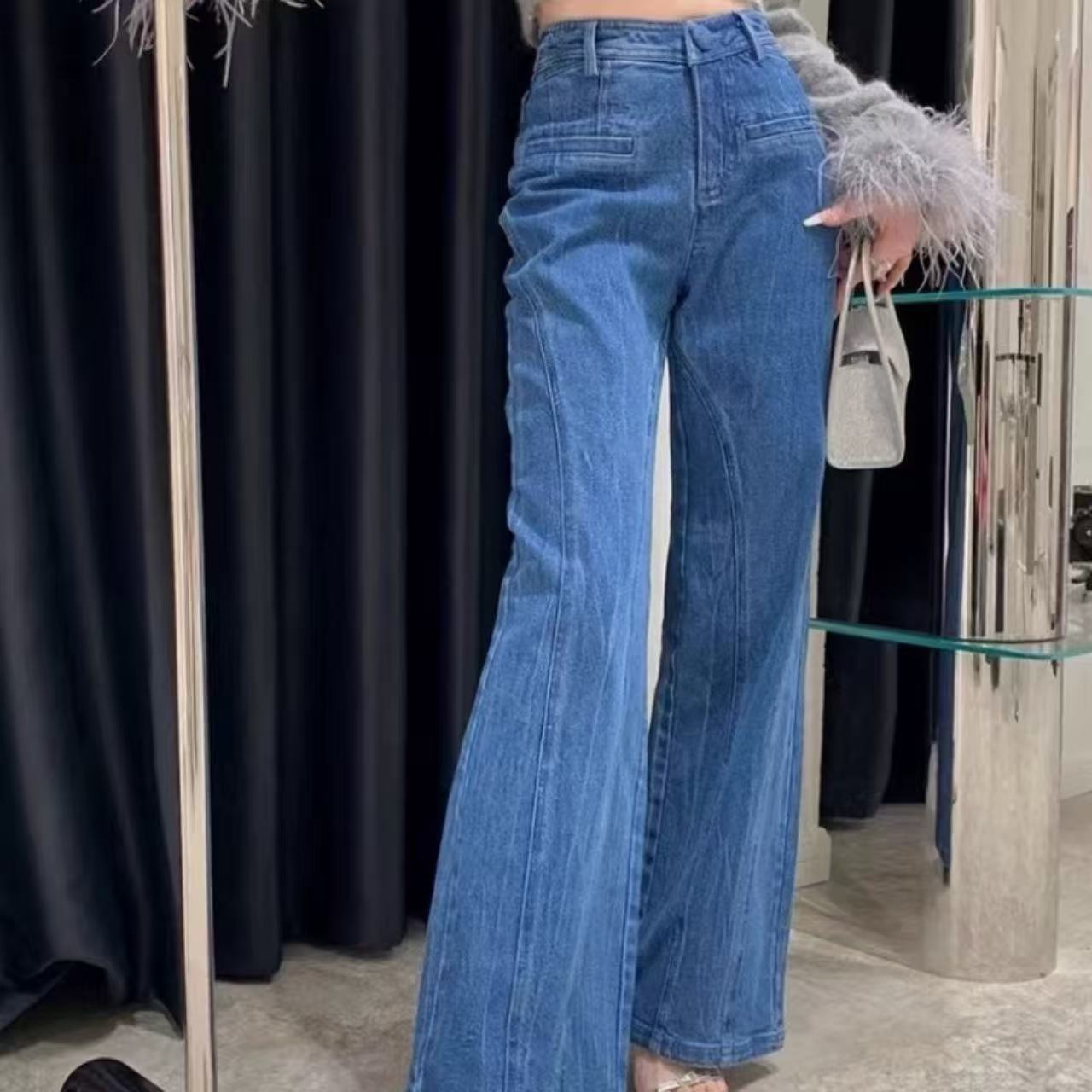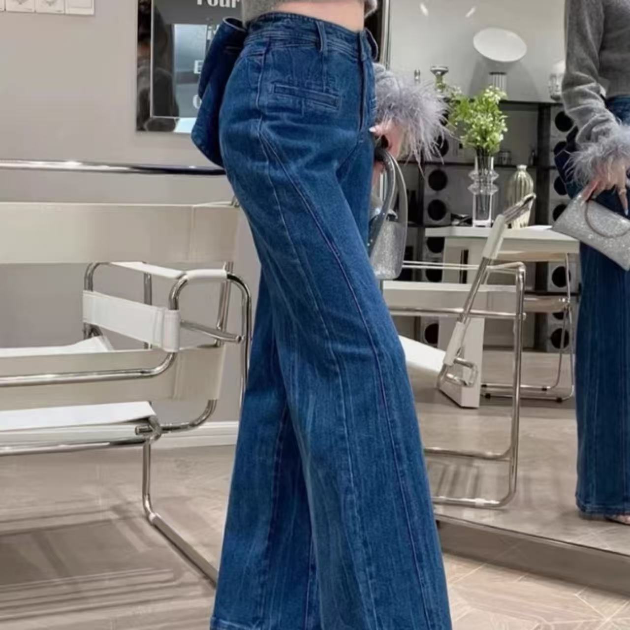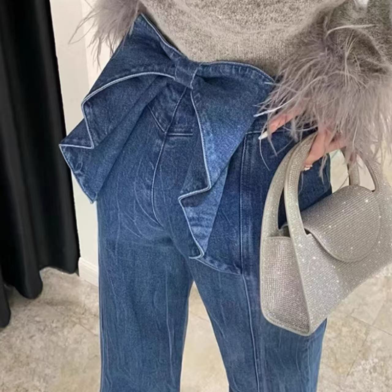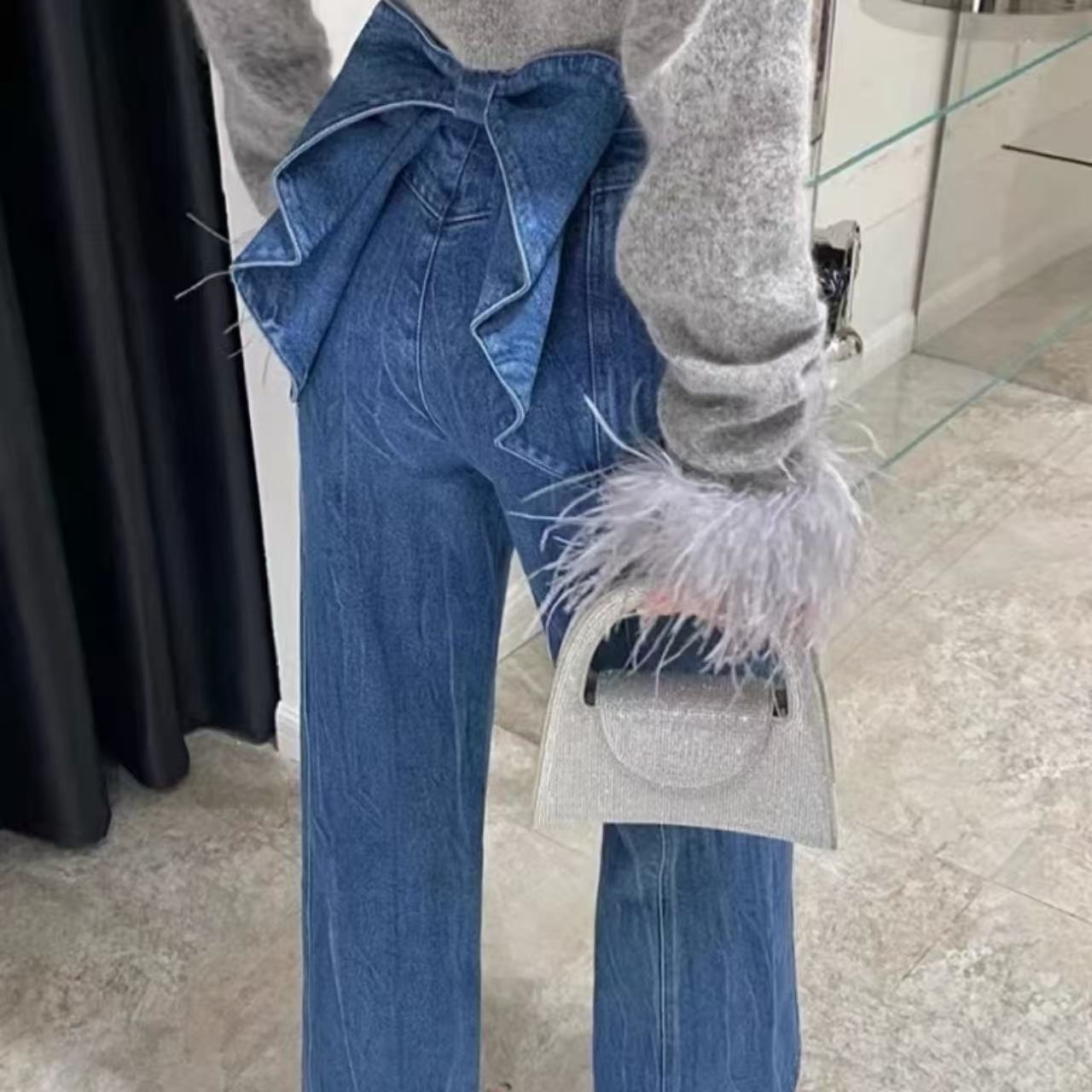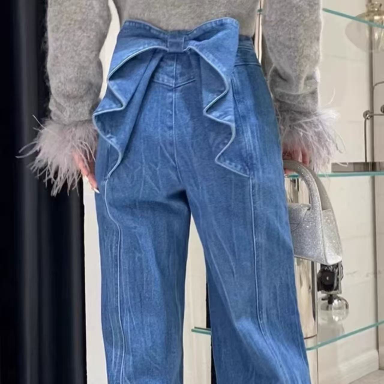 骨格ウェーブ バックリボンデザインハイウエスト デニムパンツ 脚長効果