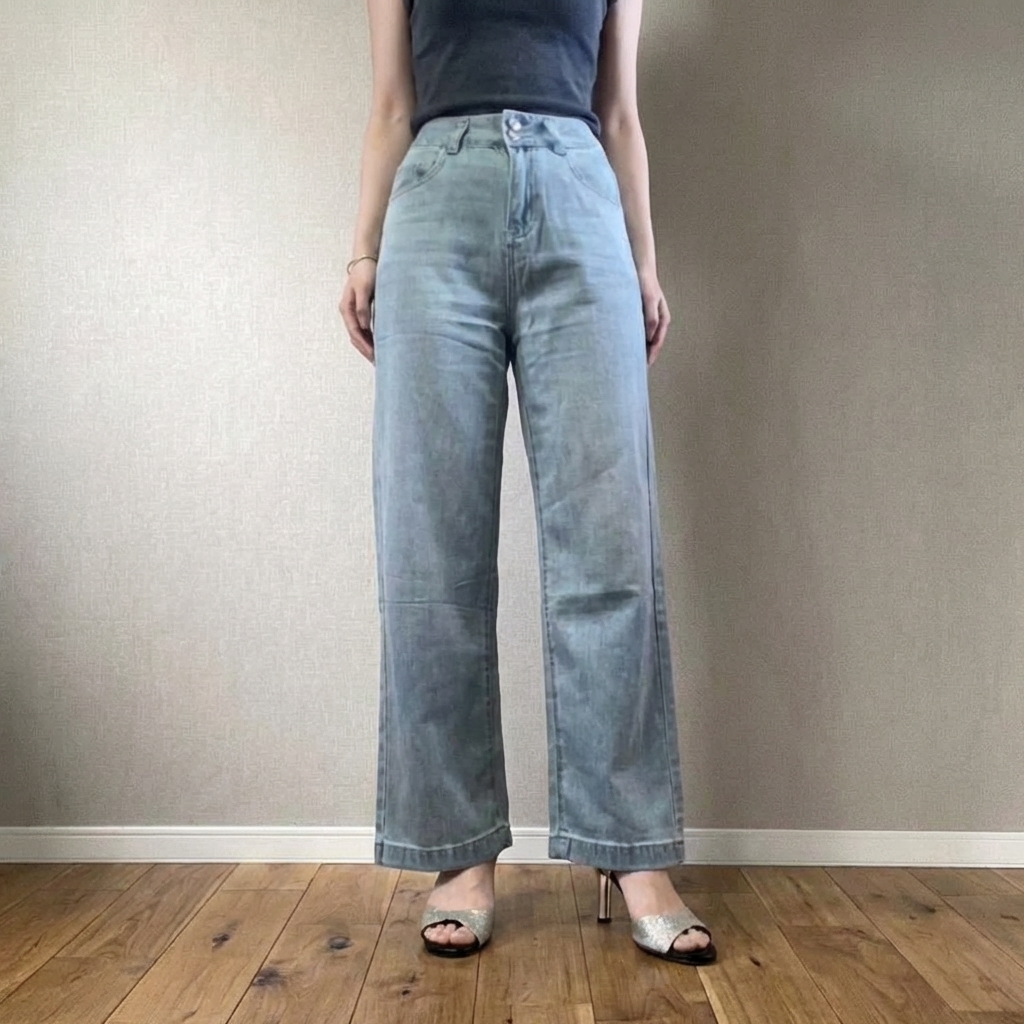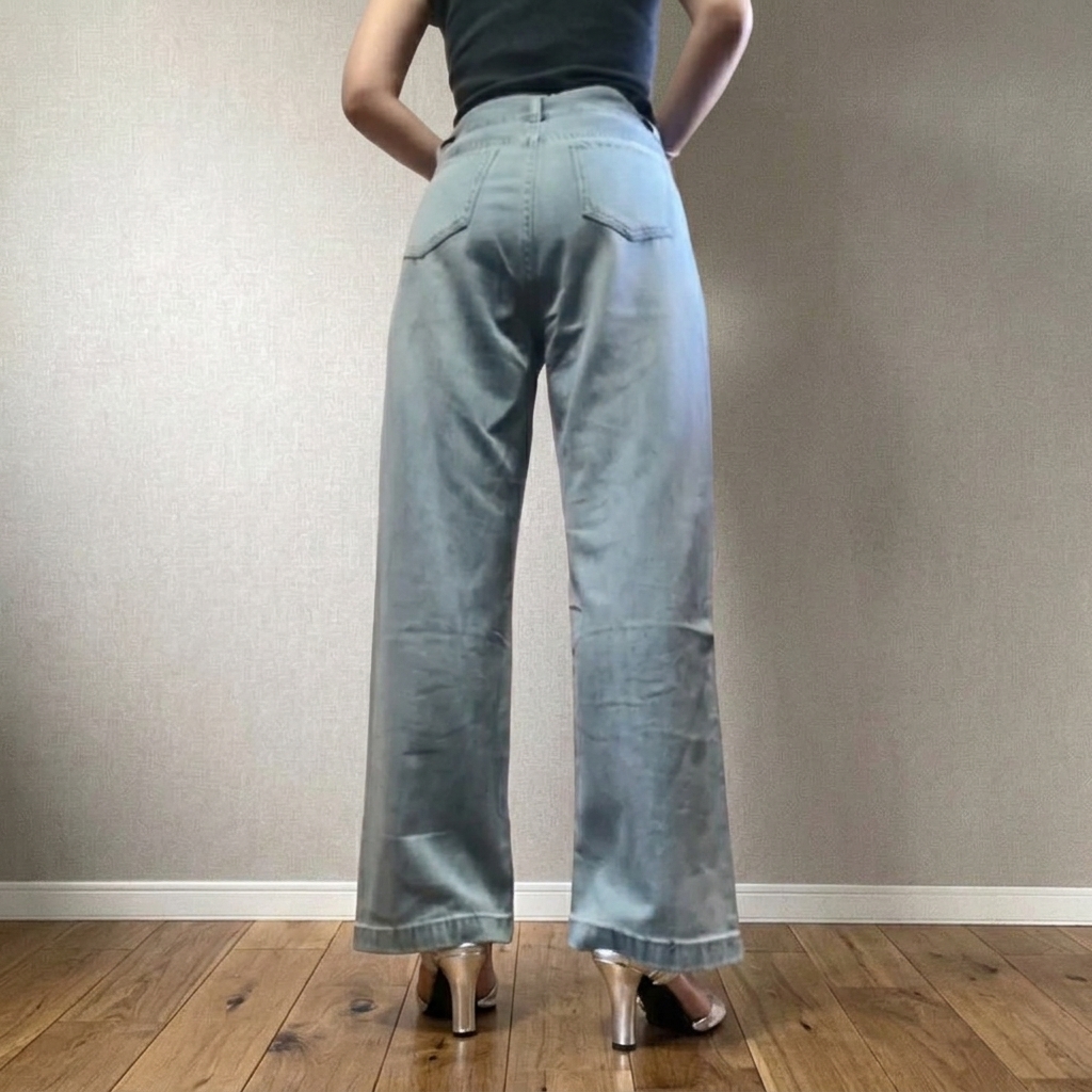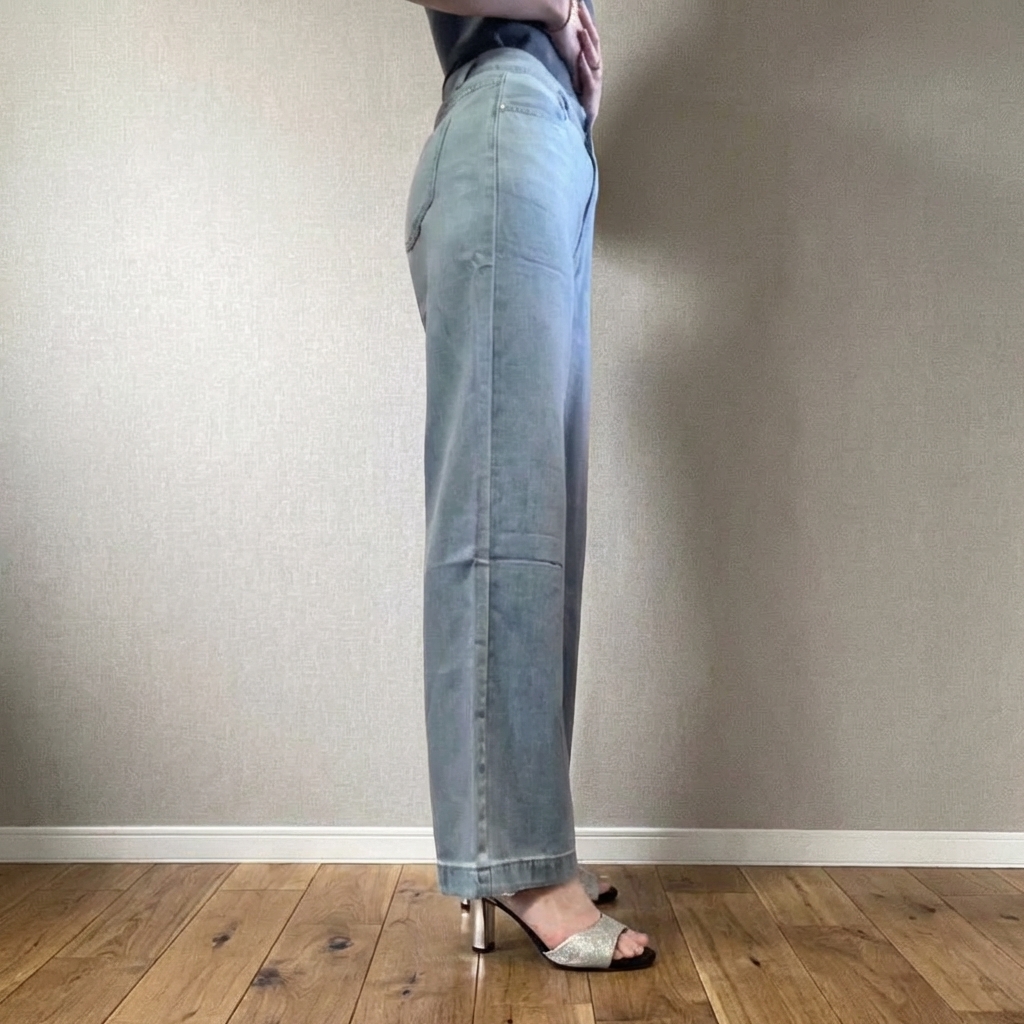 柔らかなデニム素材が女性らしい曲線にやさしくなじみ、広がりすぎないストレートラインが脚を長く演出します。