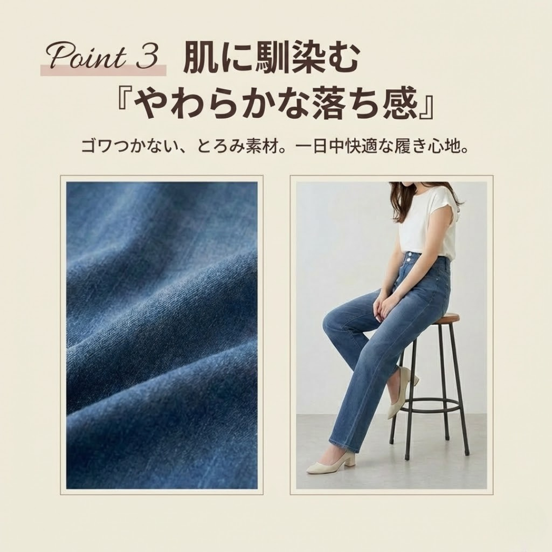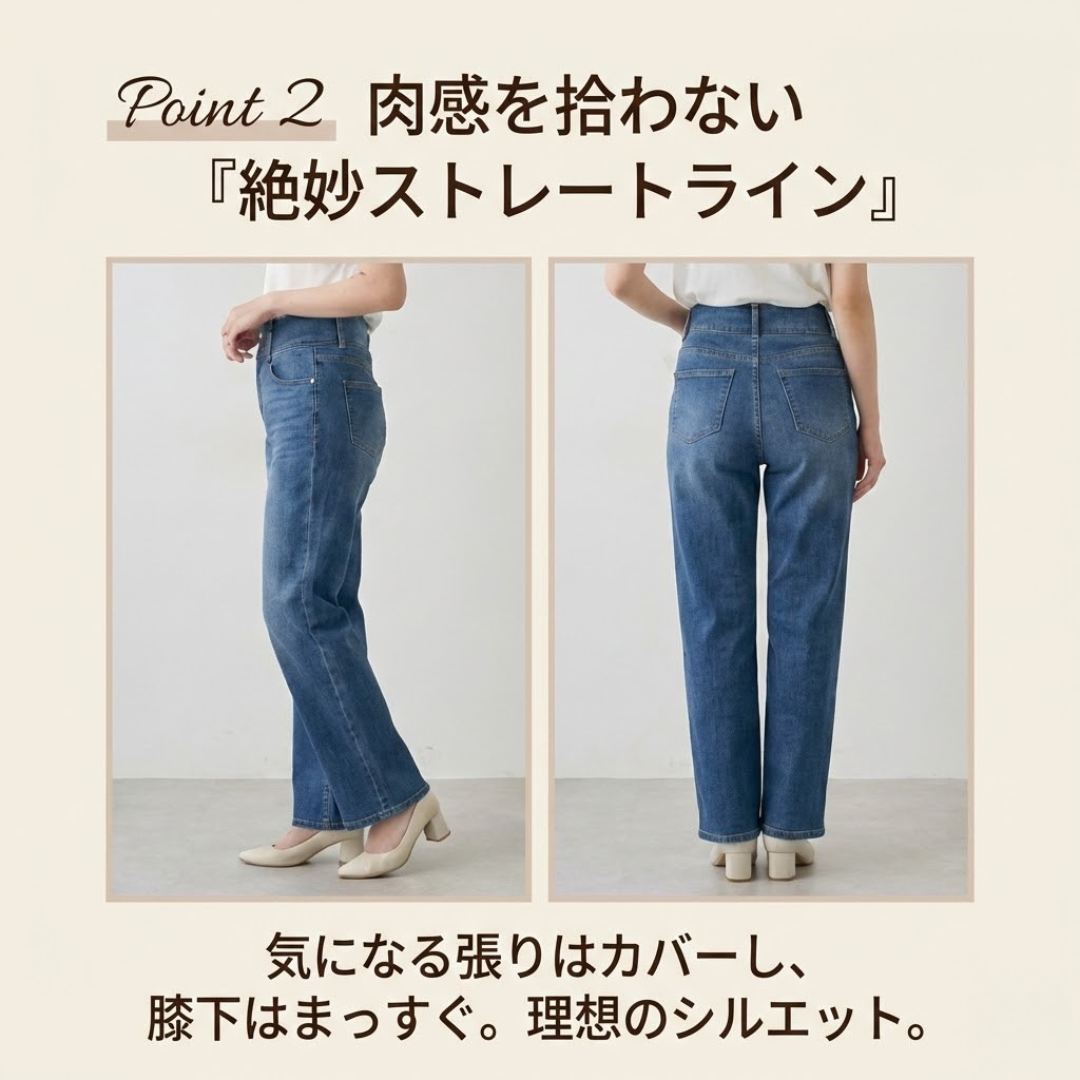 このデニムは、女性らしい曲線を活かしながら、気になる部分をやさしくカバー。