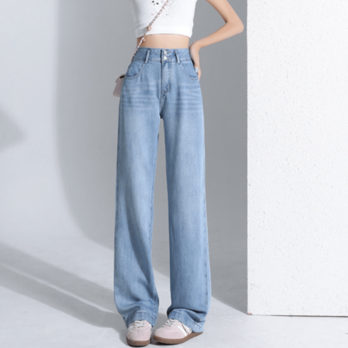 視線を上に引き上げ、ヒールなしでも脚長バランスを実現。