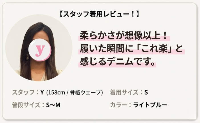デニム特有のゴワつきが少なく、硬い素材が苦手な方でもストレスフリー。