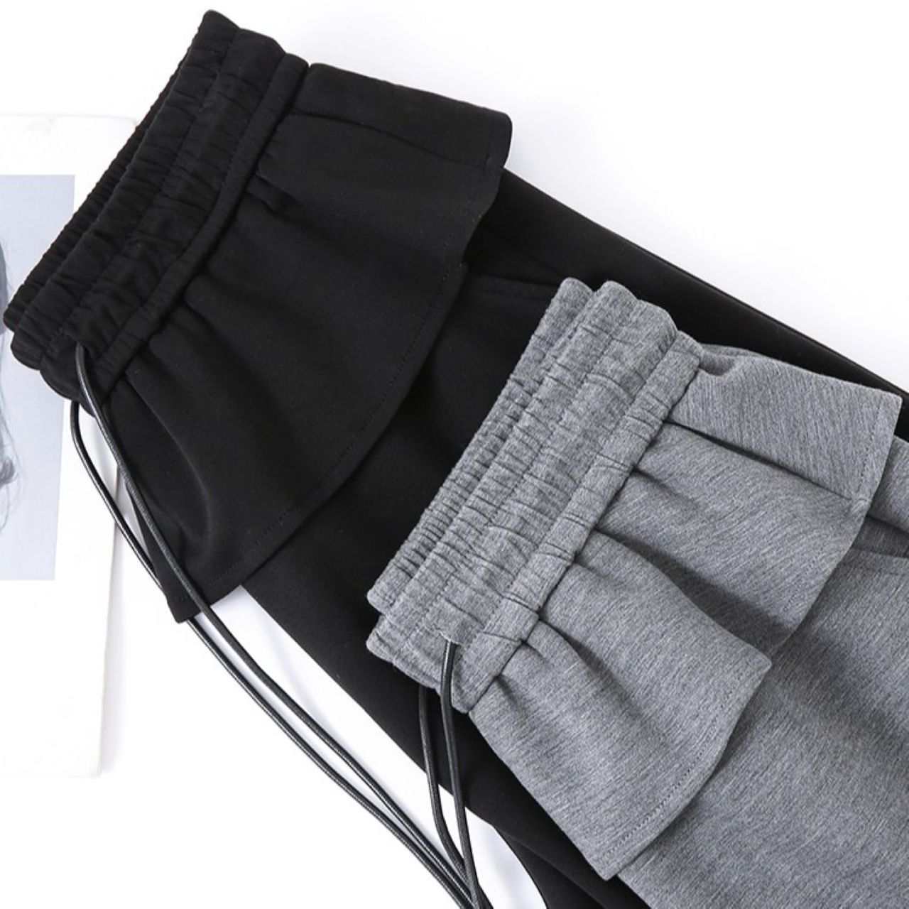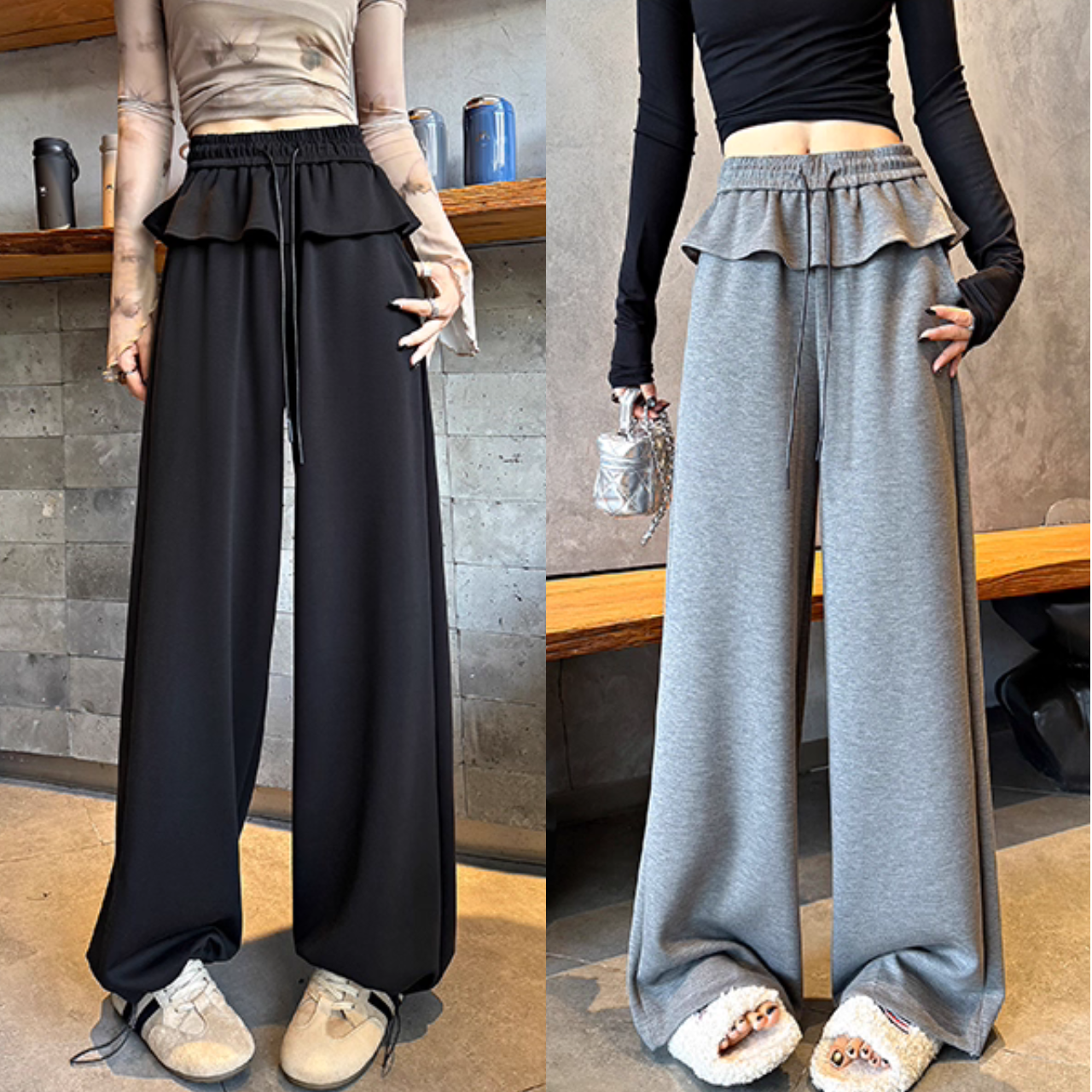 骨格ウェーブ フリル切替 ワイドパンツ ハイウエスト ゴム入り ゆったり