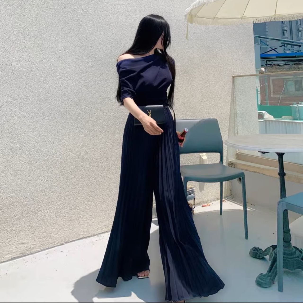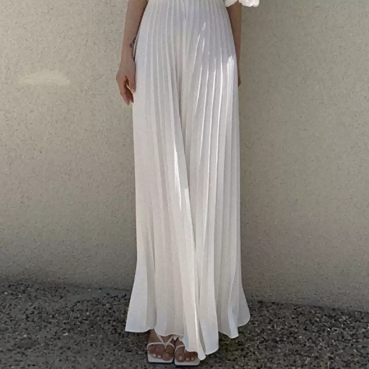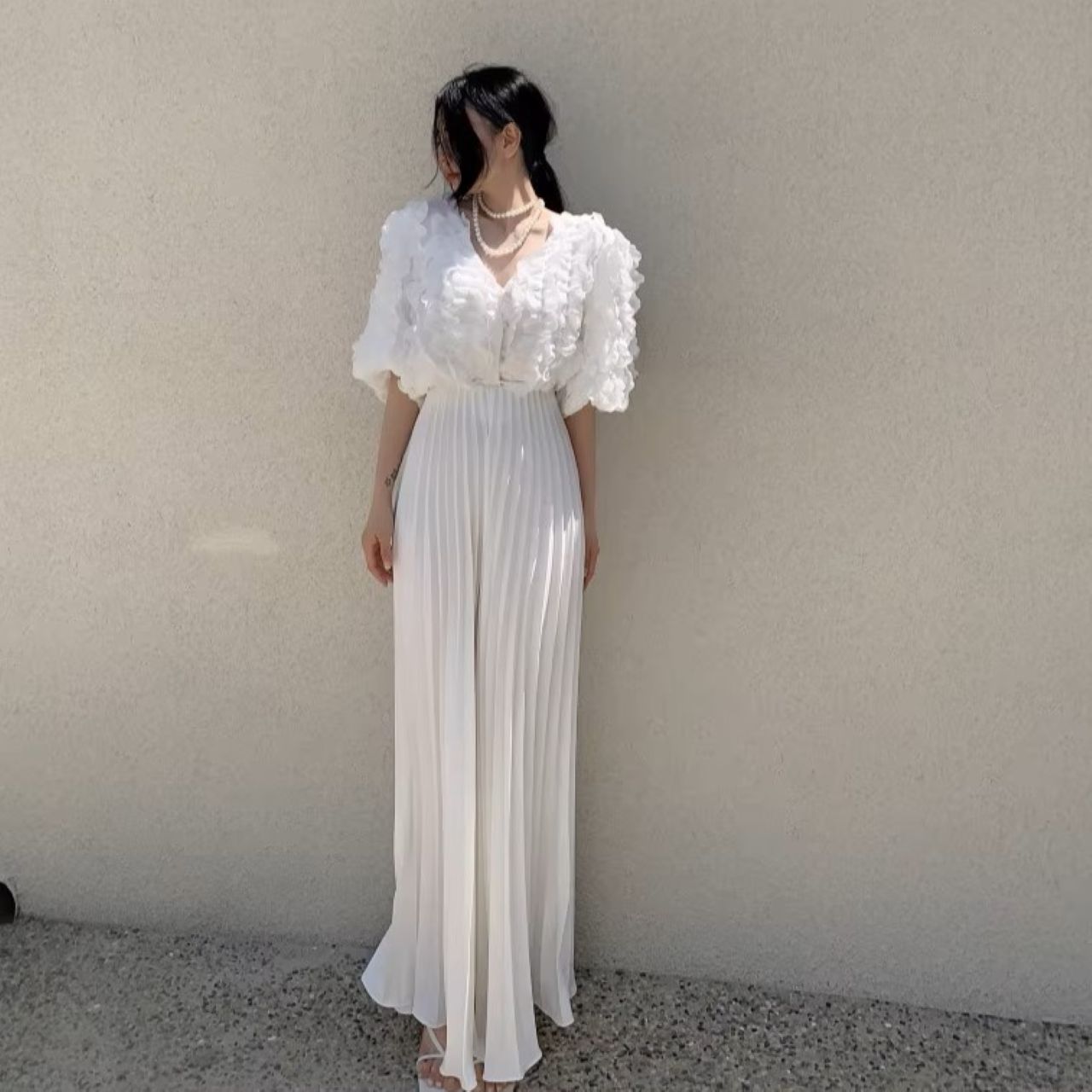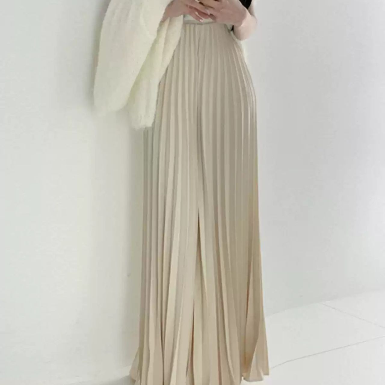 骨格ウェーブ 韓国風 ハイウエスト プリーツ ワイドパンツ フレアライン スリム見え