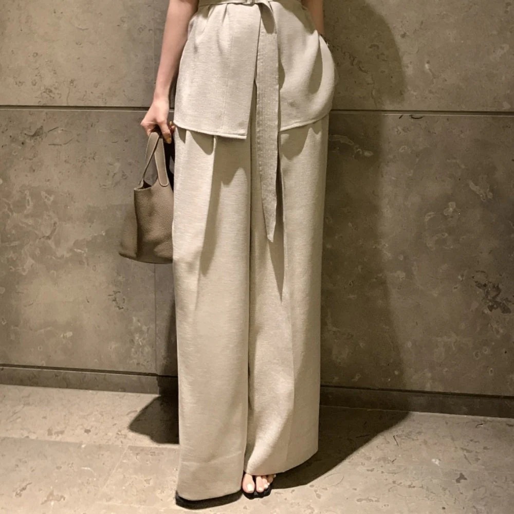 落ち感のある素材でワイドパンツも重たく見えず、上品で軽やかな印象に仕上がります。オフィスから休日まで幅広く活躍する一着です。