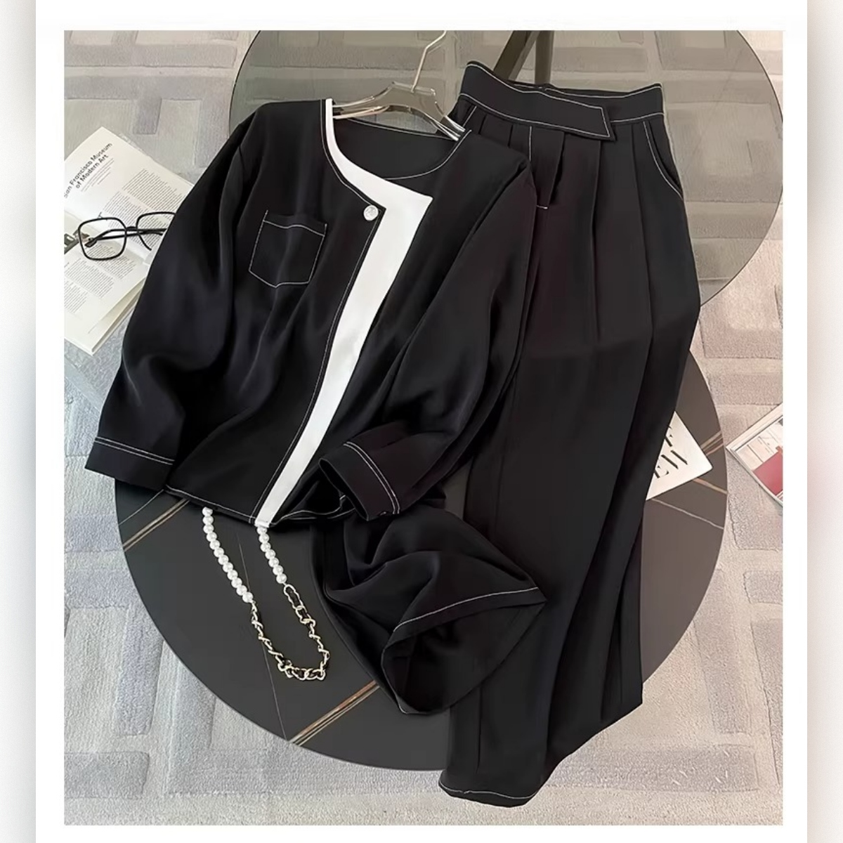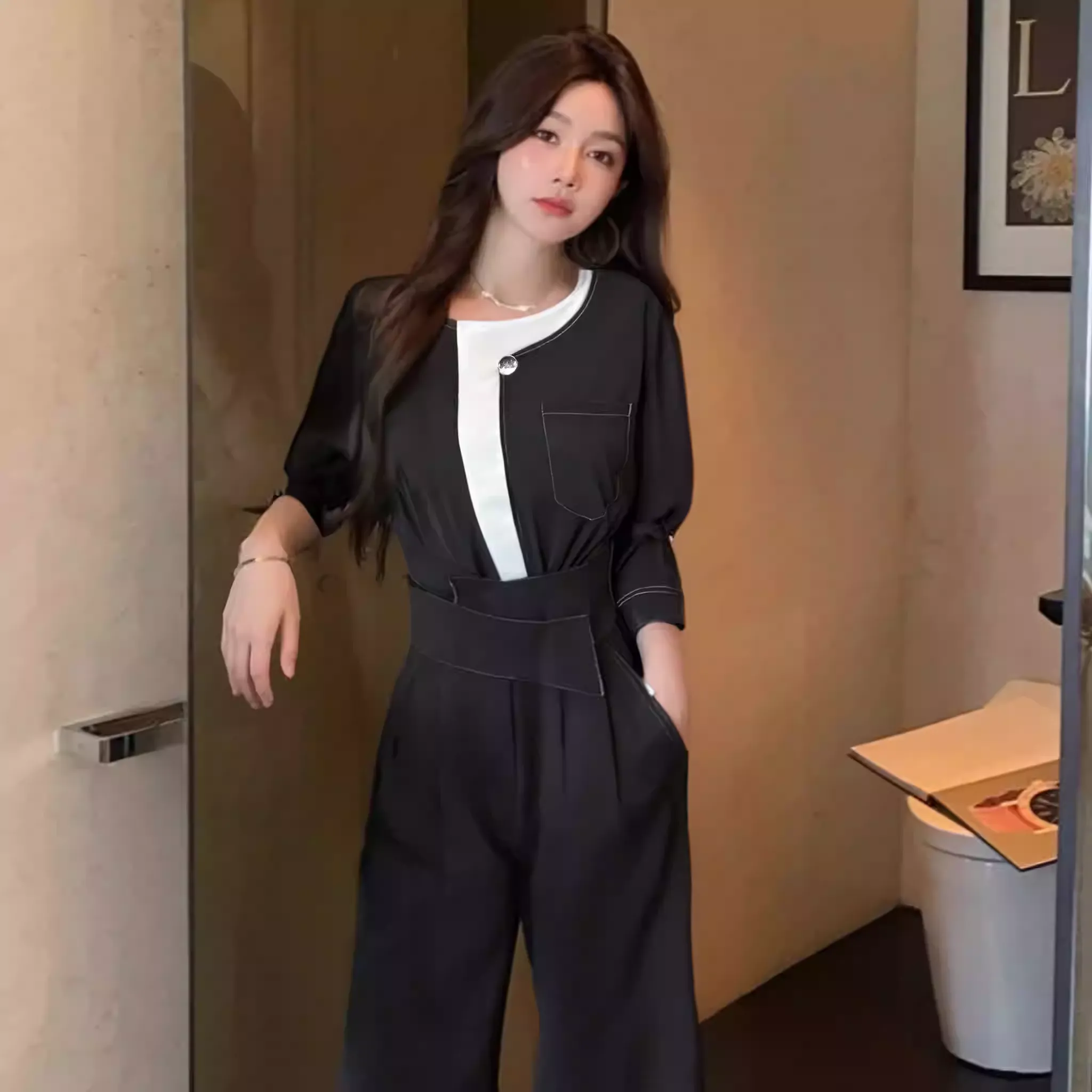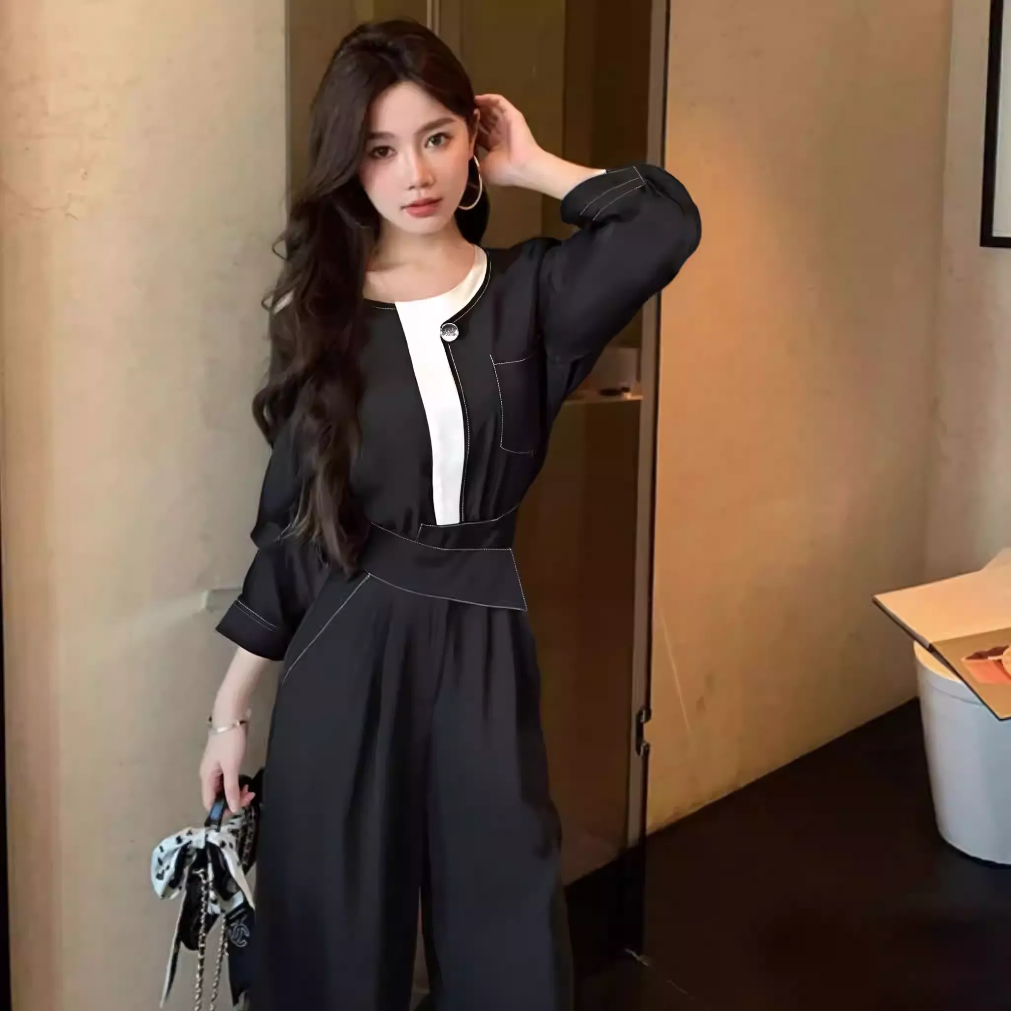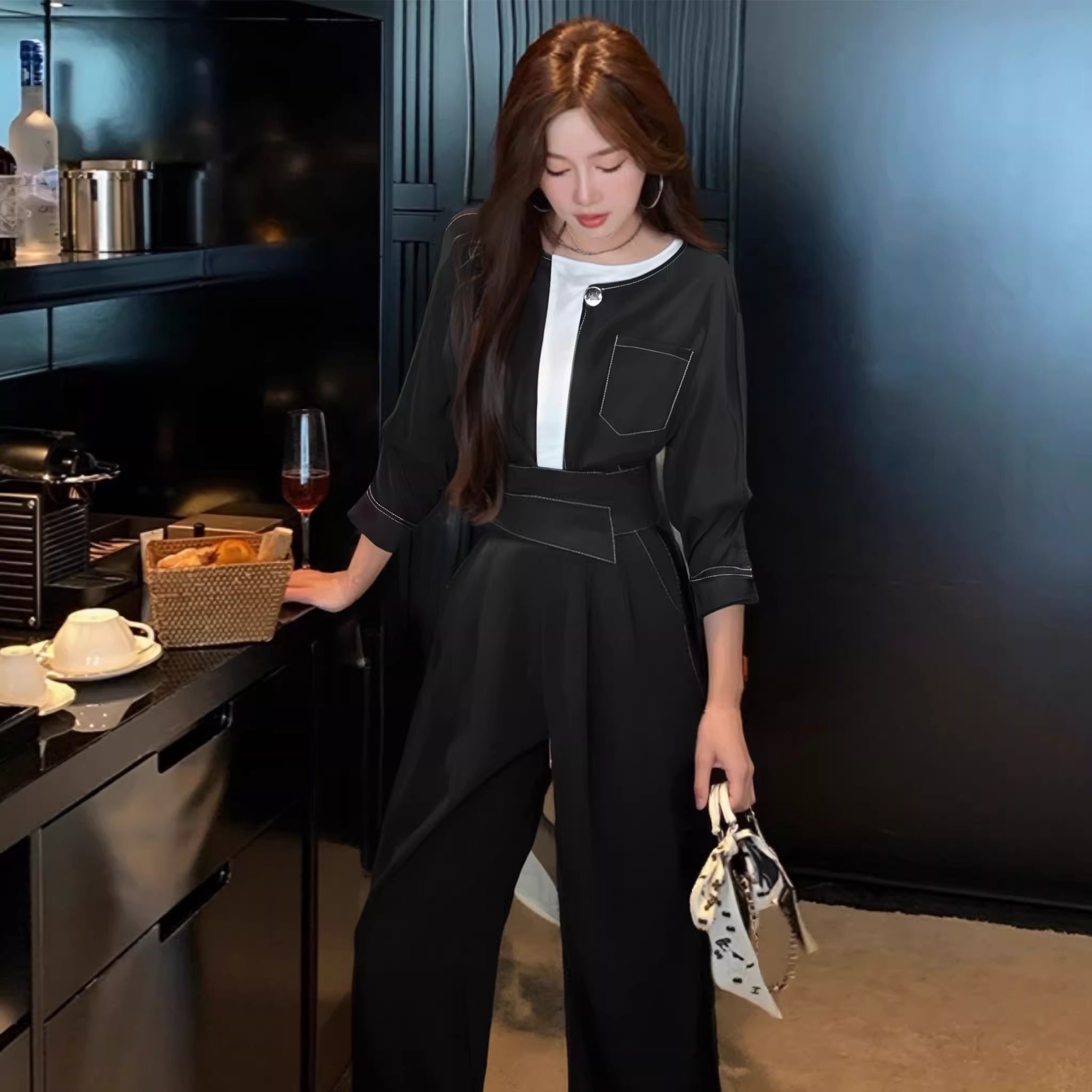 最大のポイントは、視線を上に集める胸元のホワイトバイカラーと、腰位置を高く見せるハイウエスト設計。
