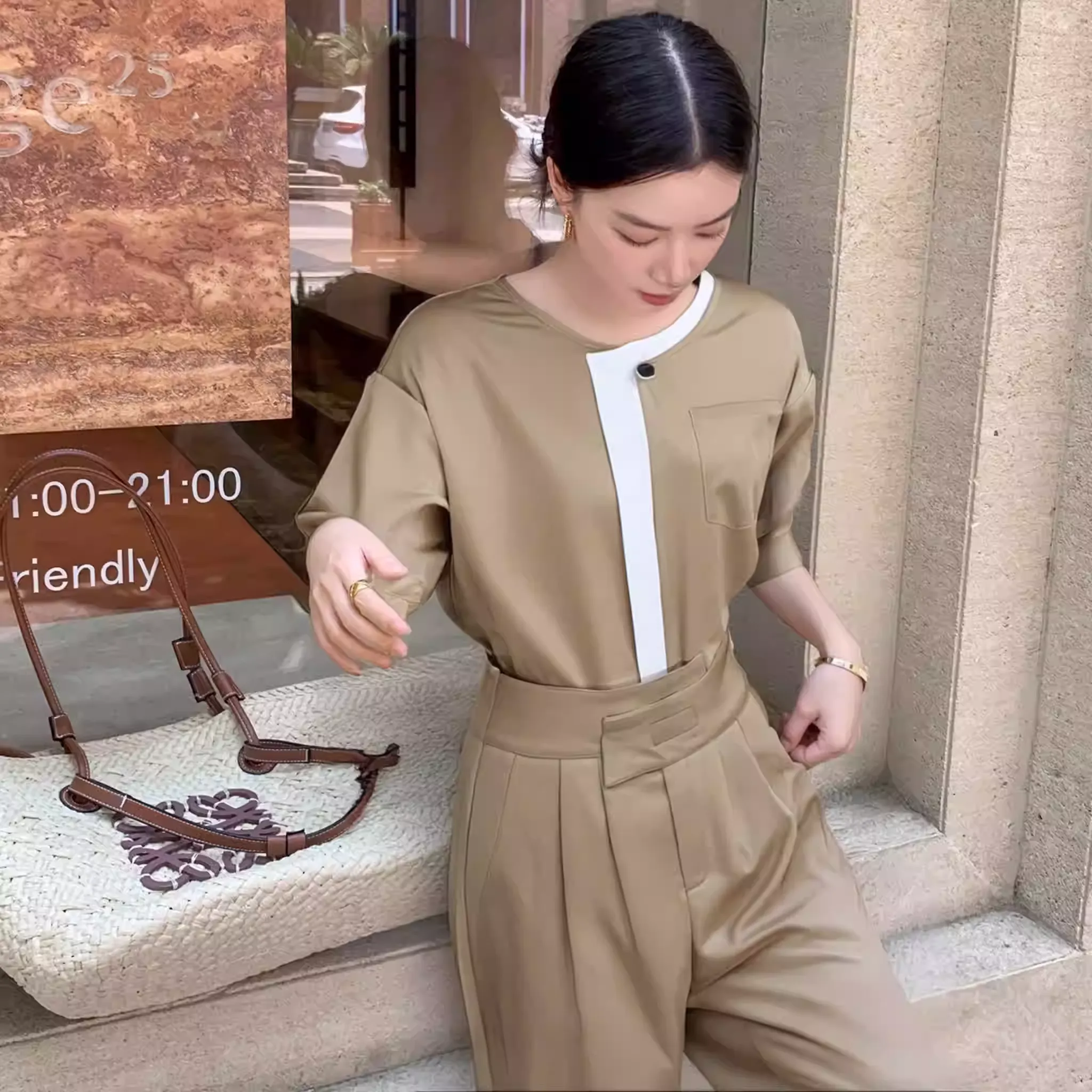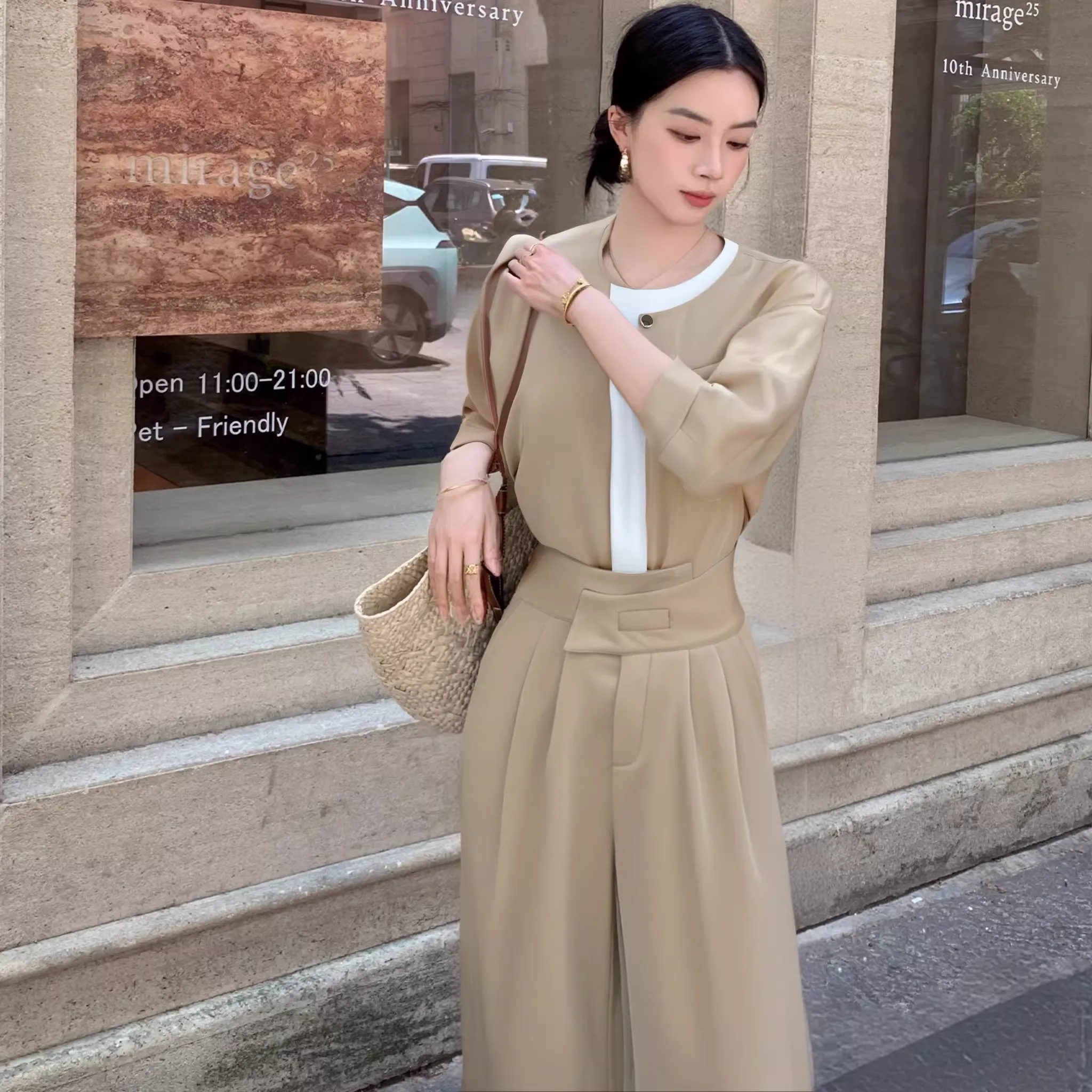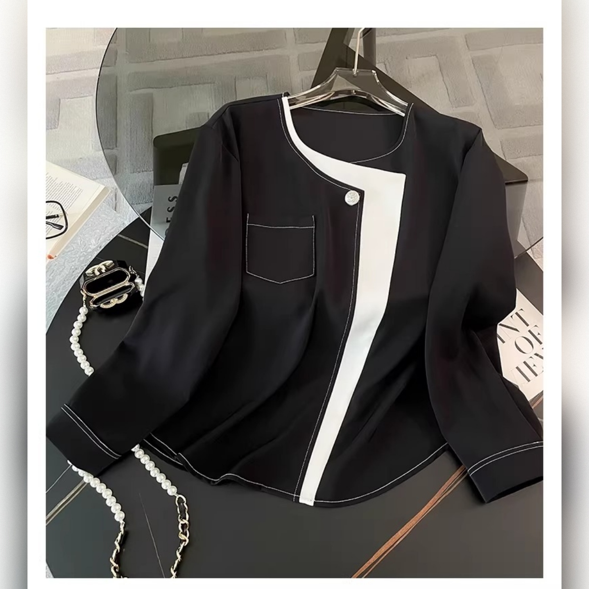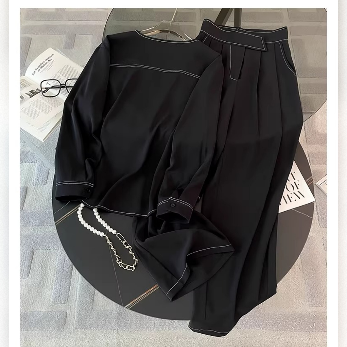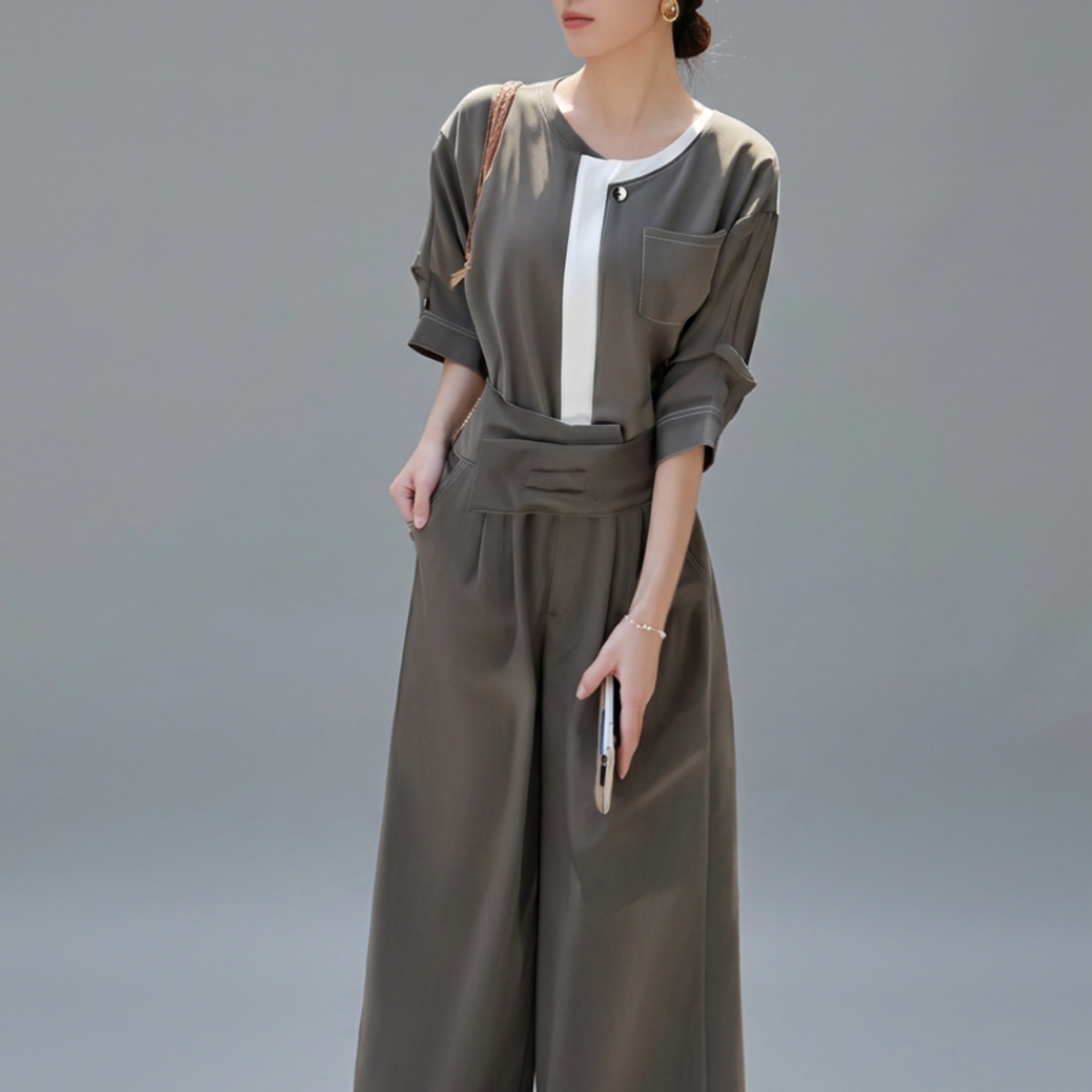 最大のポイントは、視線を上に集める胸元のホワイトバイカラーと、腰位置を高く見せるハイウエスト設計。
