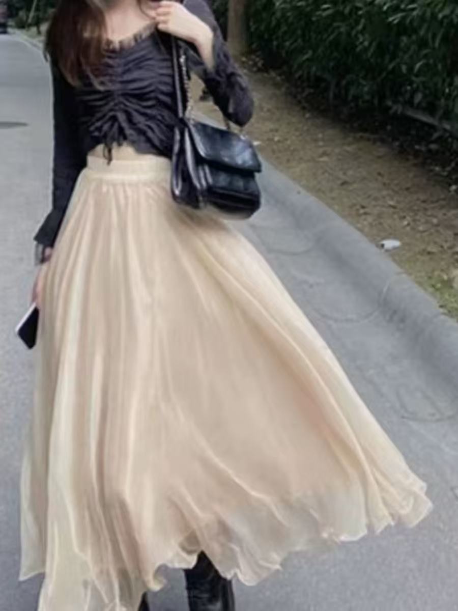 このロングスカートは、優雅なデザインときらめく花びらの縁が特徴で、歩くたびに流れるような動きを演出します。ゴールドの色味が華やかさと上品さを兼ね備え、特別なシーンから日常コーデまで幅広く活躍する一枚です。