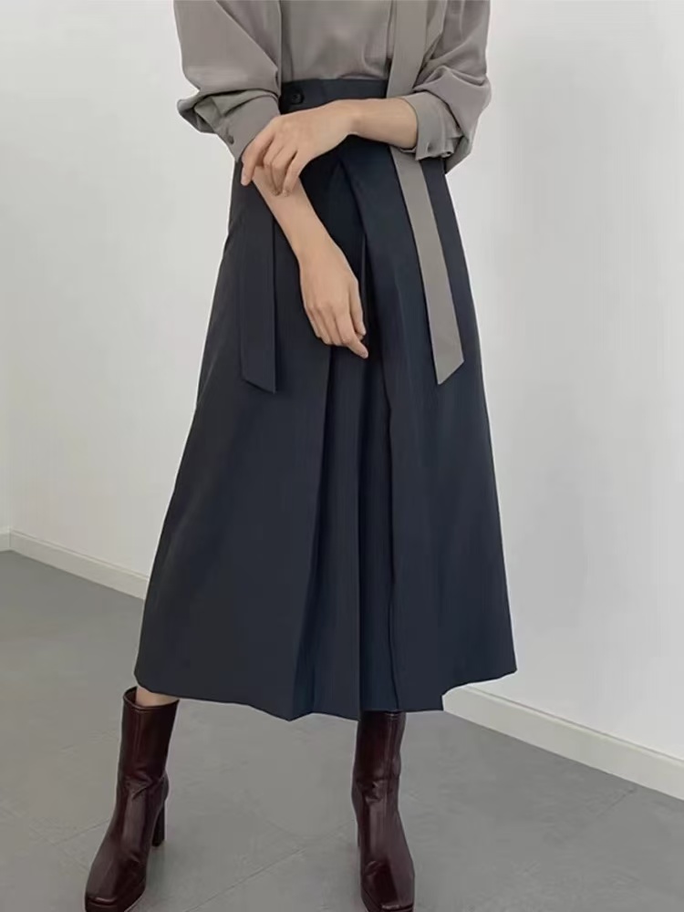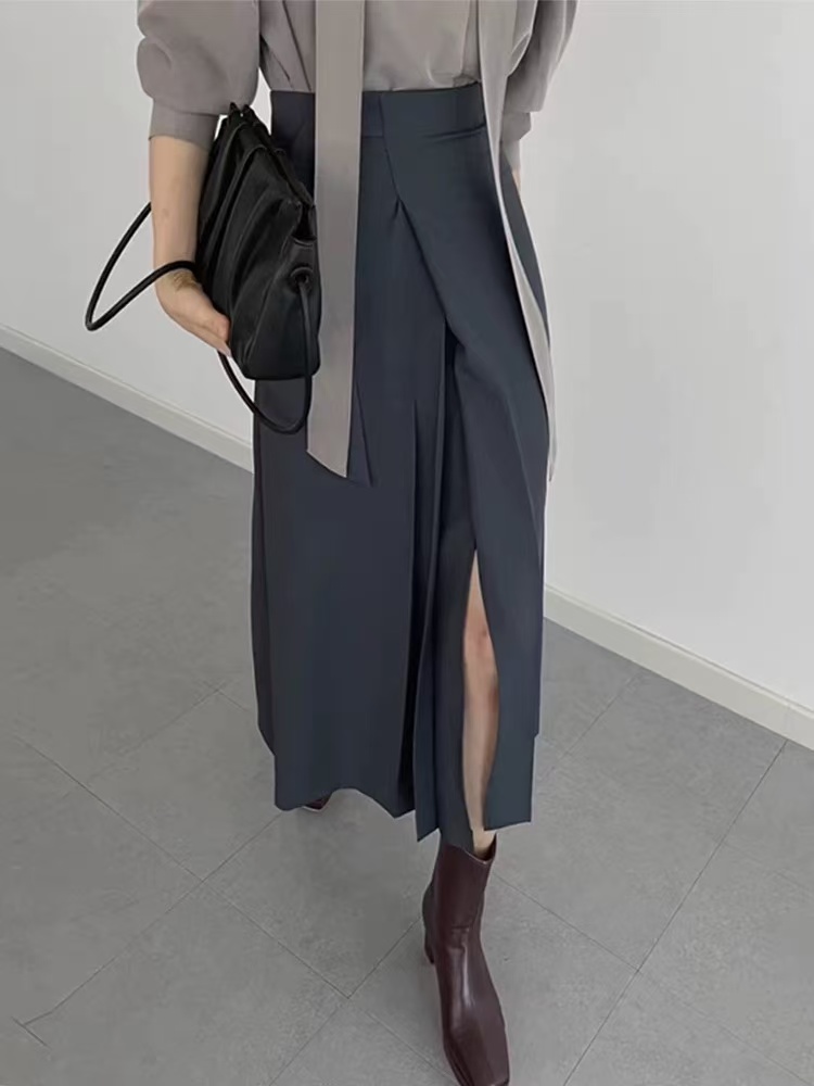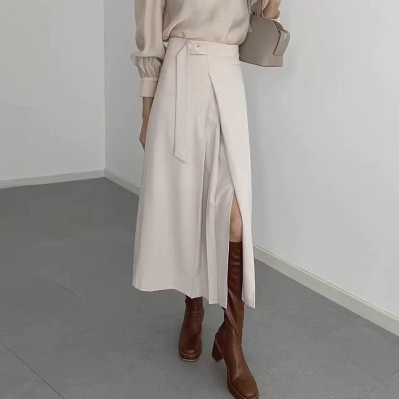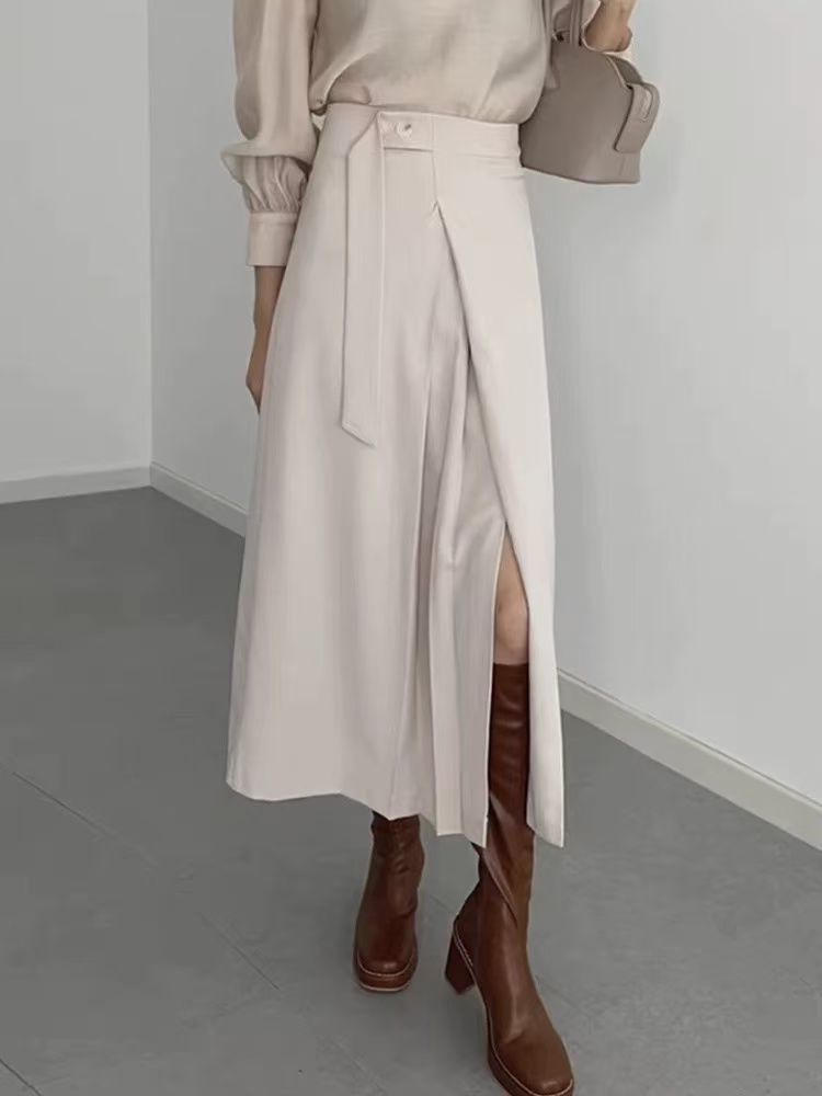 カジュアルファッション【韓国風シックな春のハイウエストバックルプリーツスリットスカート】は、シンプルながら個性を感じさせるデザインが魅力。洗練されたハイウエストがスタイルを美しく見せ、プリーツとバックルが上品さと特別感をプラス。無地で合わせやすく、デイリーから特別なシーンまで活躍する一枚です。