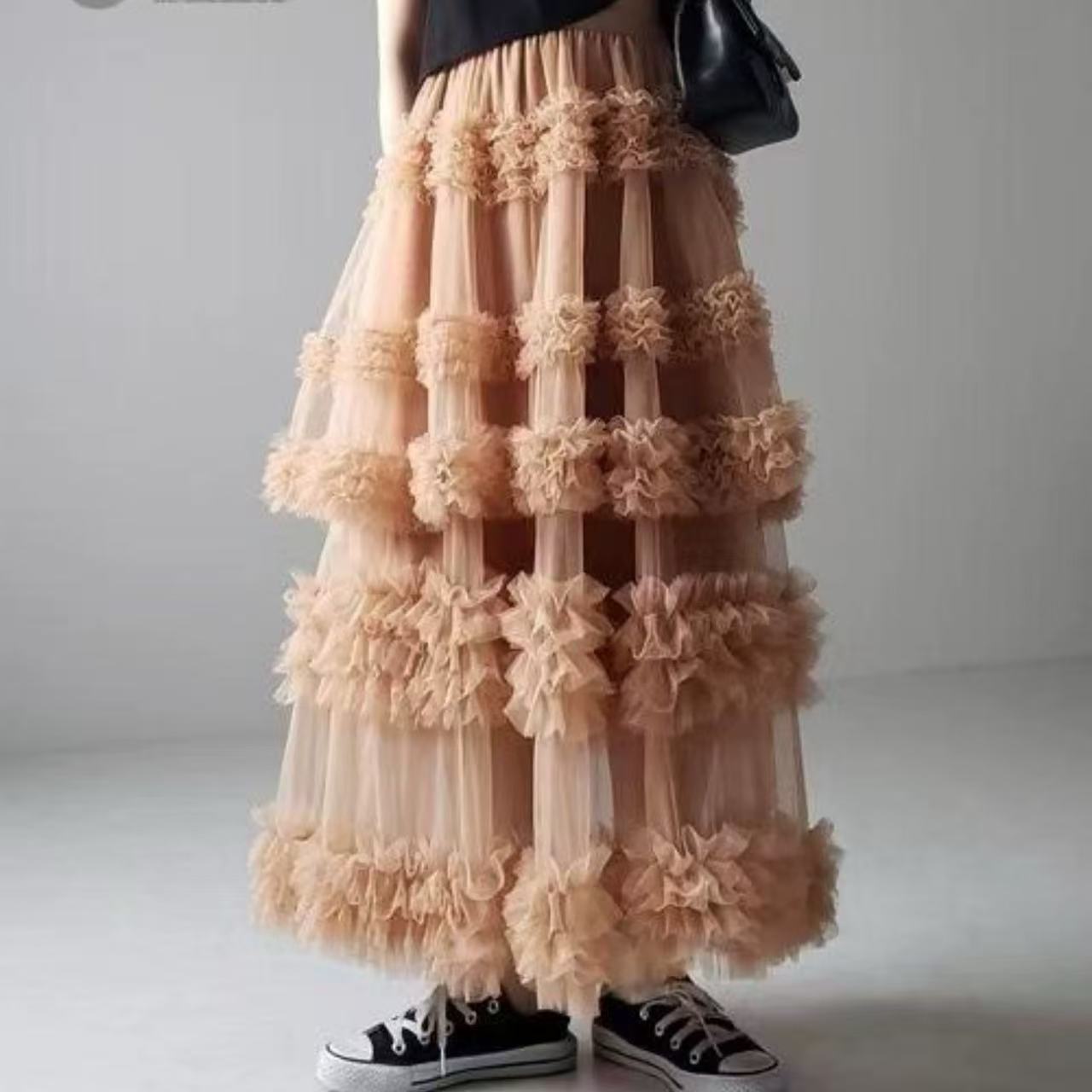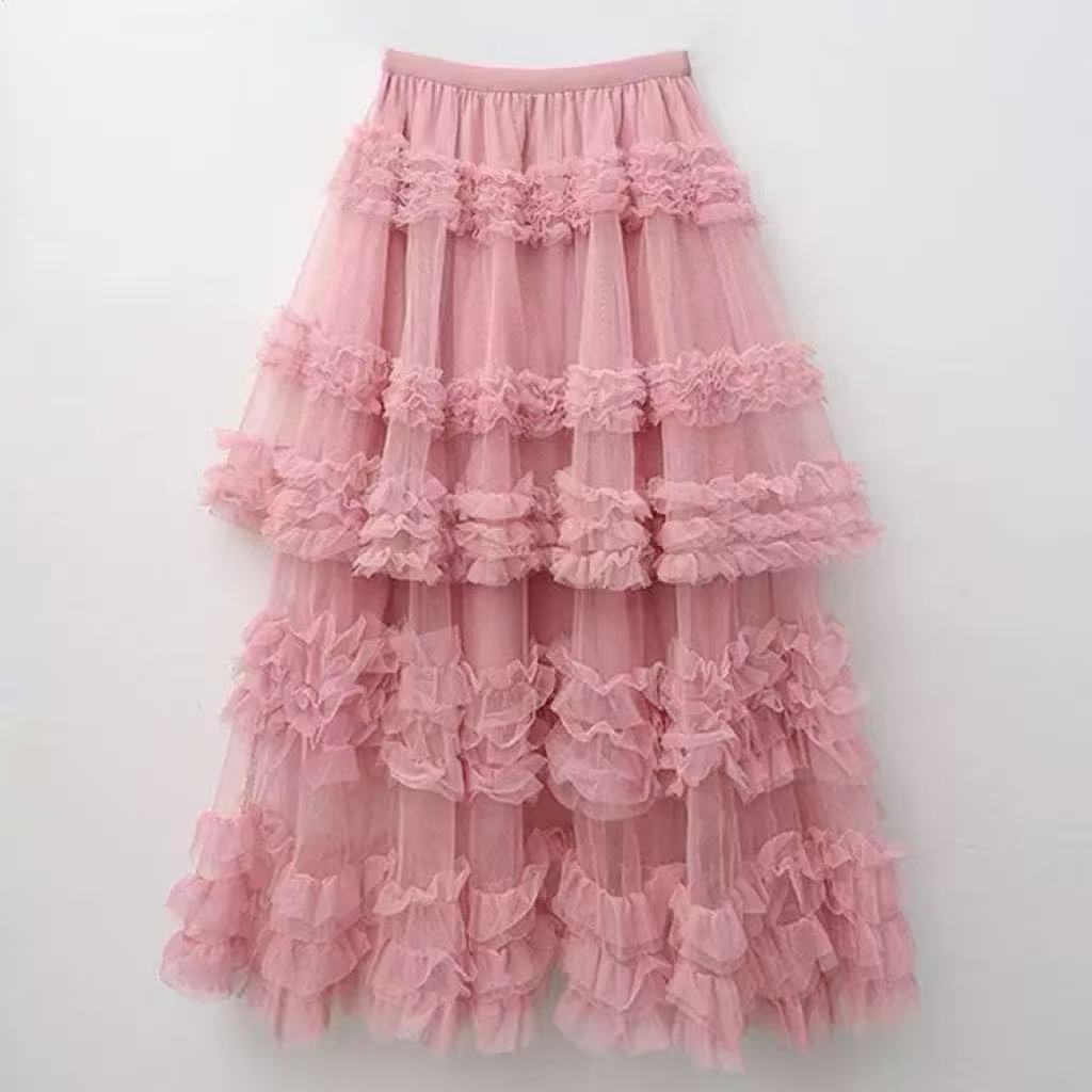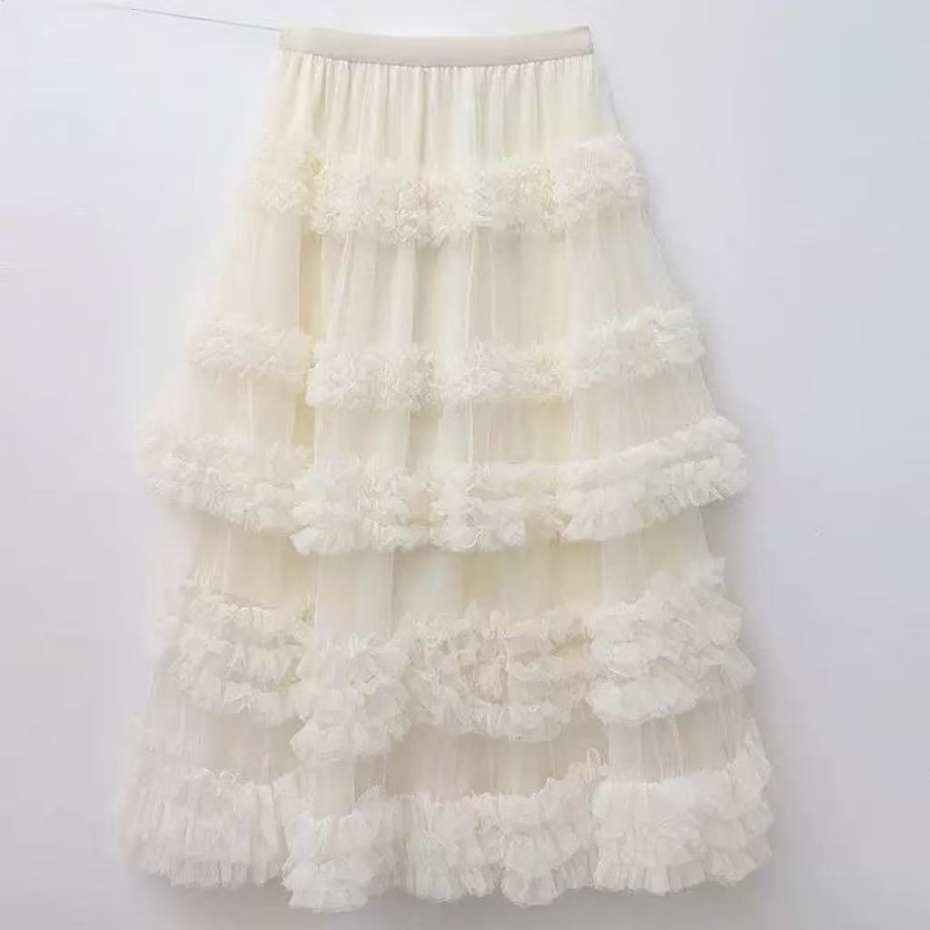 骨格ウェーブ向けチュールフリルティアードフレアスカート。美しくフィットするシルエットと軽やかなチュール素材、フリルが女性らしさを演出。ティアードデザインで立体感を生み、動くたびに優雅に揺れます。カジュアルなお出かけから特別なシーンまで活躍するフェミニンな一着です。