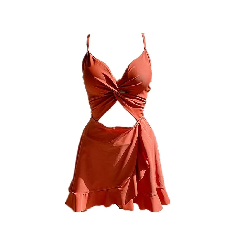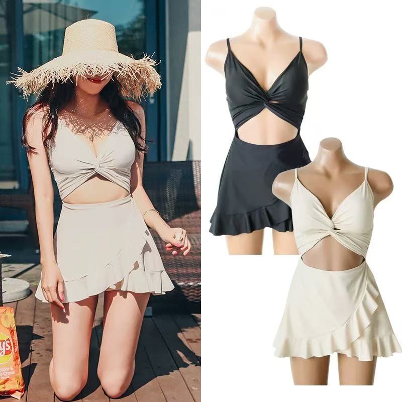 胸元のツイストディテールとウエストのカットアウトが、女性らしい曲線を美しく引き立てるワンピース水着です。程よい肌見せでヘルシーな印象を演出し、フリル付きのアシンメトリースカート風デザインがヒップや太ももを自然にカバー。動くたびに軽やかに揺れてフェミニンさを添えます。リゾートやプールサイドで映える、トレンド感と体型カバーを両立した一枚です。