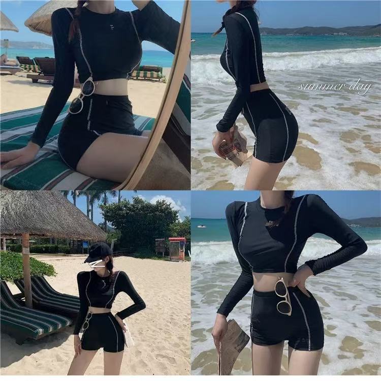 骨格ウェーブ ブラック 長袖 スプリットデザイン 水着
