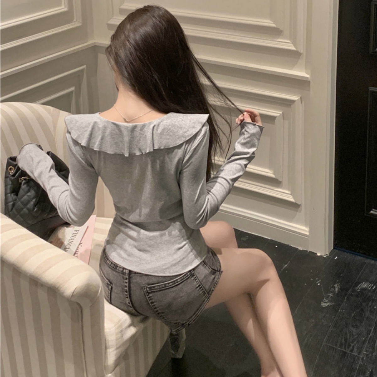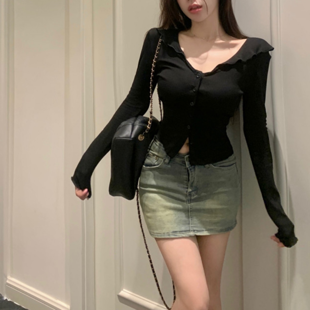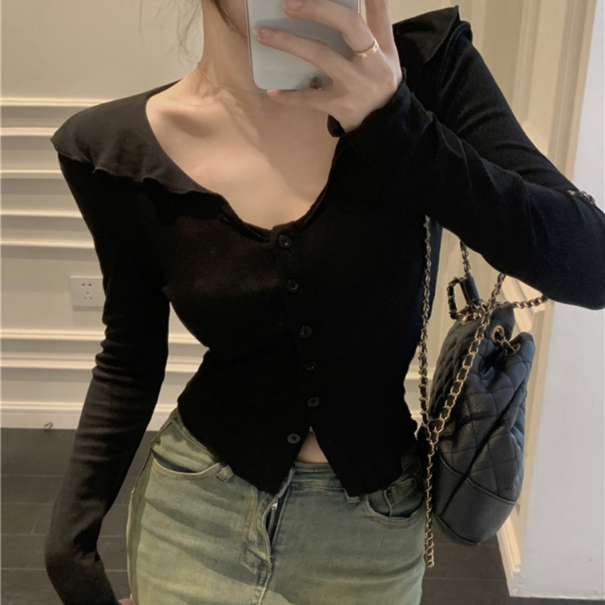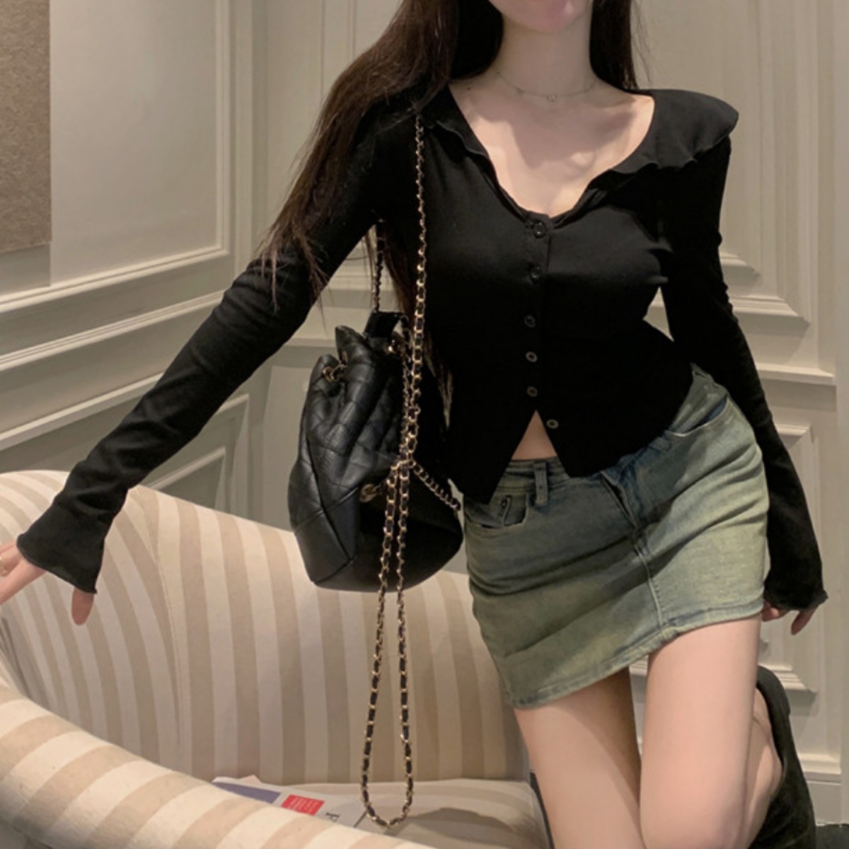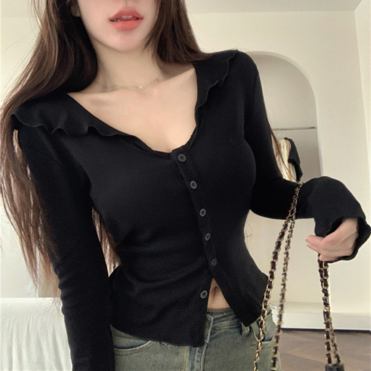 骨格ウェーブ 華奢見えフリル襟 スリムフィットトップス