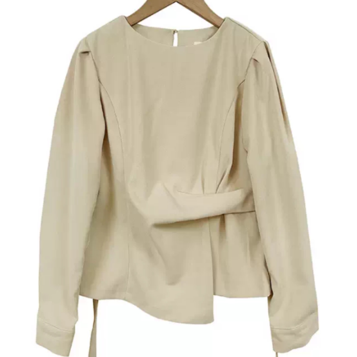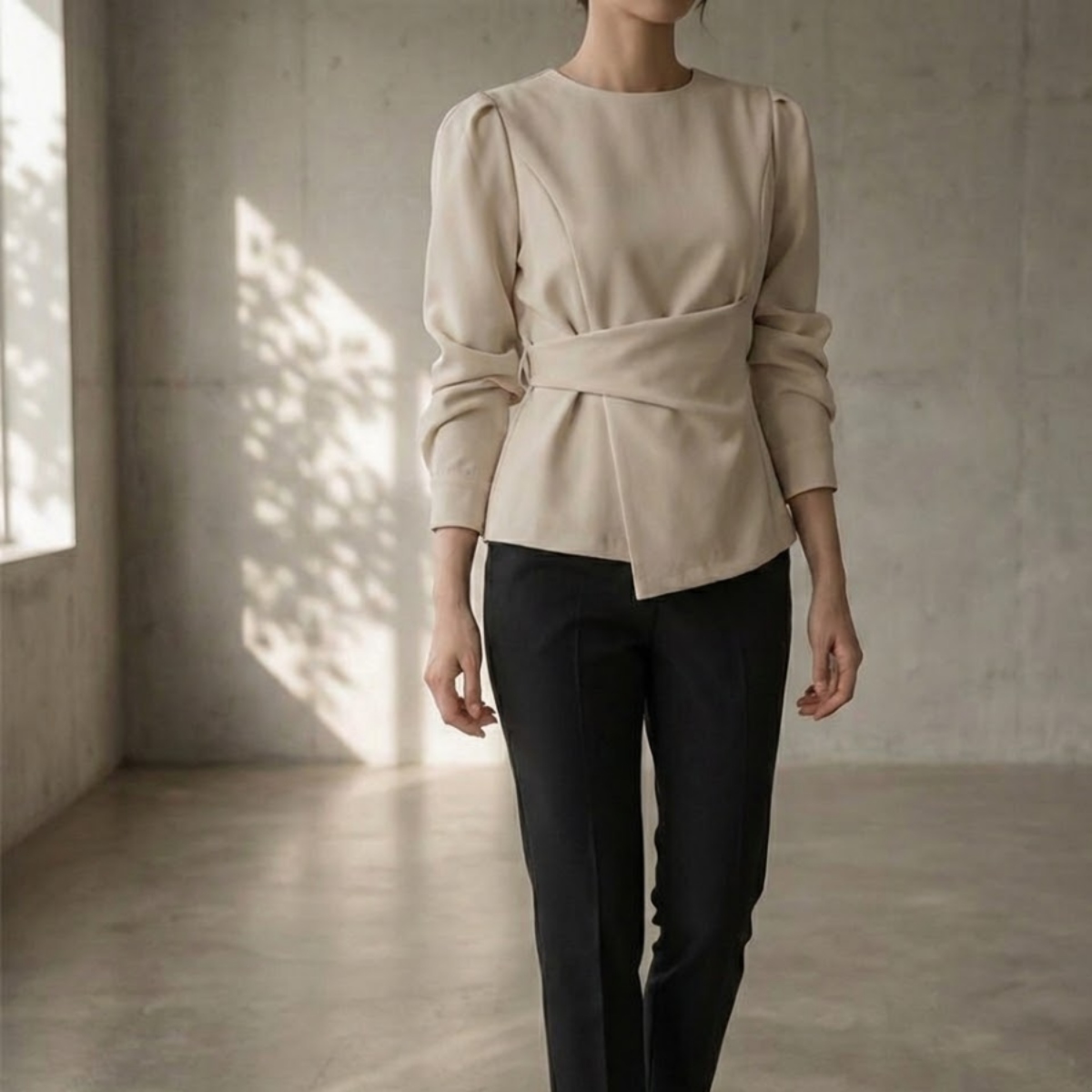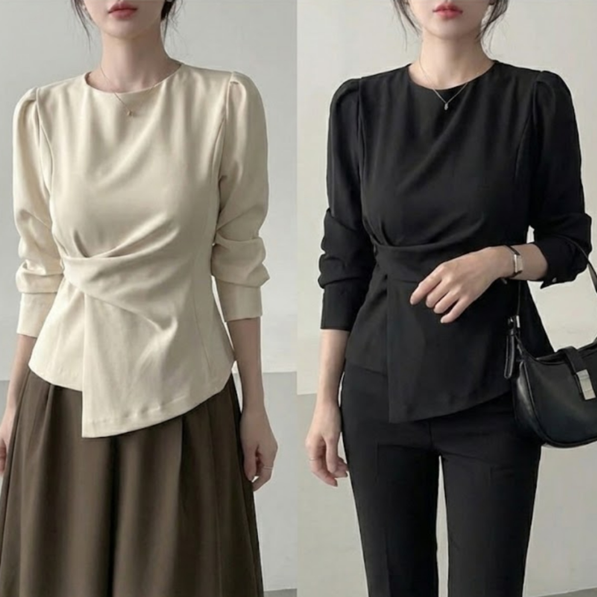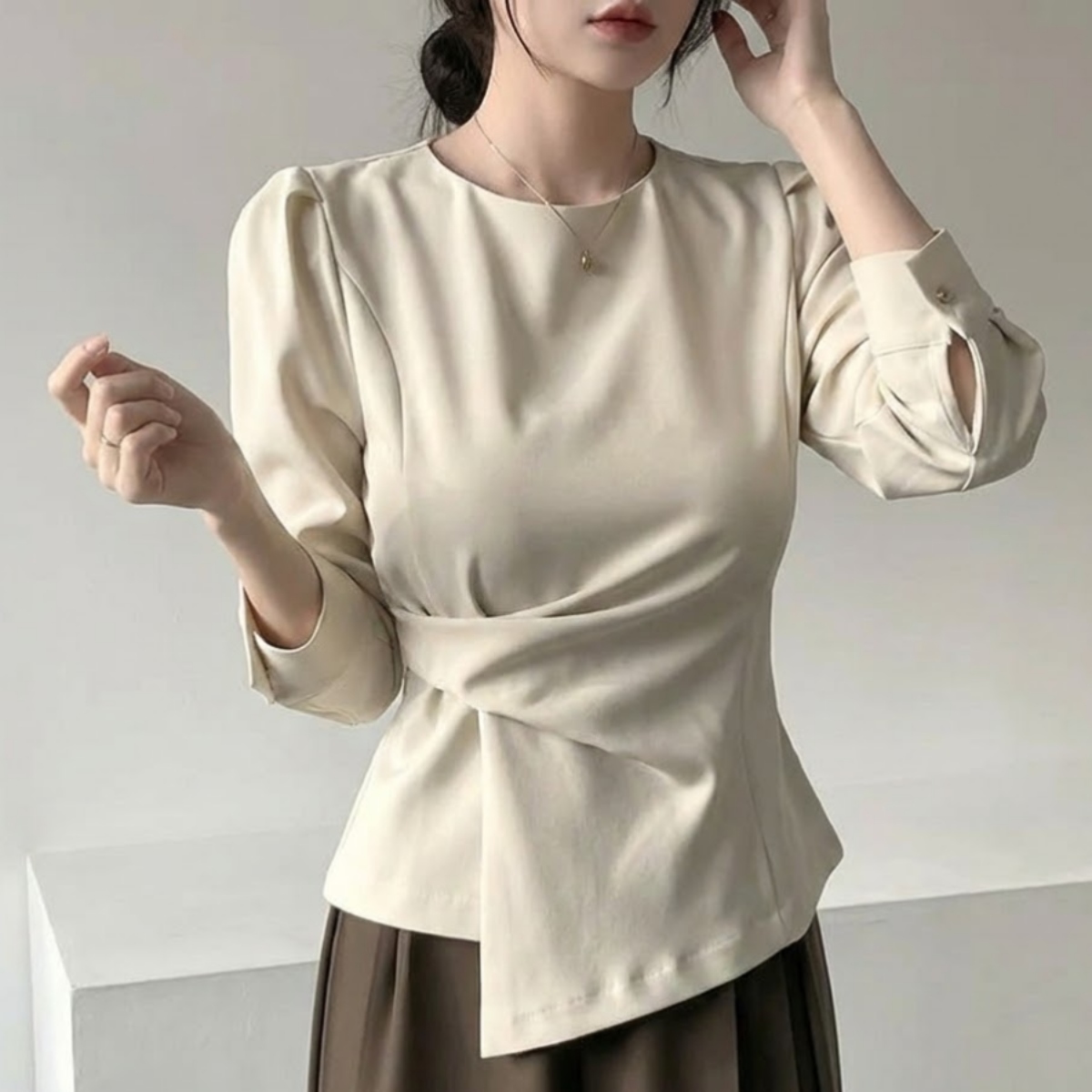 着るだけでスタイルアップ。骨格ウェーブさんのための本命ブラウスです。 フロントの変形ドレープが自然に高い位置でウエストをマークし、着るだけで驚きの脚長効果と細見えを叶えます。 寂しくなりがちな上半身は、上品なパフスリーブで華奢さを活かしつつ華やかにカバー。韓国風の洗練されたとろみ素材が、ウェーブさんの柔らかな肌質にベストマッチします。 裾を出しても決まるデザインなので、気になるお腹周りもさりげなくカバー。マーメイドスカートやスラックスと合わせれば、洗練された大人のお姉さんコーデが即完成します。オフィスからデートまで頼れる、スタイルアップ必須の一枚です。