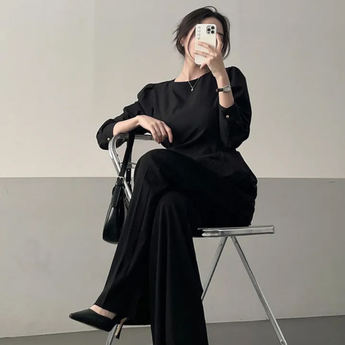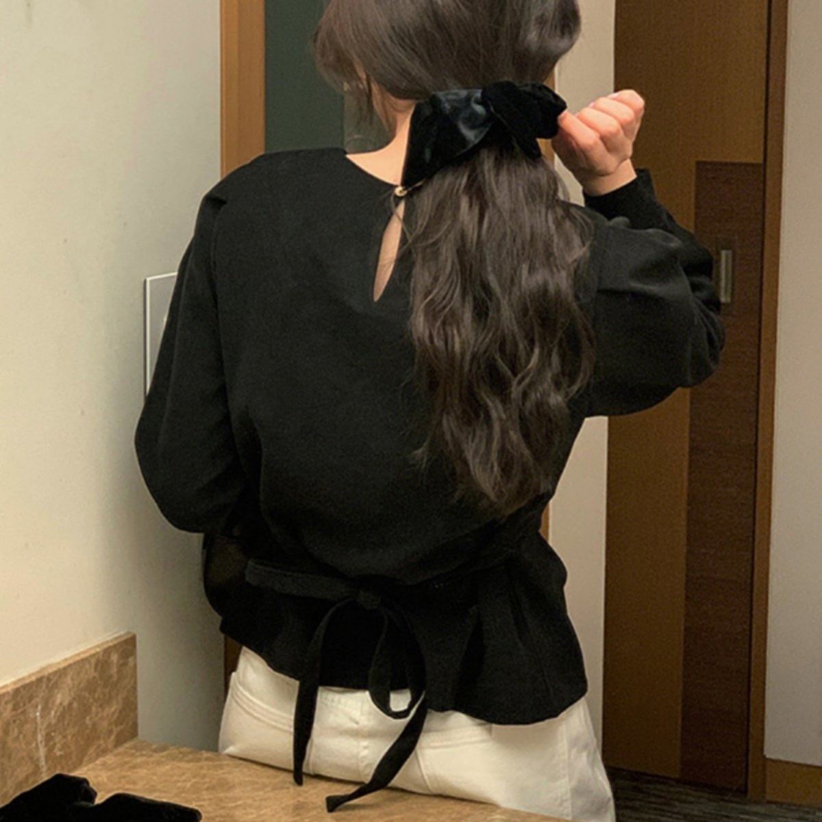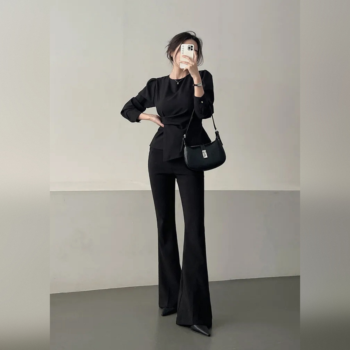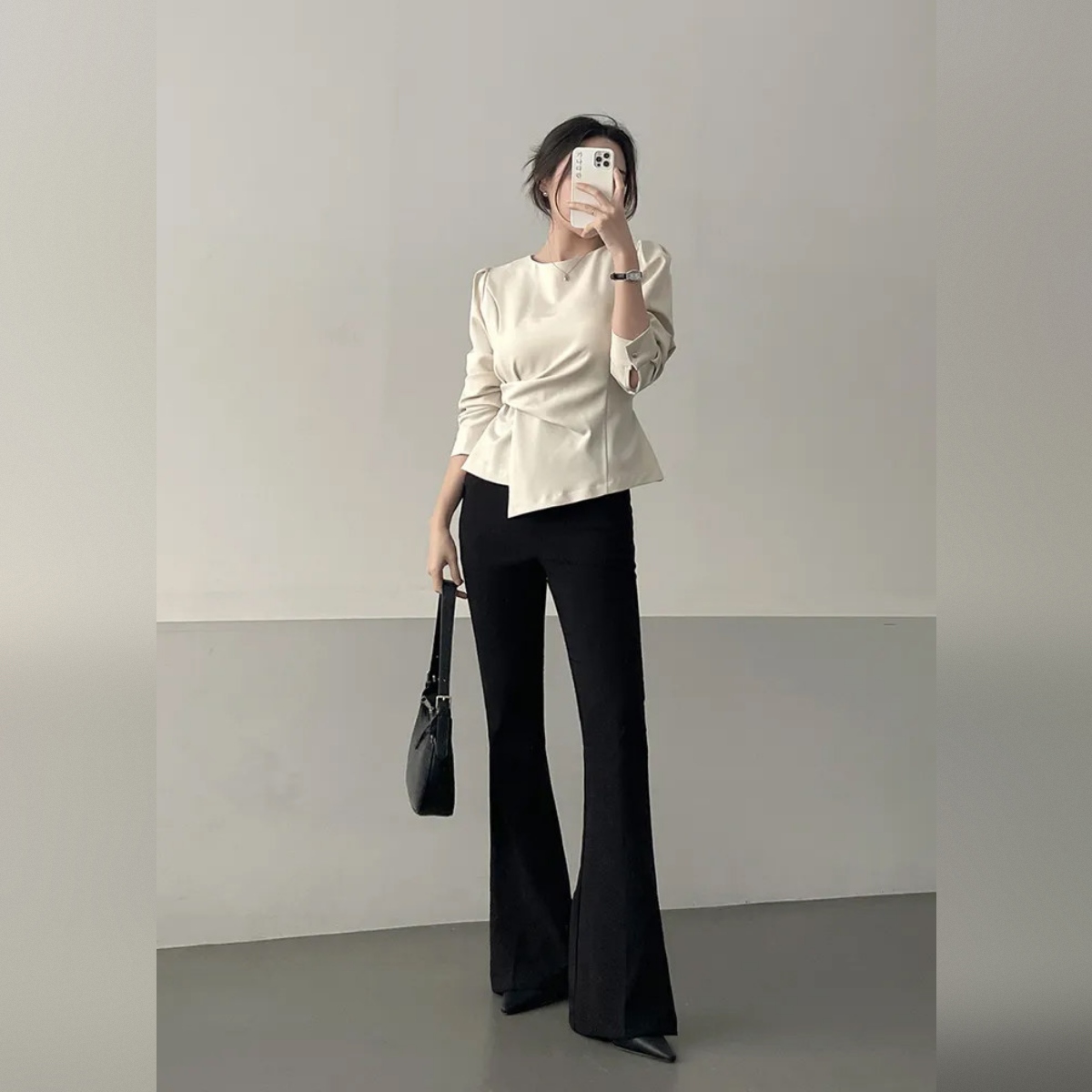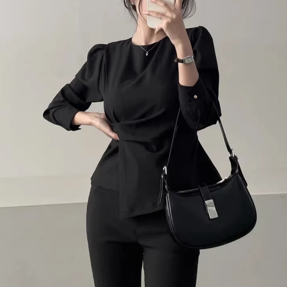 着るだけでスタイルアップ。骨格ウェーブさんのための本命ブラウスです。 フロントの変形ドレープが自然に高い位置でウエストをマークし、着るだけで驚きの脚長効果と細見えを叶えます。 寂しくなりがちな上半身は、上品なパフスリーブで華奢さを活かしつつ華やかにカバー。韓国風の洗練されたとろみ素材が、ウェーブさんの柔らかな肌質にベストマッチします。 裾を出しても決まるデザインなので、気になるお腹周りもさりげなくカバー。マーメイドスカートやスラックスと合わせれば、洗練された大人のお姉さんコーデが即完成します。オフィスからデートまで頼れる、スタイルアップ必須の一枚です。