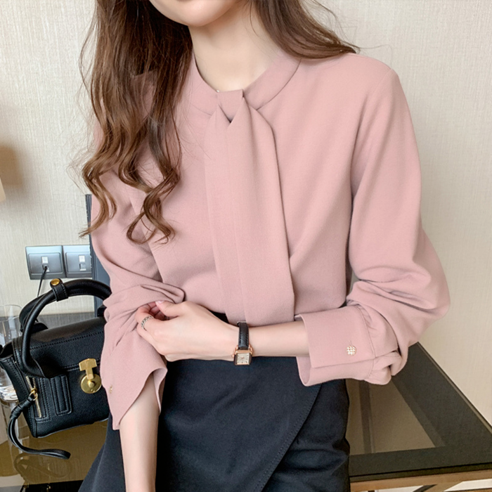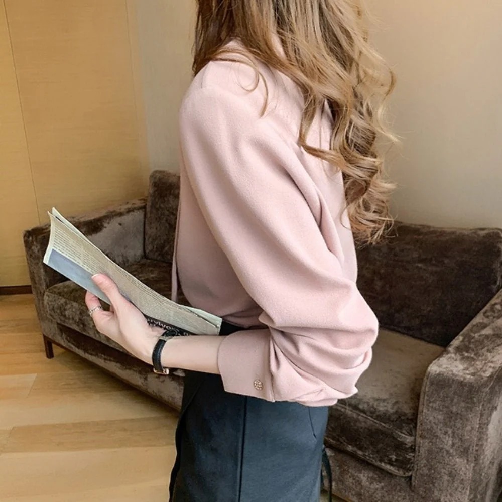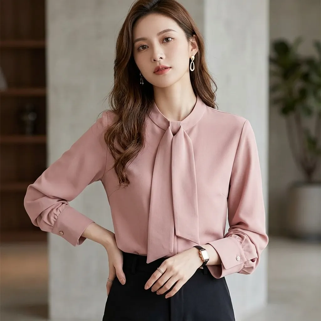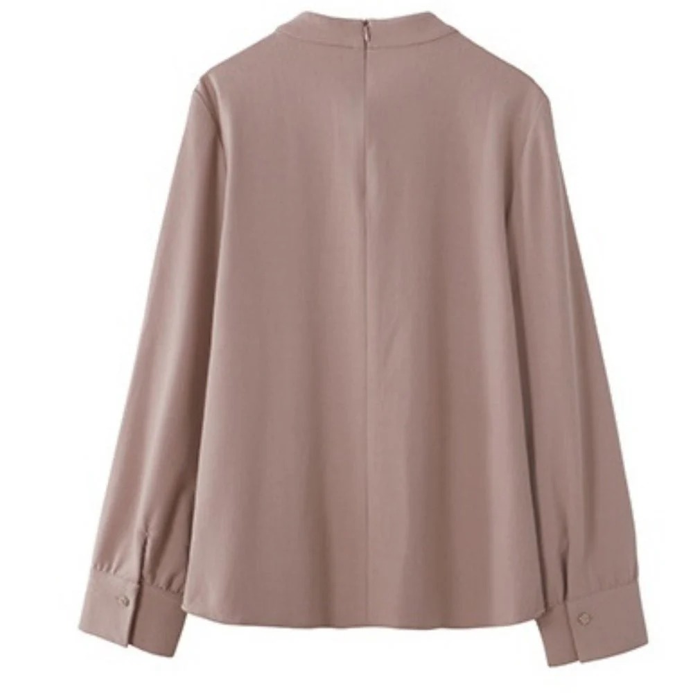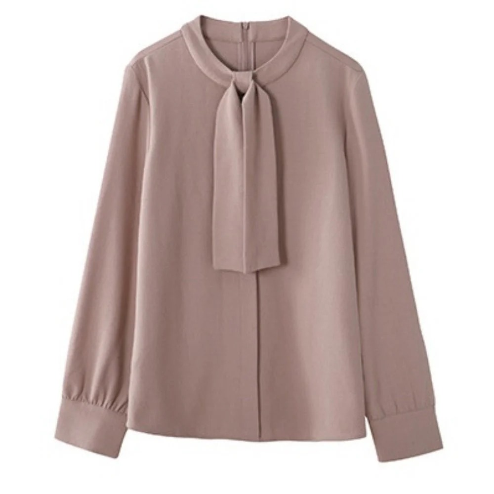 骨格ウェーブの肌を美しく見せる、上品なくすみピンクのタイネックブラウス。