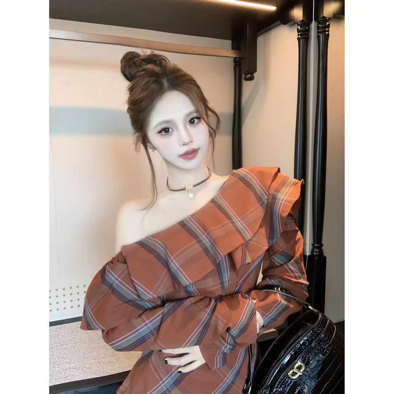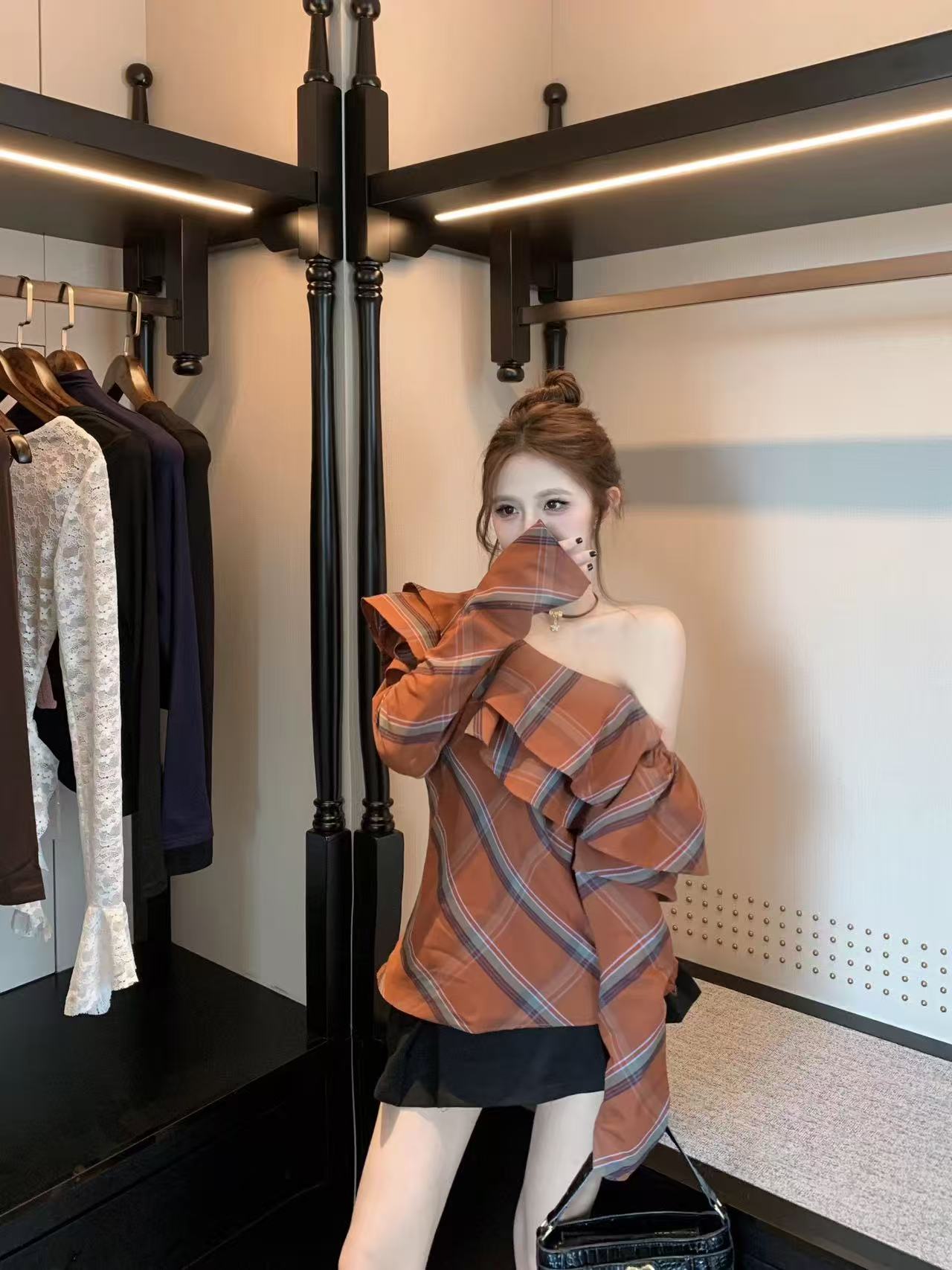 レトロなチェック柄の斜め肩シャツは、可愛さとスタイリッシュさを兼ね備えた一着です。初秋らしいフリルデザインとユニークなチェック柄が目を引き、前身頃の斜め肩ラインが上品な印象を演出します。デートやお出かけ、カジュアルな日常使いまで幅広く活躍し、多彩なコーディネートに対応。特別感のあるデザインで、ワードローブに加えると毎日のスタイルがぐっと洗練されます。