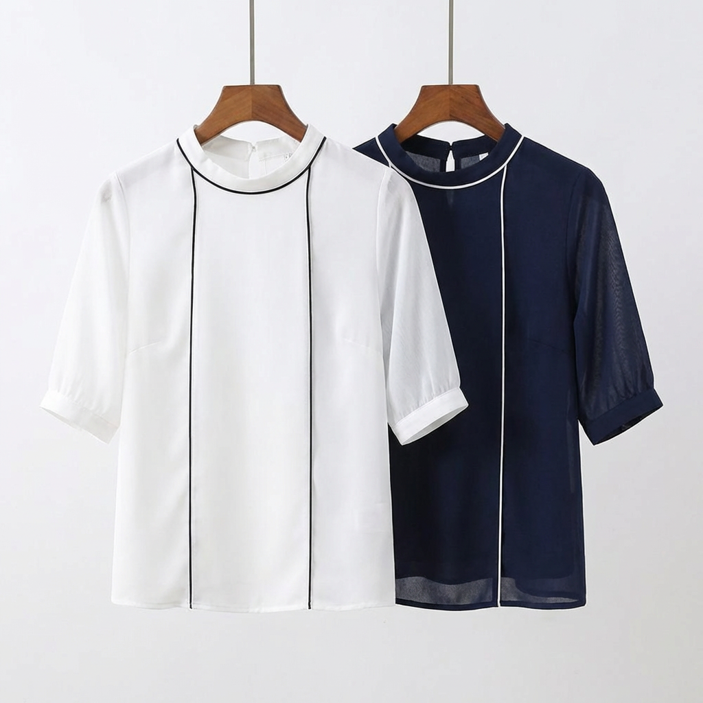 首元とフロントのパイピングが縦ラインを強調し、自然と視線を上へ導くことでスタイルアップを実現します。