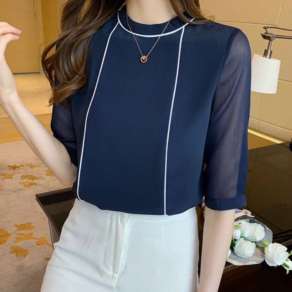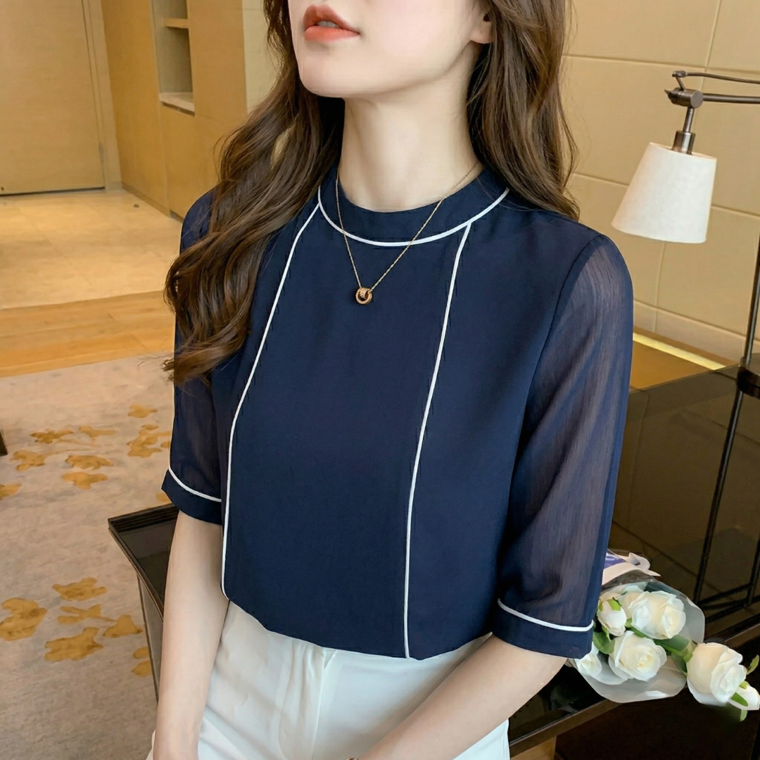 骨格ウェーブ 華奢見せ シアー五分袖ブラウス