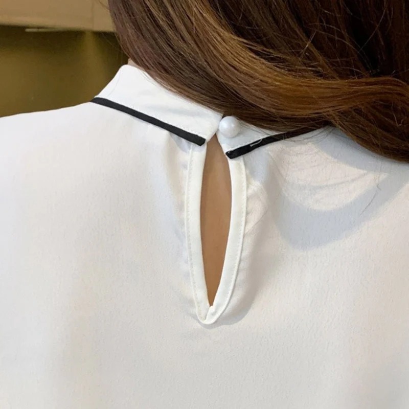 首元をやさしく包むハイネックと、縦に伸びる繊細なパイピングが、自然と視線を上へ導きます。