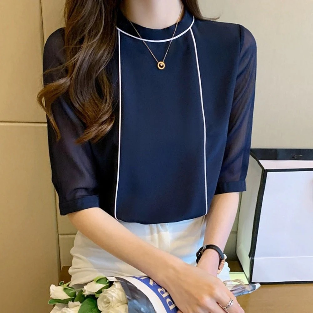 ハイネックがデコルテを上品にカバーし、シアー素材の五分袖が軽やかな抜け感と女性らしさをプラス。